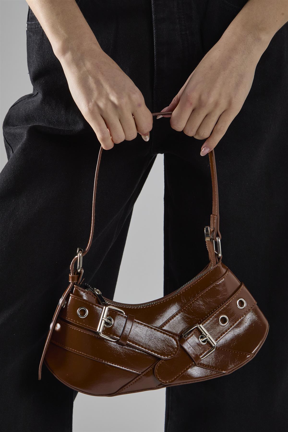 Glamorous Women's Brown Buckle Shoulder-Bag. Say hello to your new favourite compact companion. This small shoulder bag packs a big style punch with its standout buckle detail, adding a touch of vintage-inspired flair to your everyday look.
