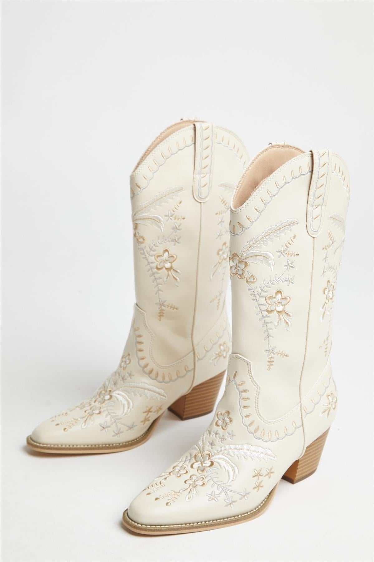 Glamorous Women's Cream Embroidered Cowboy-Boots. These dazzling cream-colored boots are sure to make you feel glamorous. Perfect for a statement-making western look, the boots feature beautiful embroidery that'll take your ensemble to the next level.