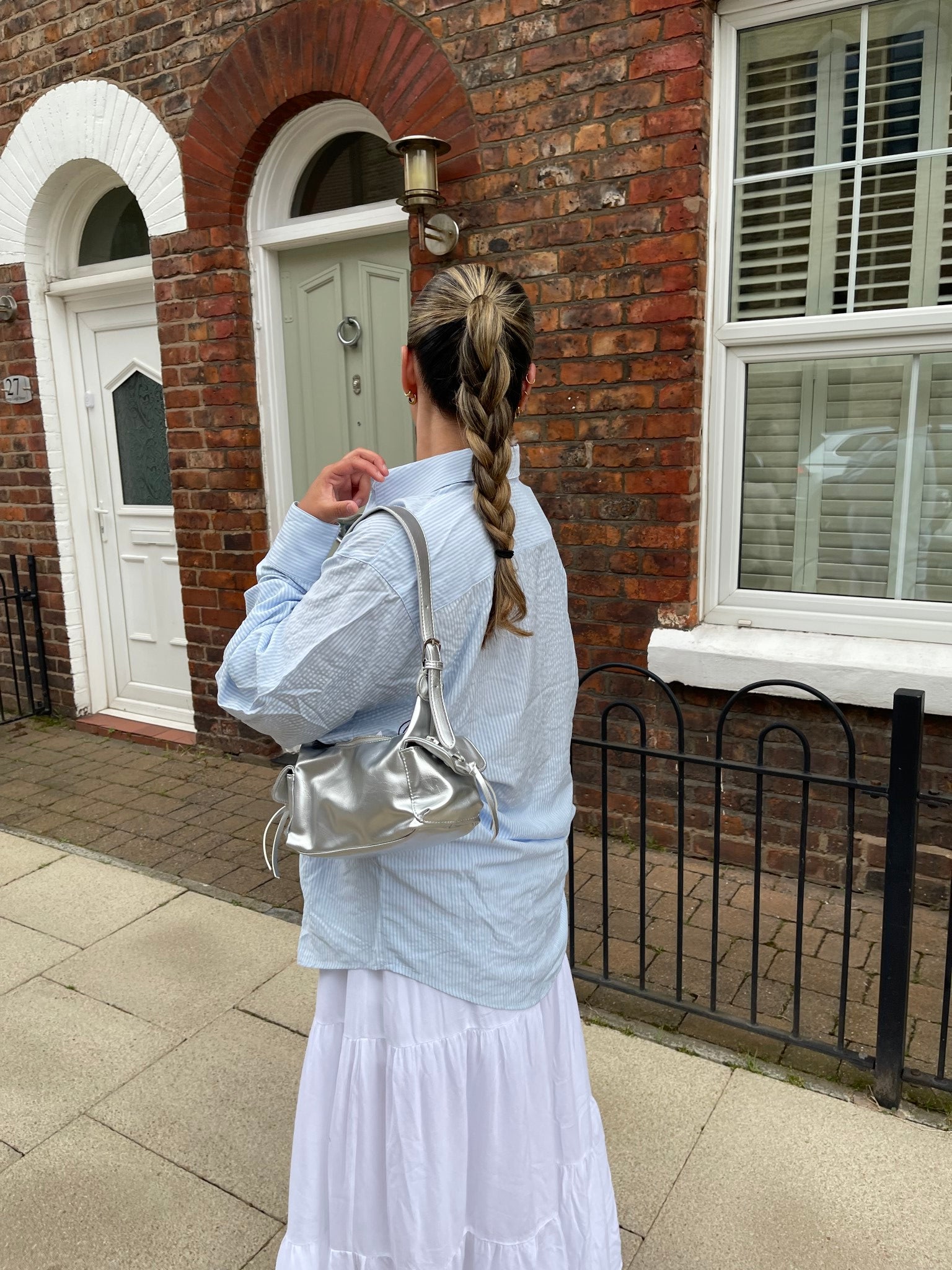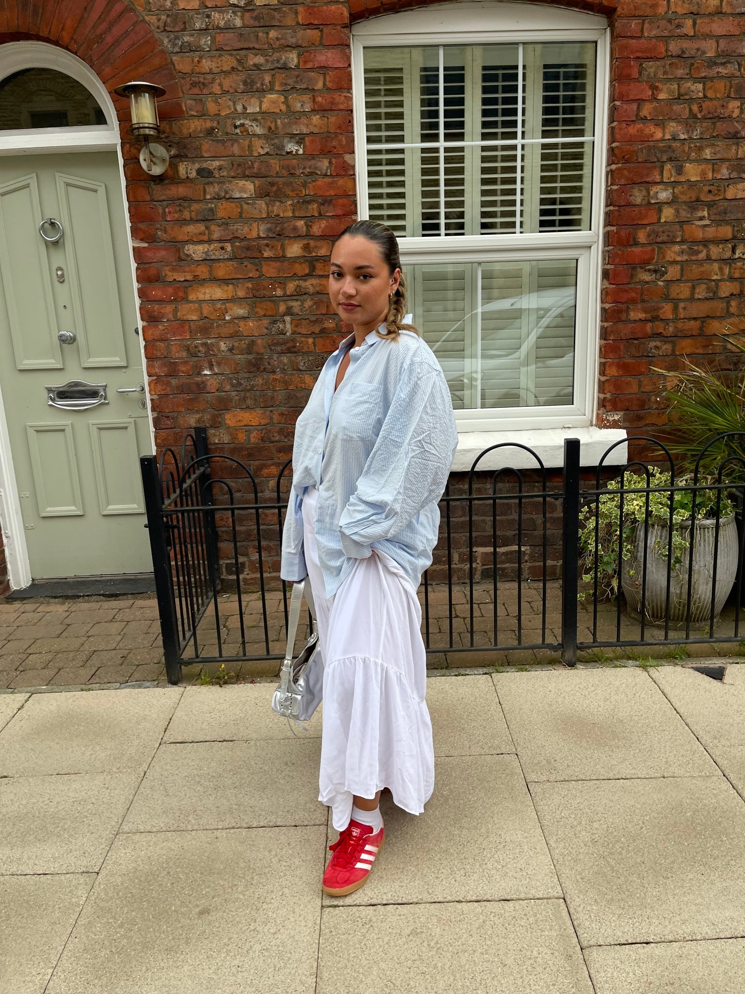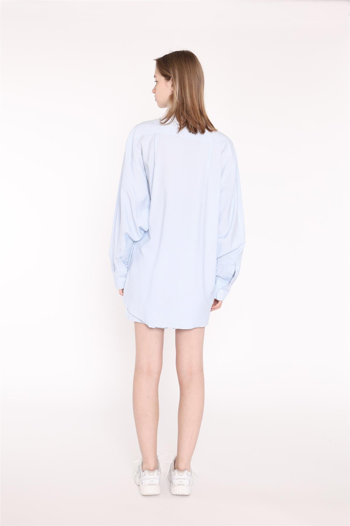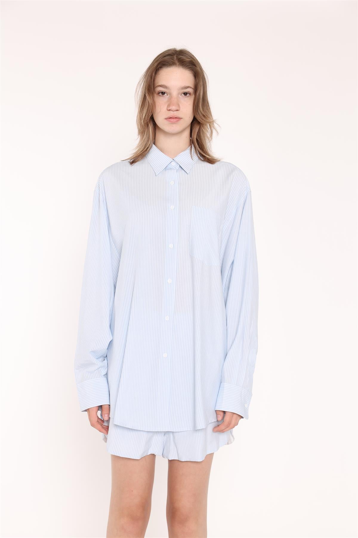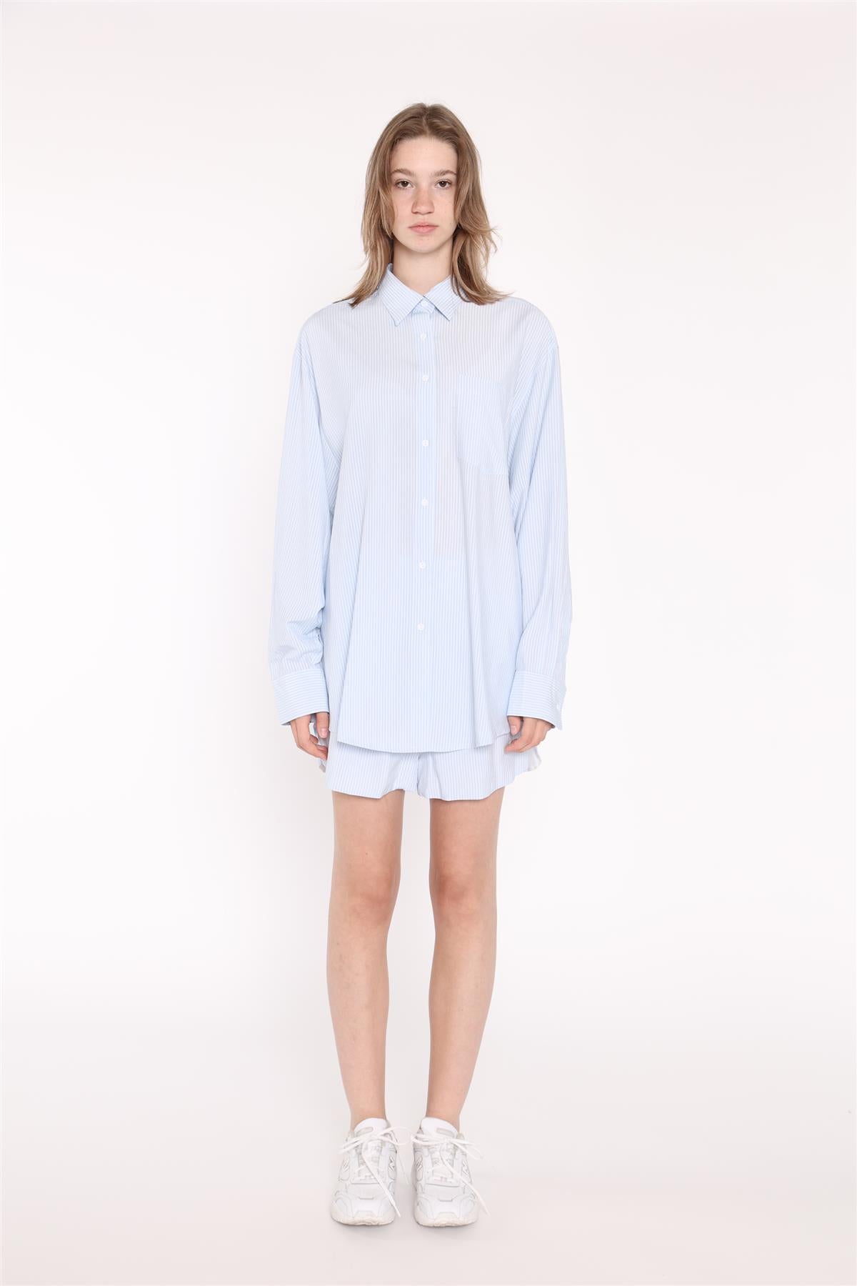 Glamorous Women's Light-Blue Stripe Classic Shirt. Effortless style meets timeless charm with our Light-Blue Stripe Classic Shirt. Crafted with a traditional silhouette, this button-front shirt features long cuffed sleeves and a collared neckline. The subtle striped pattern in cool blue hues adds a refreshing touch to your wardrobe. Versatile and comfortable, this classic piece seamlessly transitions from casual outings to smart-casual occasions. Elevate your look with a touch of understated elegance.