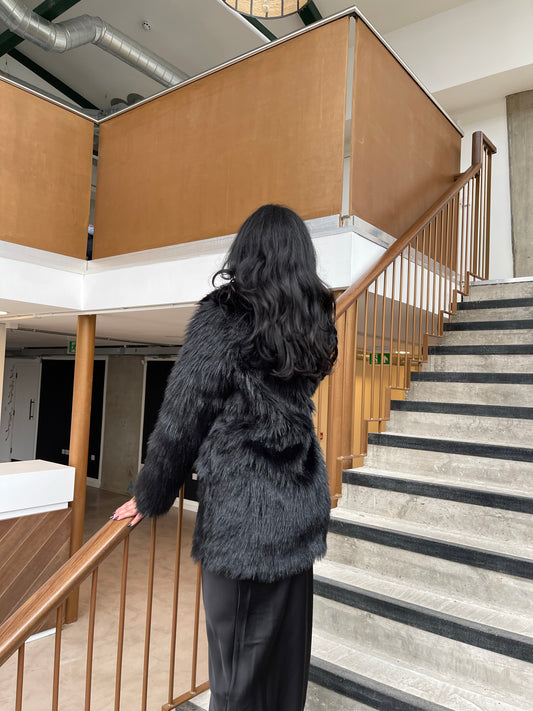 Glamorous Black Cream Long Shearling Seamed Coat with Collar