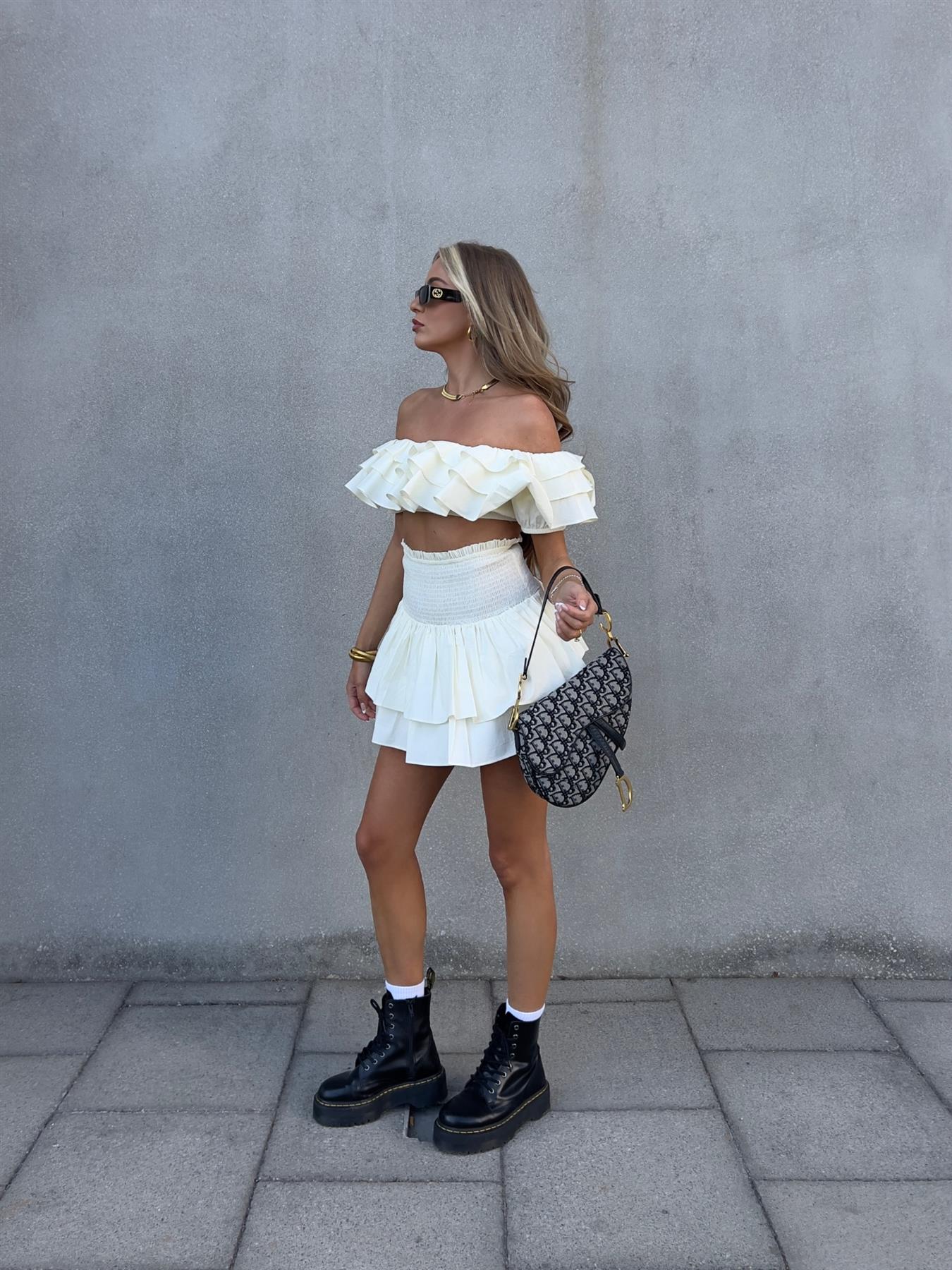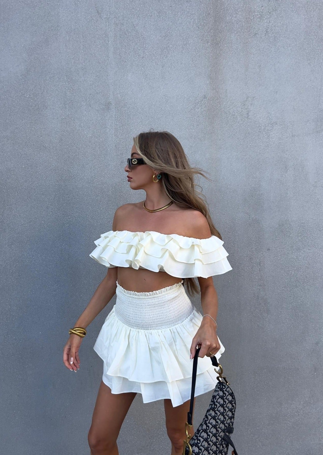 Collective the Label Women's Arabella Co-ord Bardot Ruffle Crop Top - Cream. Introducing the Arabella Co-ord! This adorable coordinated look creates the perfect look for brunch with the girls. The tiered, multi ruffle layers and bardot neckline create a playful twist to an otherwise boring crop top. Pair perfectly with the matching rara skirt, for the ultimate day to night look.