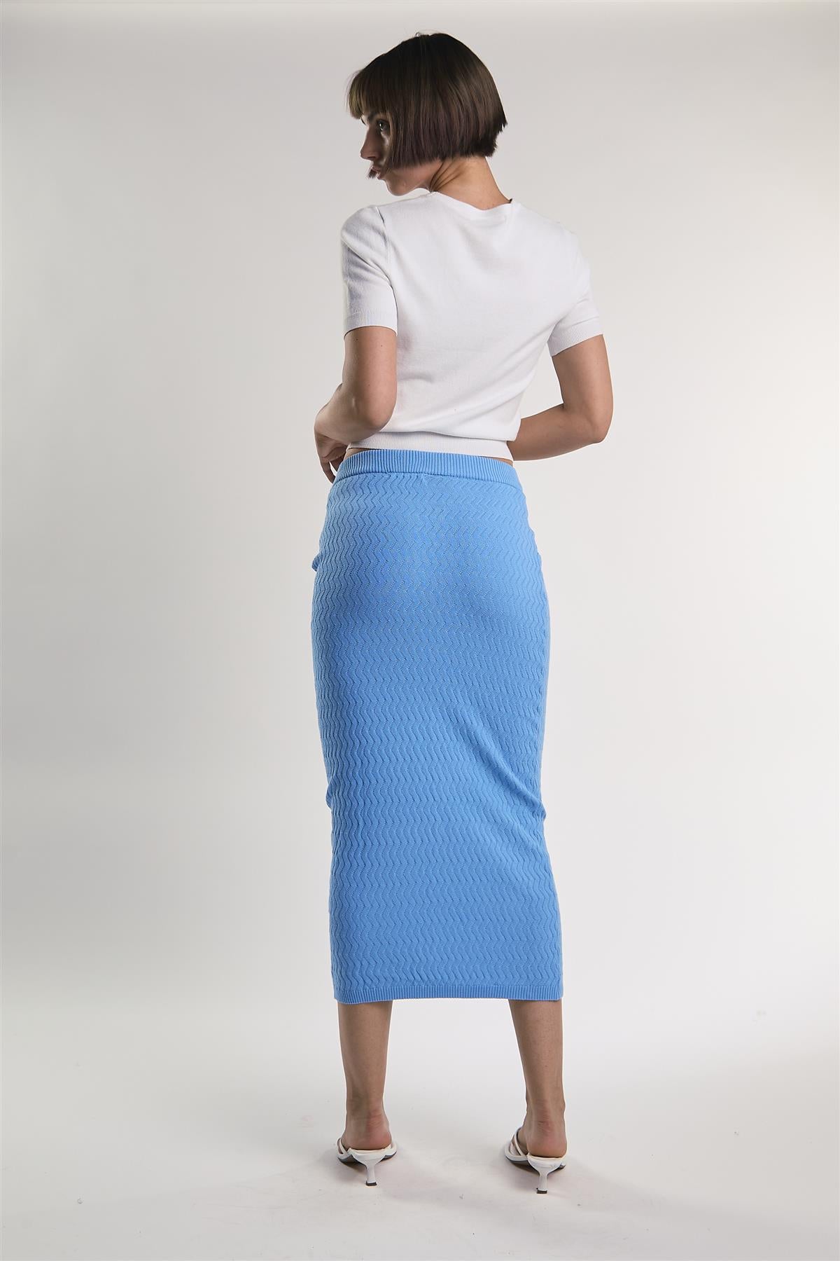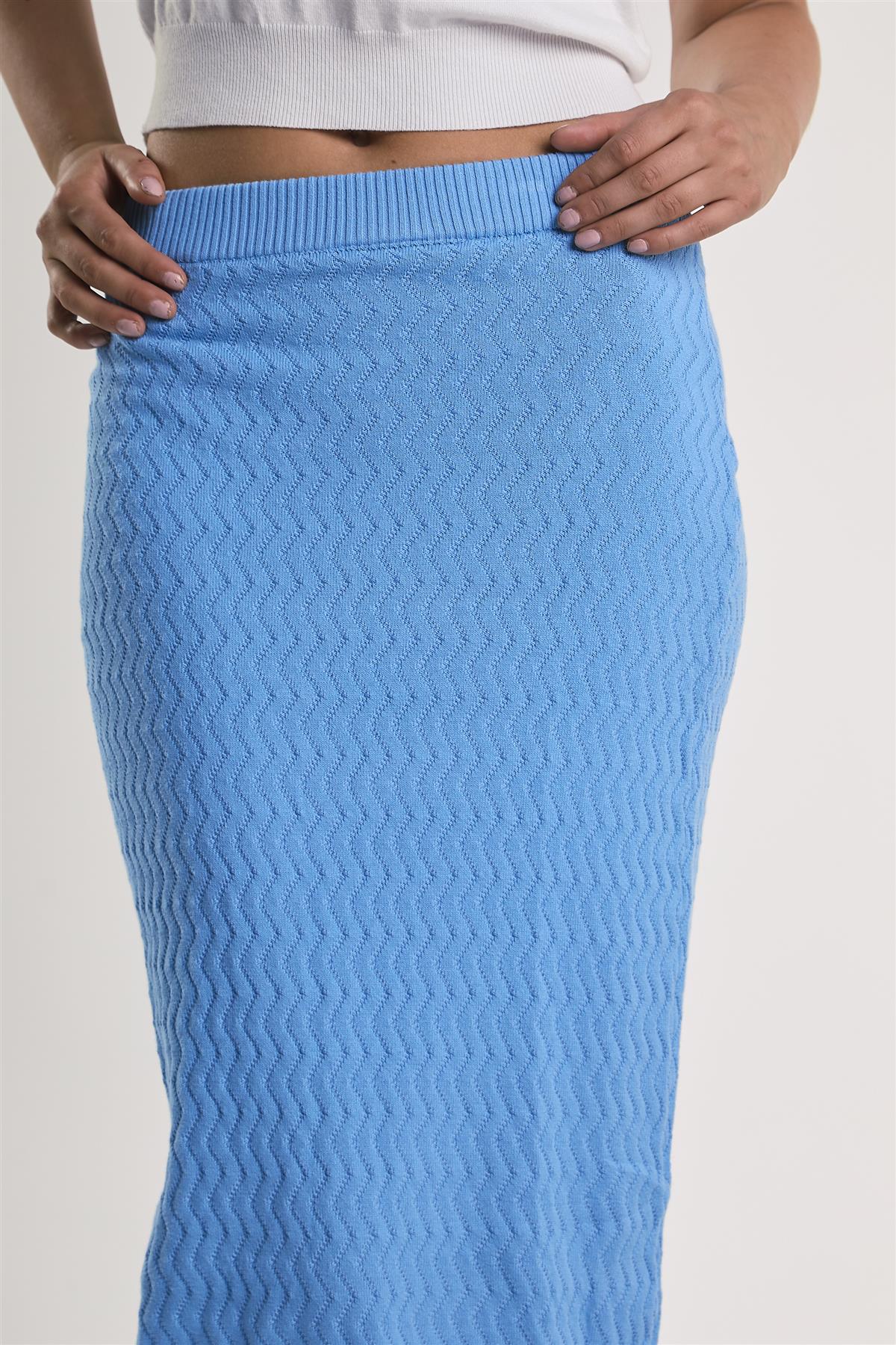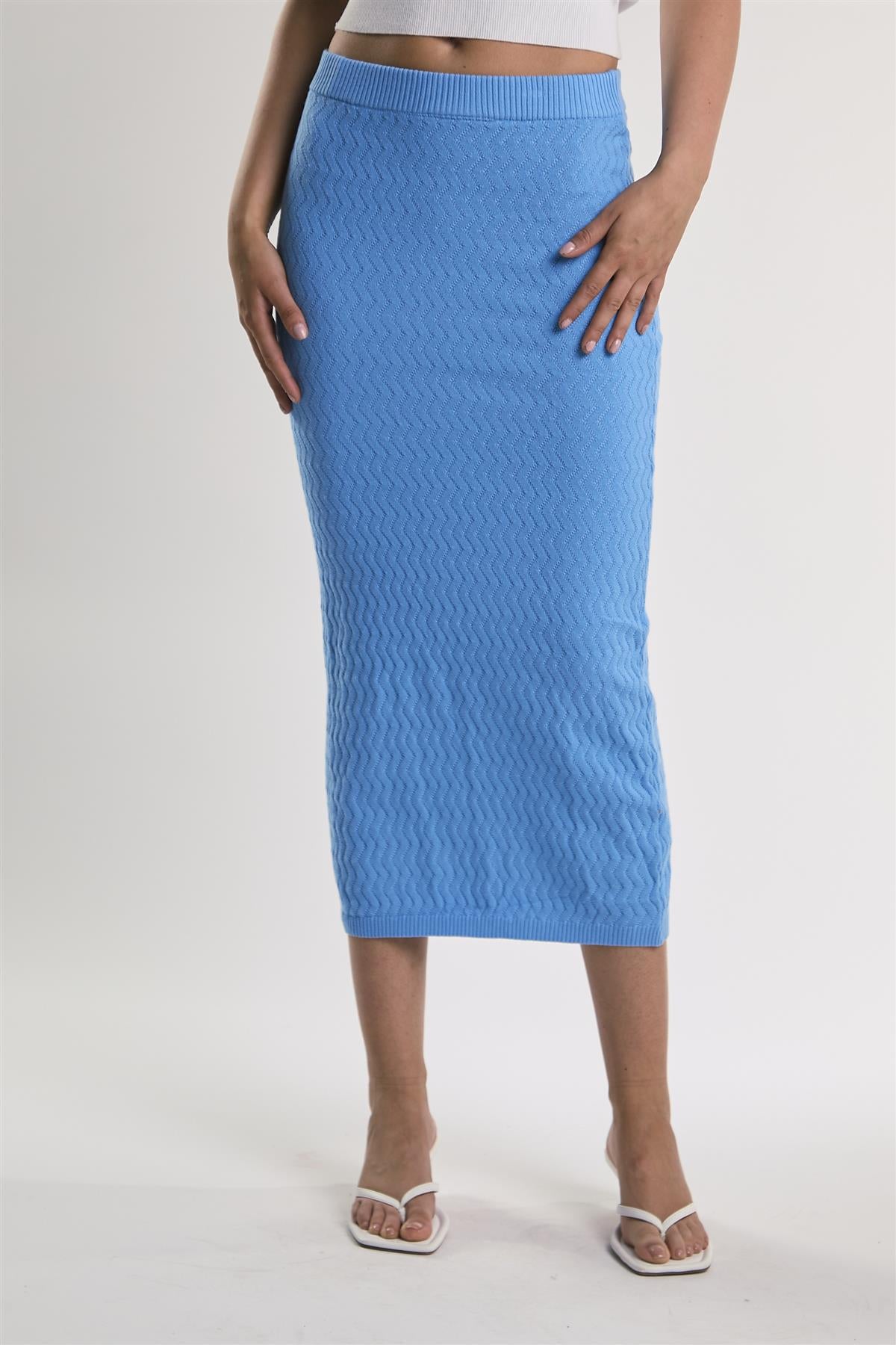 Glamorous Women's Azure-Blue Textured-Knit Midi-Skirt. This textured-knit midi skirt brings in comfort without losing its shape, thanks to the high waist and easy elasticated waistband. The fabric has a soft stretch and just enough texture to keep things visually interesting without being loud. A ribbed hem adds a subtle finish that helps the skirt fall neatly, giving it that no-fuss flow from waist to hem. It’s a great in-between piece—simple enough to wear on a casual day, but styled enough to hold its own with a matching knit top or a crisp button-up. It moves with you, sits comfortably, and feels easy to pair with your usual favourites. Just throw it on and let it do its thing