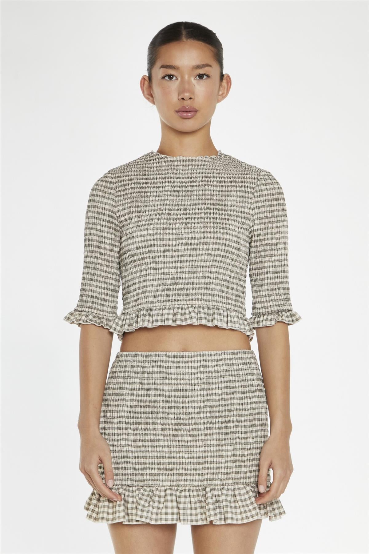 Glamorous Women's Beige-Black Check Shirred Mini-Skirt. Snuggle up in style this autumn with our Beige-Black Check Shirred Mini-Skirt! This playful piece blends the classic charm of a check pattern with the flattering shirring detail, creating a figure-flattering silhouette. The frill hem adds a delightful touch of whimsy, while the mini length keeps you feeling confident and comfortable. Pair it with the matching top, your favourite tights and ankle boots for a chic, laid-back look that's perfect for the season. Whether you're running errands or meeting friends for coffee, this versatile skirt will have you feeling stylish and at ease. Embrace the cozy vibes of autumn with our Beige-Black Check Shirred Mini-Skirt!