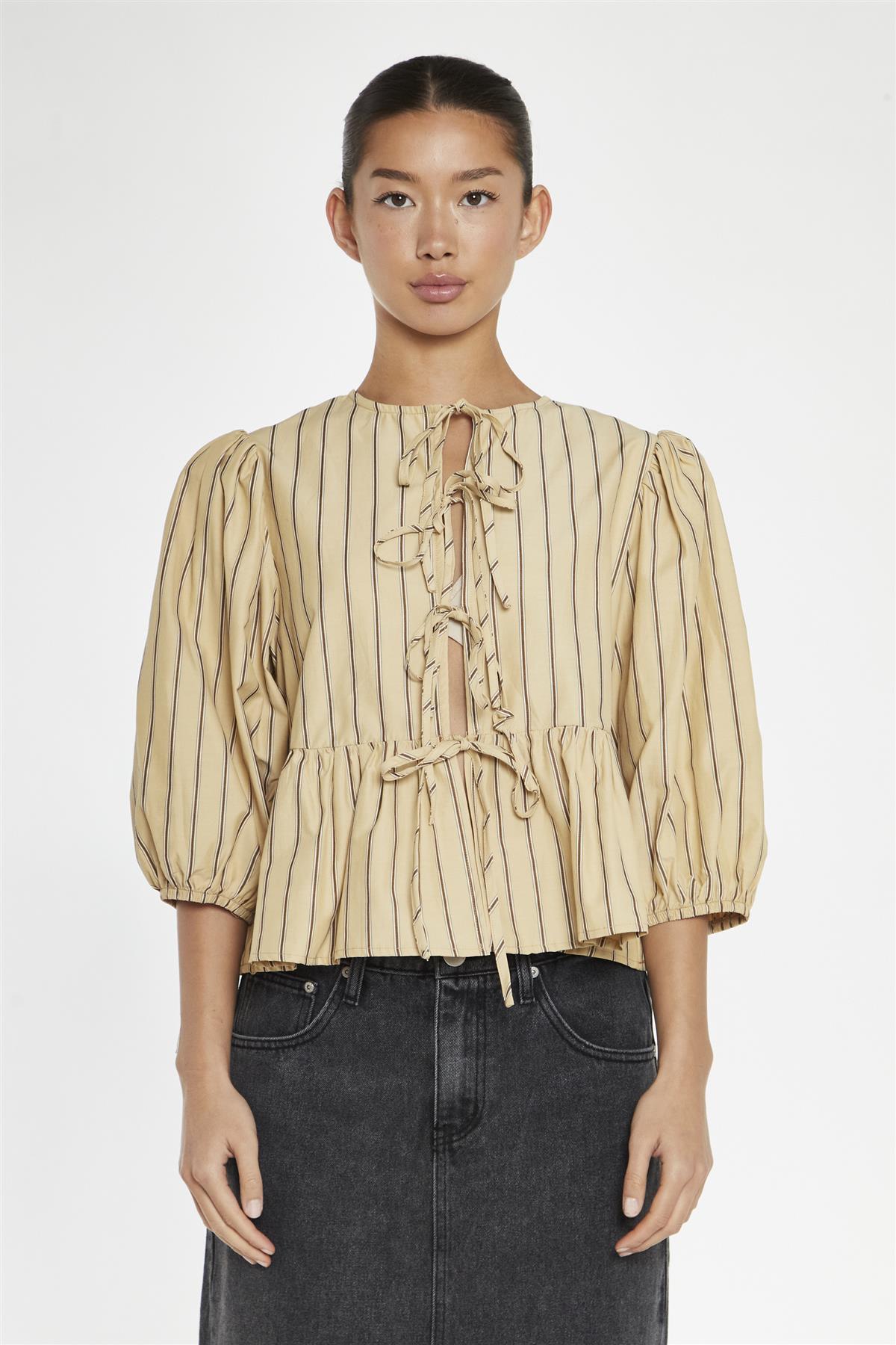 Glamorous Women's Beige-Brown Stipe Tie-Front -Top. Embrace your inner fashionista with our stunning Beige-Brown Stripe Tie-Front Top This versatile piece is perfect for any occasion, whether you're running errands or attending a chic event. The tie-front detail adds a touch of elegance, while the peplum silhouette flatters your figure. The puff sleeves add a playful twist, making this top a must-have in your wardrobe. Pair it with a flowy maxi skirt and sandals for a boho-chic festival look, or dress it with your favourite distressed denim shorts and ankle boots for a more relaxed vibe. The beige and brown stripes create a timeless and effortless pattern that will never go out of style. Feel confident and stylish in this top that is sure to turn heads wherever you go.