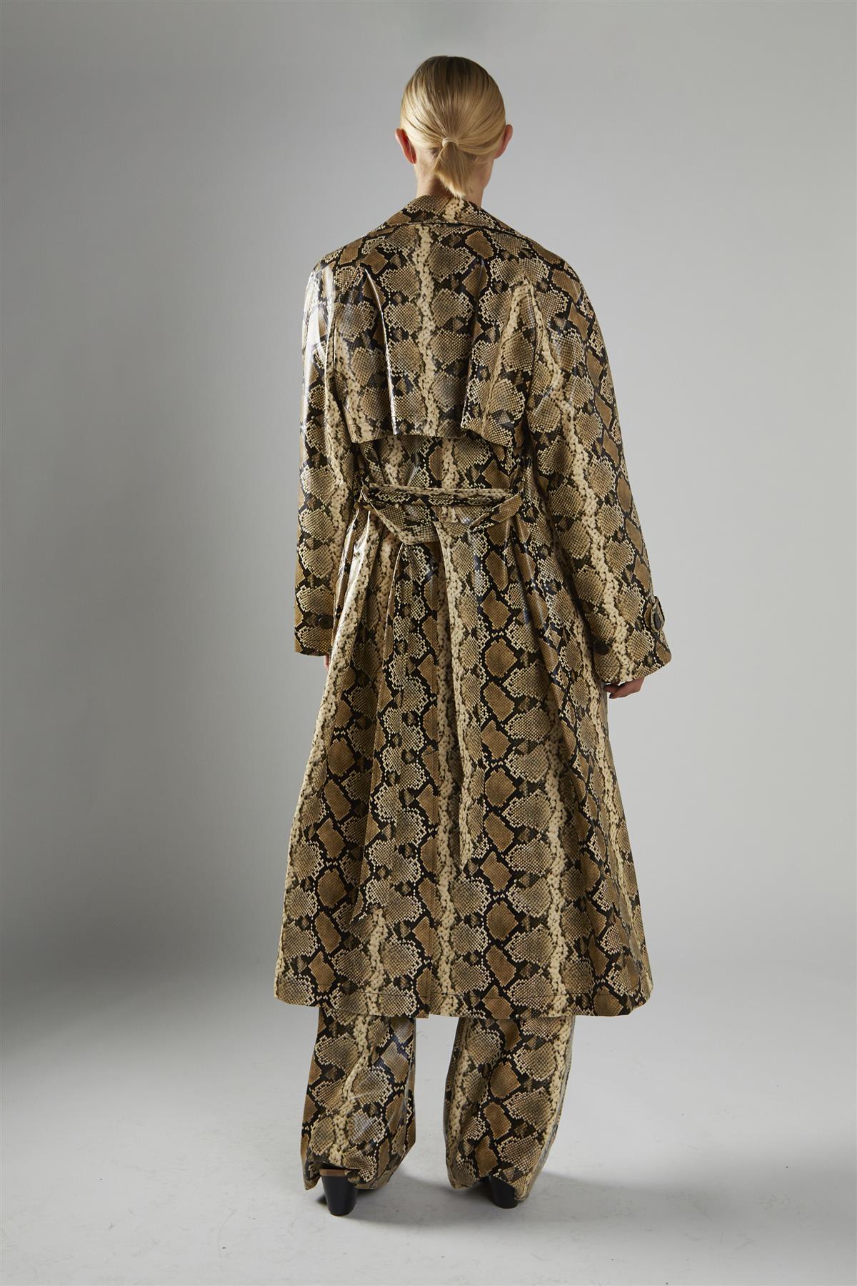 Glamorous Women's Beige-Snakeskin Double-Breasted Trench-Coat. This longline trench-coat brings a fresh attitude to classic outerwear, with its faux leather finish in a subtle snakeskin texture that adds just the right amount of edge. The double-breasted design gives you a tailored look, while the belted waist lets you play with the fit—cinch it in for a defined shape or leave it loose for a more casual feel. Its longer length offers extra coverage and a touch of drama, making it easy to layer over chunky knits or lighter tops as the seasons change. The soft faux leather feels comfortable and looks polished, so you can toss it on for an instant style boost. This coat is all about giving you options and confidence, making every outfit feel a bit more fun and put together with hardly any effort.
