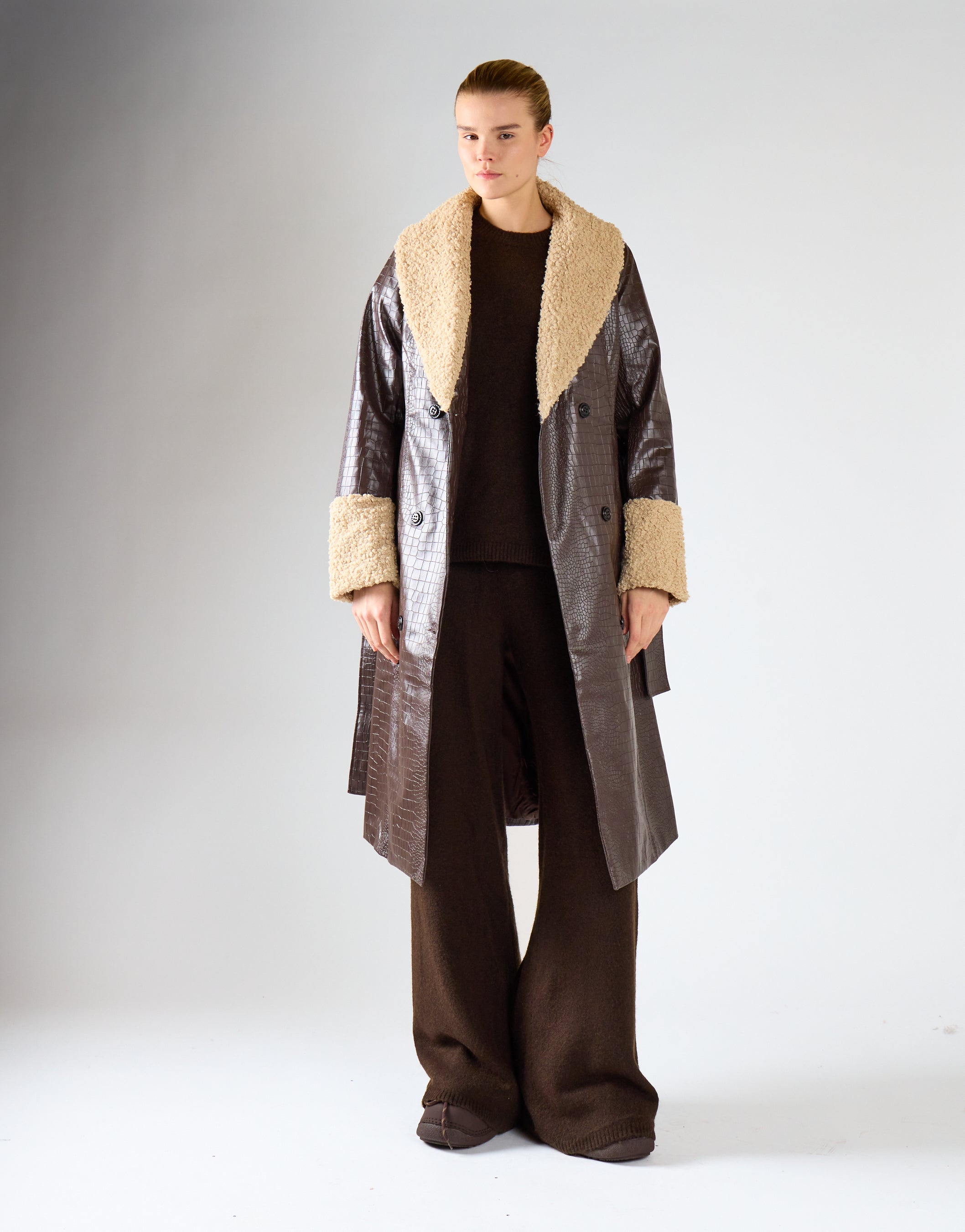 The lining of this coat is made from 100% Polyester, ensuring that it is comfortable to wear and wont irritate your skin. So why settle for boring outerwear? Add some style to your wardrobe with the Glamorous Black Ash Brown Double Breasted Belted Coat with Faux Fur Collar & Cuff Trim today!