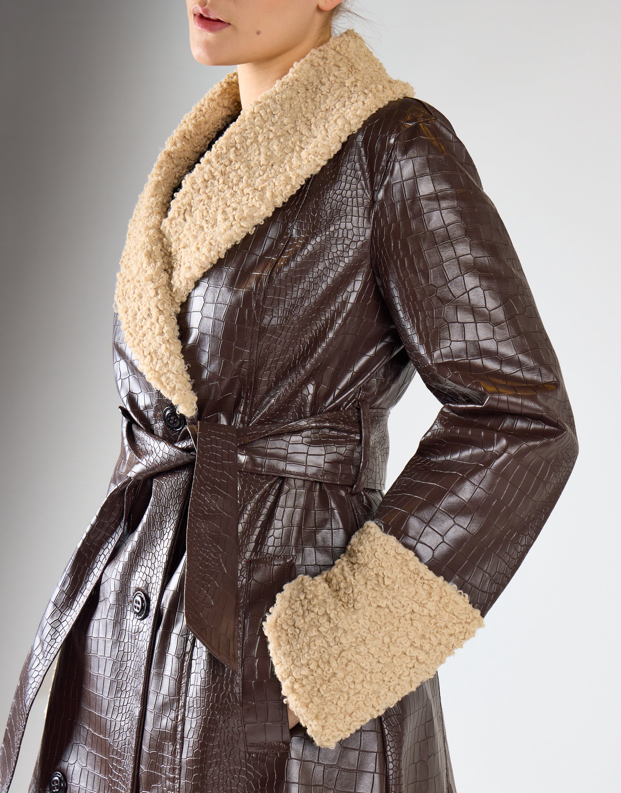 The double-breasted design of this coat adds a classic touch, while the belted waist helps to cinch in your figure and create a flattering silhouette. The faux fur collar and cuff trim add a touch of glamour, making this coat perfect for any occasion.