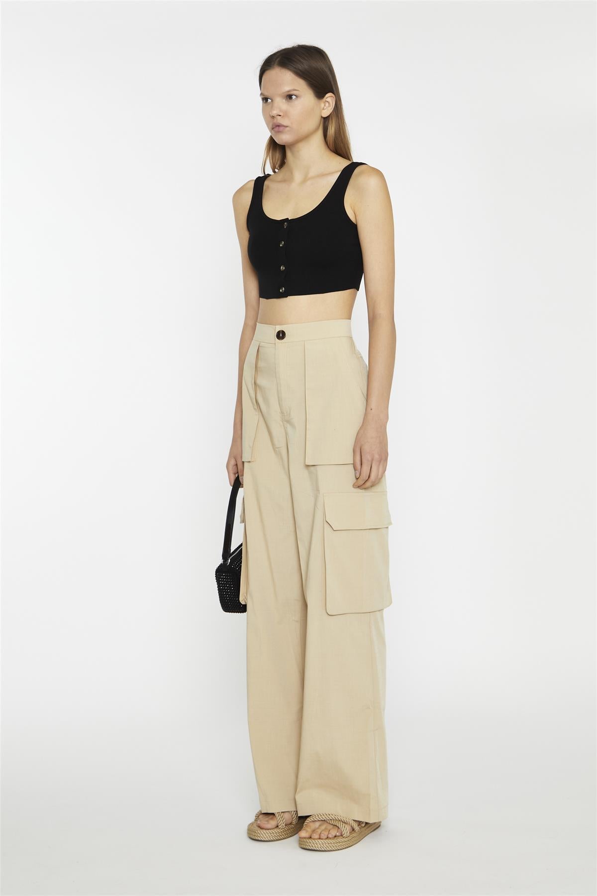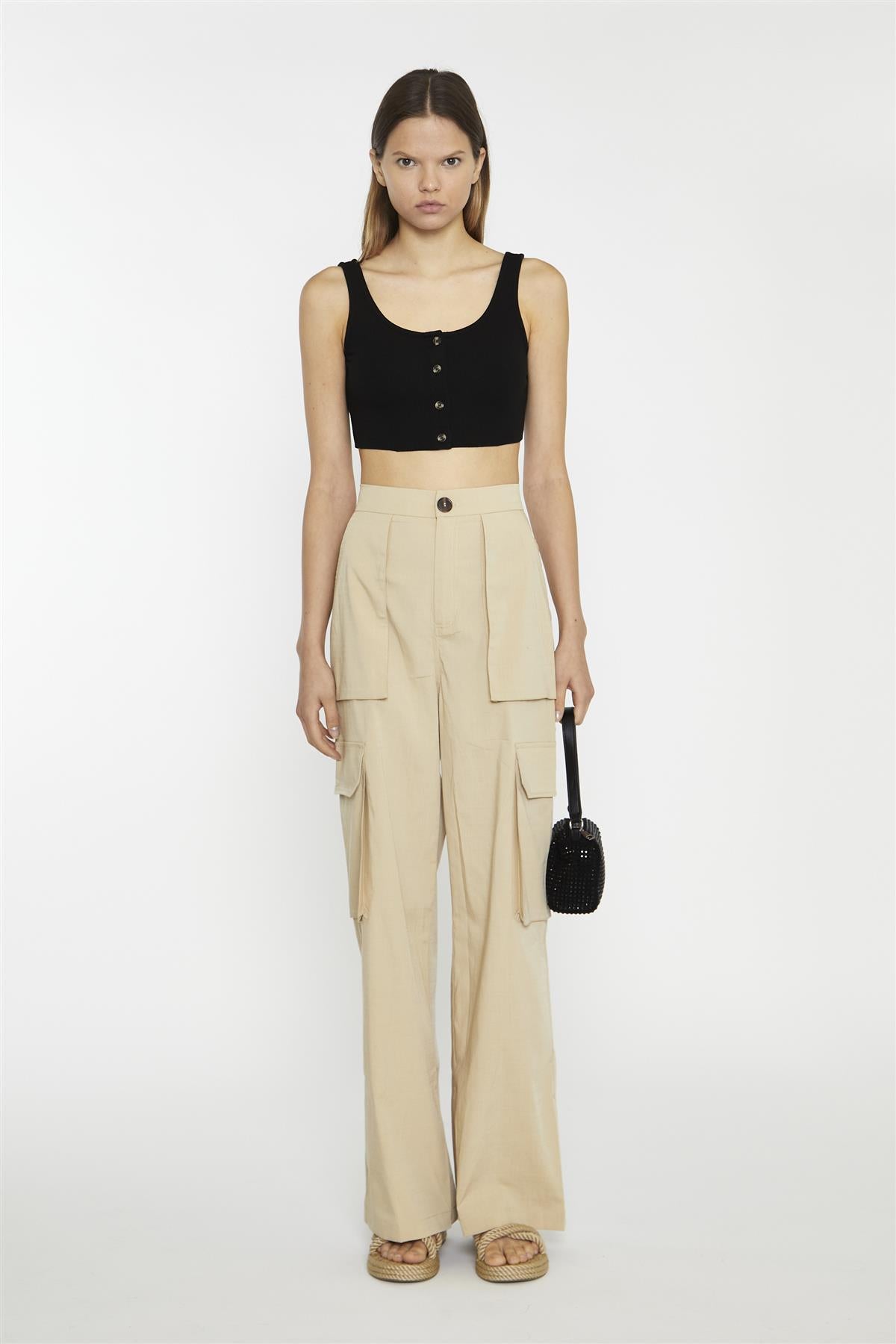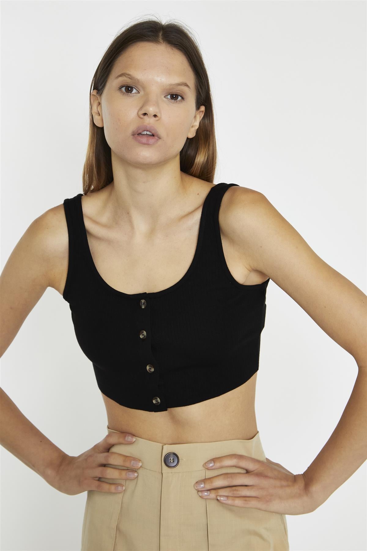 Glamorous Women's Black Button-Front Crop-Top. This flirty crop top is a versatile addition to your wardrobe, offering a blend of classic style and modern flair. The button-front design adds a touch of vintage charm, while the cropped length keeps it contemporary and trendy. Its sleeveless cut is ideal for warm days and showcases your arms beautifully. The scoop neck frames your décolletage in a flattering manner, making it suitable for various occasions. Pair this top with high-waisted jeans for a casual day out, or team it with a midi skirt for a more polished look. Layer it under a blazer for a chic office ensemble, or wear it over a fitted turtleneck for cooler weather. The neutral hue allows for endless styling possibilities, making it easy to mix and match with your existing wardrobe. This crop top is sure to become a staple in your collection, offering both comfort and style in one charming package.