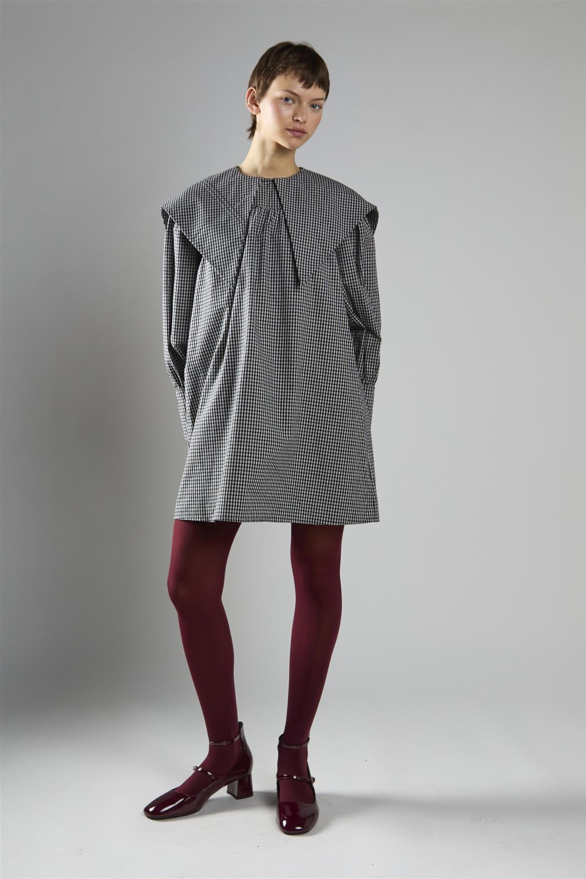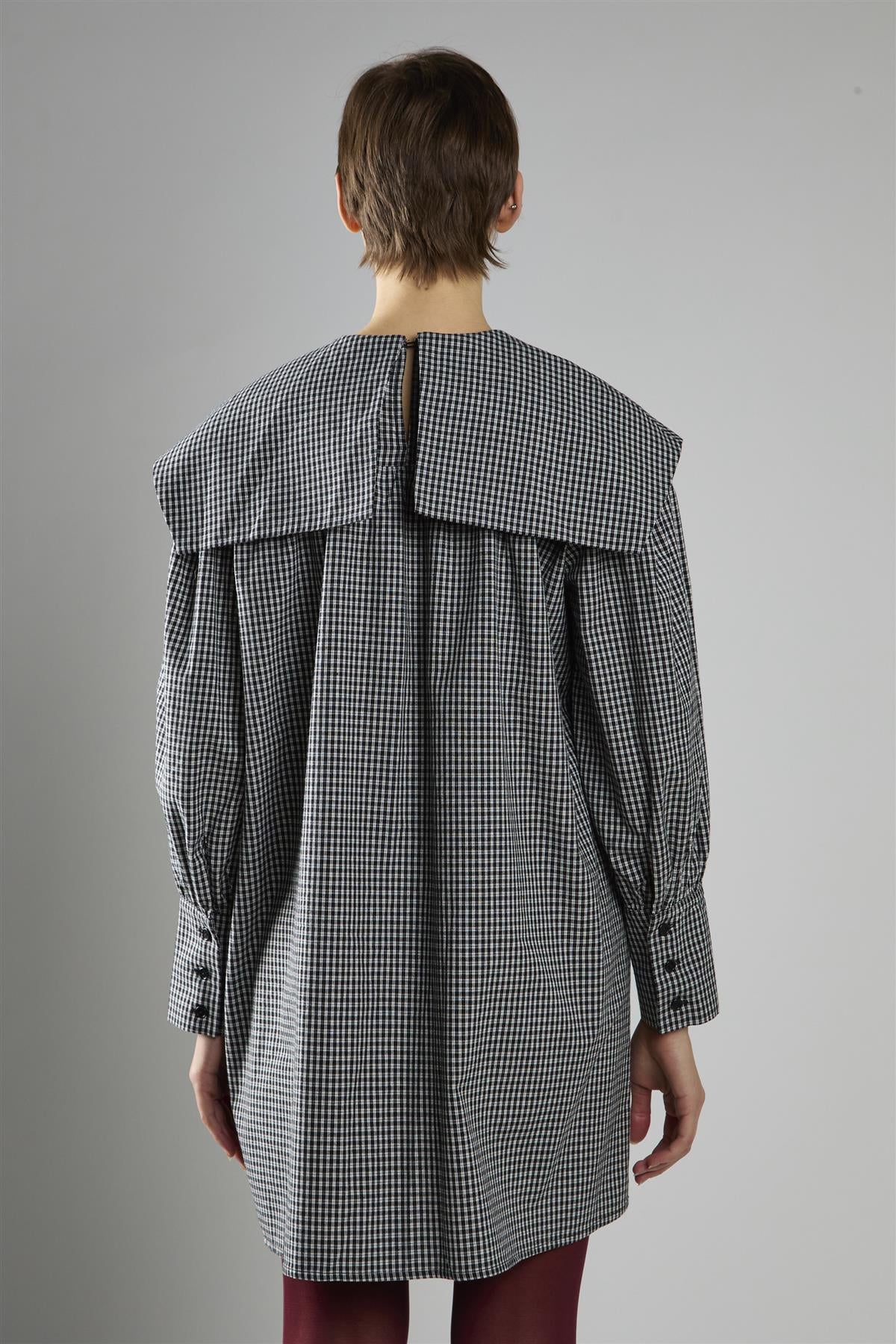 Glamorous Women's Black Check Oversized Collar Mini Dress. Make a bold yet playful statement with the Oversized Collar Mini Dress, crafted to give your wardrobe an instant style boost. The mini length creates a confident, youthful feel, while the oversized collar adds a standout detail that draws the eye and sets this piece apart. Long sleeves balance the silhouette with a touch of refinement, and the button fastening at the back keeps the design clean and easy to wear. Perfect for when you want something simple but striking, this dress pairs beautifully with contrast tights and loafers for a look that feels fresh, polished, and full of character.