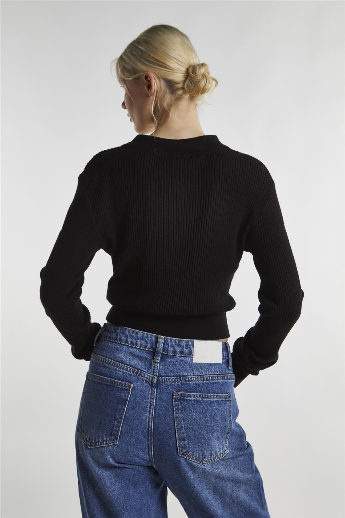 Glamorous Women's Black Collared Button Up Long-Sleeve-Crop-Top. Meet the Black Collared Button Up Long-Sleeve Crop Top, a versatile piece that effortlessly combines comfort and style. This top features a classic button front that adds a polished touch, making it easy to dress up or down for any occasion. The ribbed texture gives it a cozy feel while enhancing the overall fit, ensuring you look great without sacrificing comfort. With its cropped length, this top pairs beautifully with high-waisted jeans or a flowy skirt for a balanced silhouette. Layer it under a blazer for a chic office look or wear it with your favourite joggers for a relaxed weekend vibe. This crop top is all about making you feel confident and stylish every day.