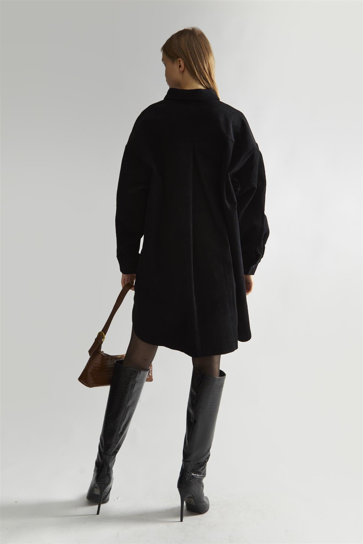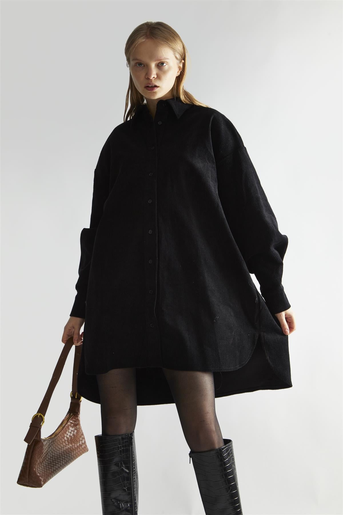 Glamorous Women's Black-Corduroy Hi-Low Shirt-Dress. Meet your new favourite fall staple: the black corduroy mini-collared dress that's as cozy as it is stylish. This charming piece brings together the best of comfort and fashion, with its soft corduroy fabric that's perfect for cooler days. The mini length keeps things playful, while the collared design adds a touch of polish. Long sleeves offer warmth and versatility, making this dress a great choice for layering or wearing on its own. The plisse detailing adds a unique texture and movement to the dress, giving it a subtle flair that sets it apart from your average shirt dress. The hi-low hemline adds an interesting silhouette, providing a bit more coverage in the back while keeping the front short and sweet. It's the kind of dress that works hard in your wardrobe - pair it with tights and boots for a cute autumn look, or throw on some sneakers for a more casual vibe. The black colour makes it easy to accessorize, so you can dress it up or down depending on your mood. This corduroy mini dress is like a warm hug for your style - comfortable, versatile, and undeniably chic.