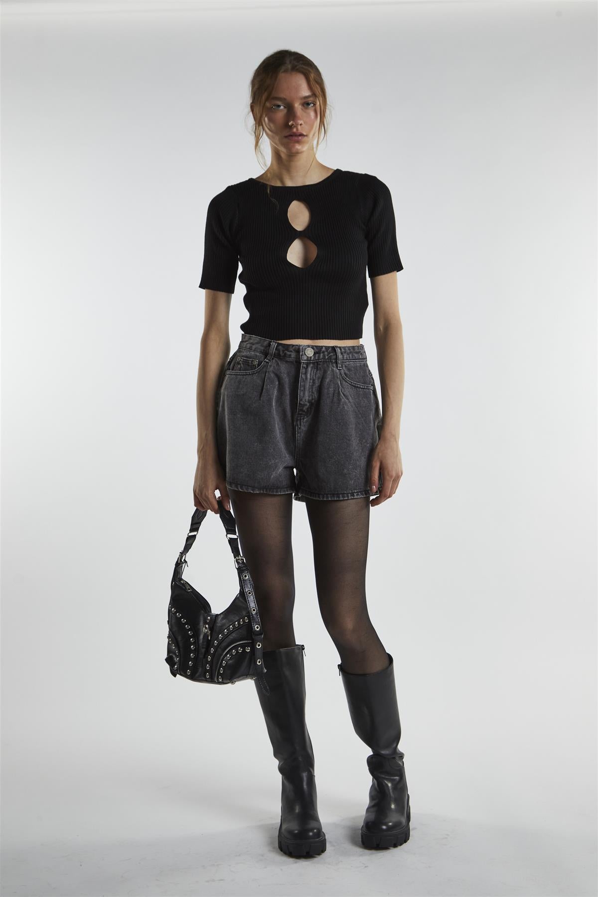 Glamorous Women's Black Cut-Out Crop-Top. This edgy crop top is the perfect blend of comfort and style. The ribbed texture adds a touch of interest while hugging your curves in all the right places. Its short sleeves and crew neck give it a classic silhouette, but the daring cut-out design takes it to a whole new level of cool. It's the kind of top that makes you feel instantly confident and ready to take on the world. The cropped length is just right - not too short, not too long - making it ideal for pairing with high-waisted bottoms. Wear it with your favourite jeans for a casual day out, or dress it up with a sleek skirt for a night on the town. The versatile nature of this top means it can easily transition from day to night with just a few accessory changes. Its soft, stretchy fabric ensures you stay comfortable no matter where your day takes you. This crop top is more than just a piece of clothing - it's a statement of your bold, fearless style.