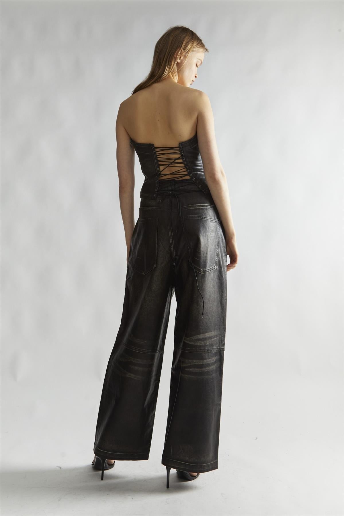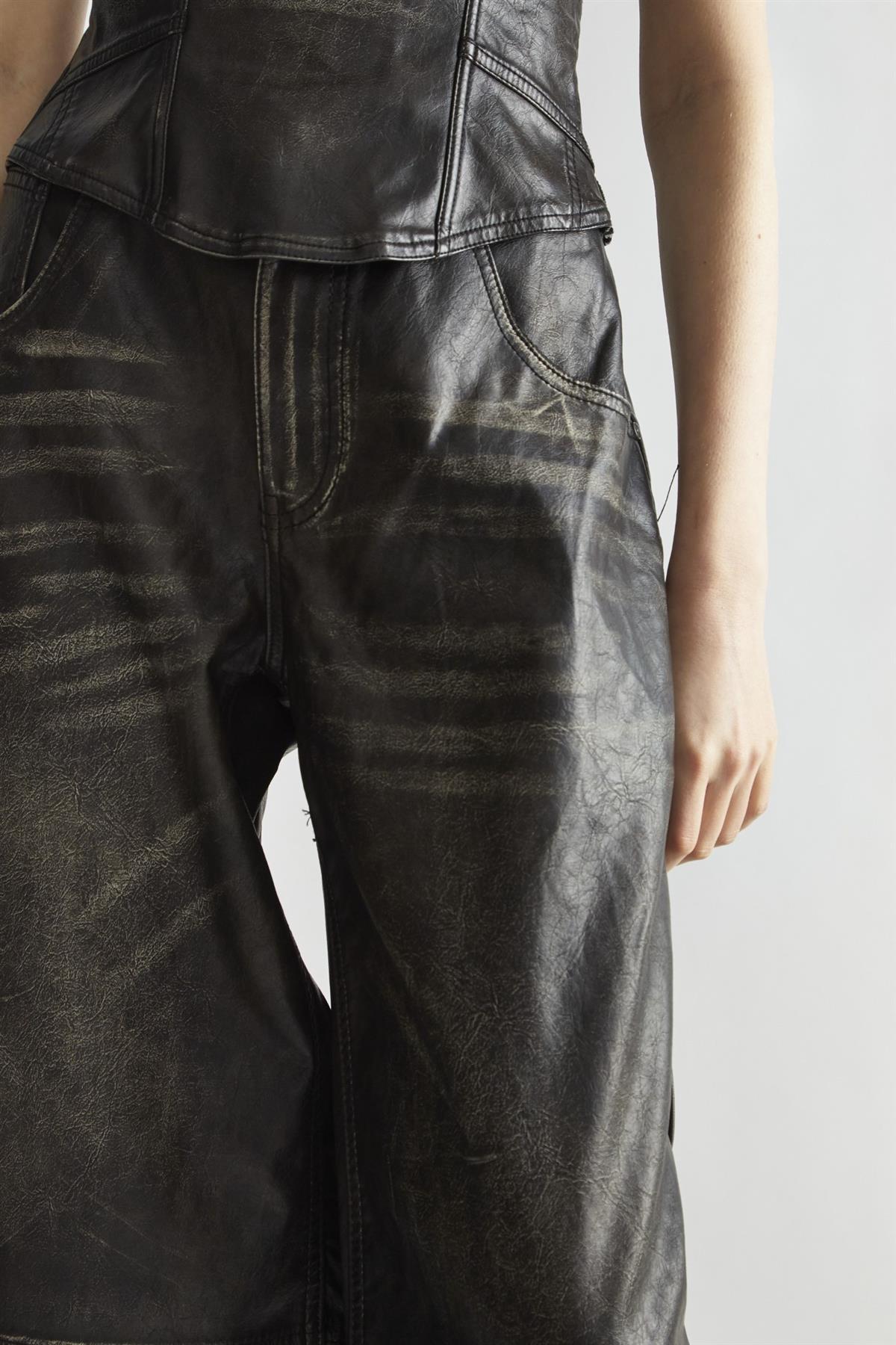 Glamorous Women's Black Distressed-PU Wide-Leg Trousers. Revamp your style with these striking black distressed-PU wide-leg trousers, a must-have for anyone looking to add a bit of edge to their wardrobe. Crafted from high-quality PU fabric, these trousers feature a unique distressed finish that brings a modern flair to your look. The wide-leg silhouette not only offers a relaxed fit but also creates a dramatic effect that pairs beautifully with a variety of tops. Style them with a fitted bodysuit to highlight your shape, or opt for an oversized graphic tee for a cool, laid-back vibe. Perfect for everything from casual outings to evening adventures, these trousers are designed for comfort and versatility. With their bold design and effortless style, you’ll find these trousers quickly becoming a go-to piece for making a statement wherever you go. Get ready to turn heads and express your unique fashion sense!.