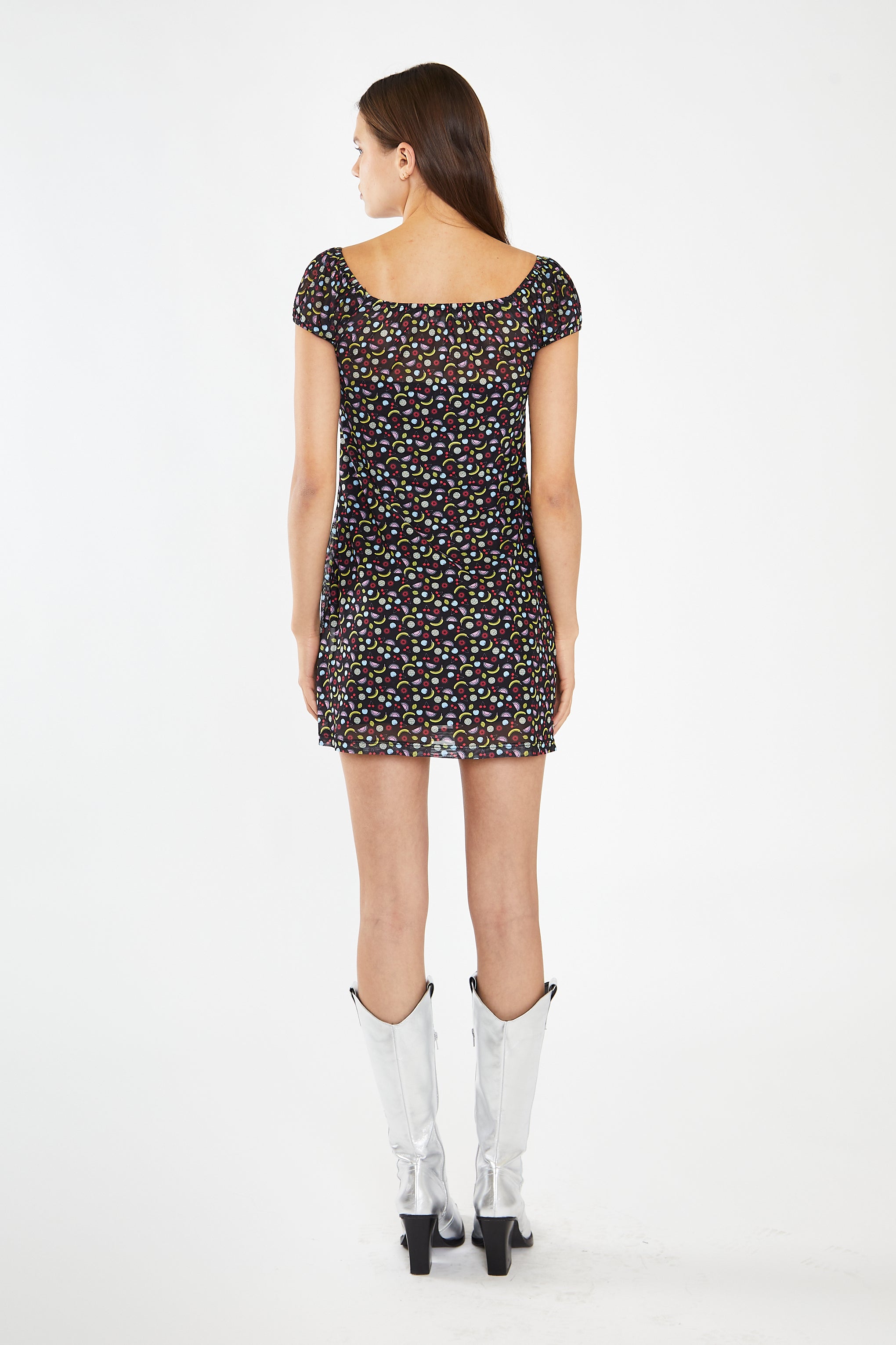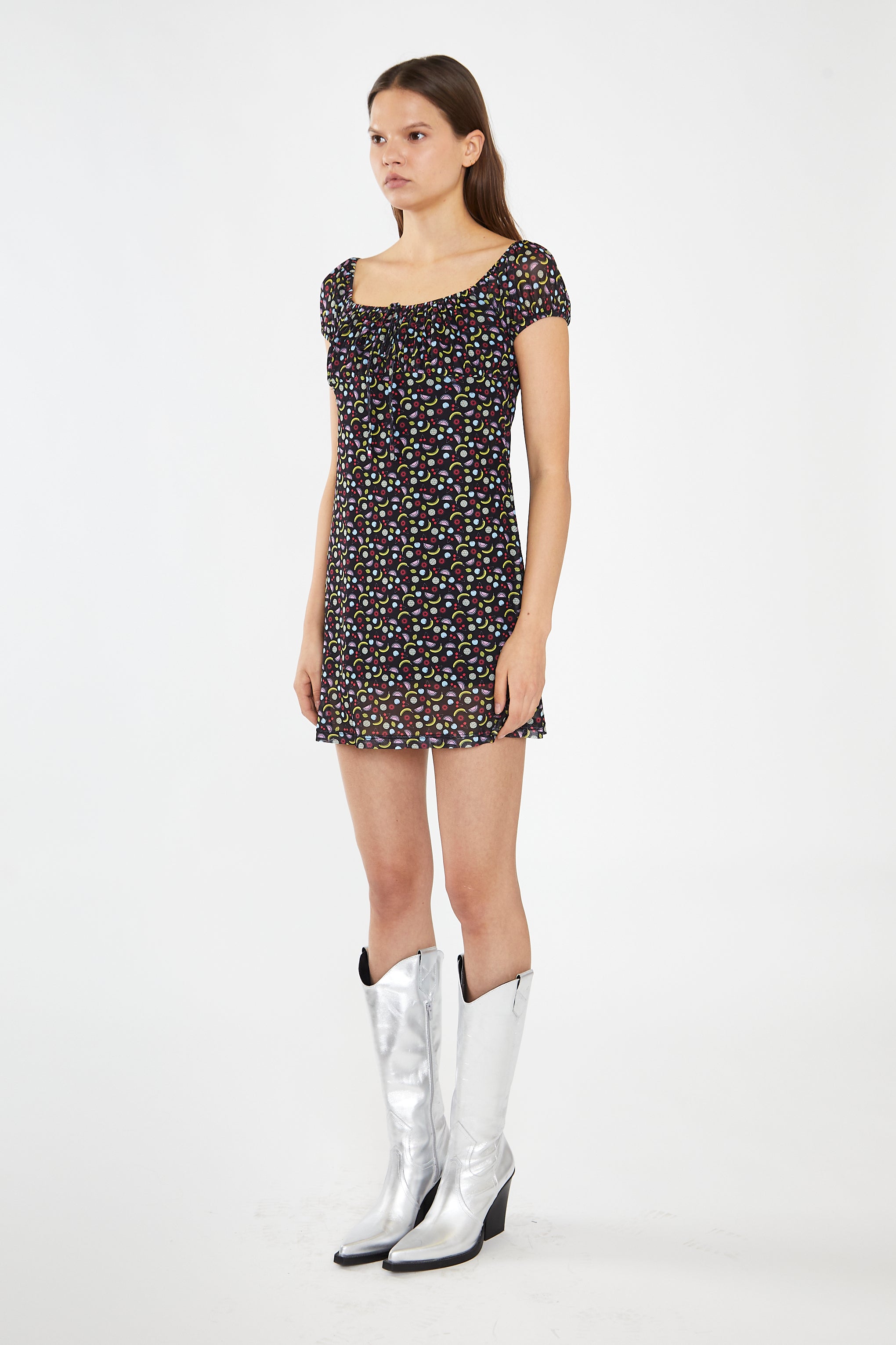 Glamorous Womens Black Fruit-Print Mesh Milkmaid Mini-Dress. Add some playful charm to your wardrobe with this Black Fruit-Print Mini-Dress! Featuring a gathered milkmaid style bodice and cap sleeves, this dress offers a flattering A-line skirt and mini length for a fun and flirty look. Its the perfect outfit for any occasion!