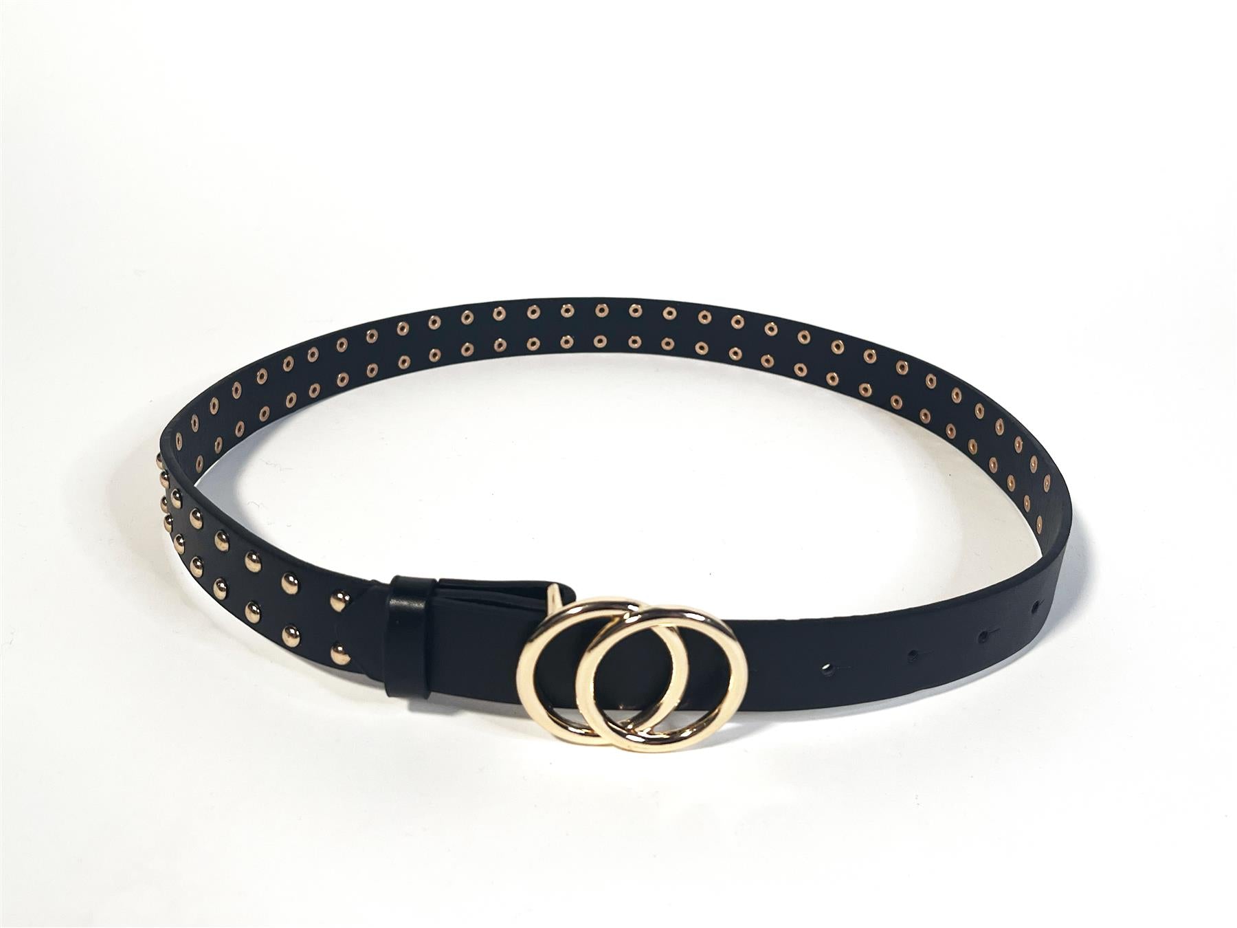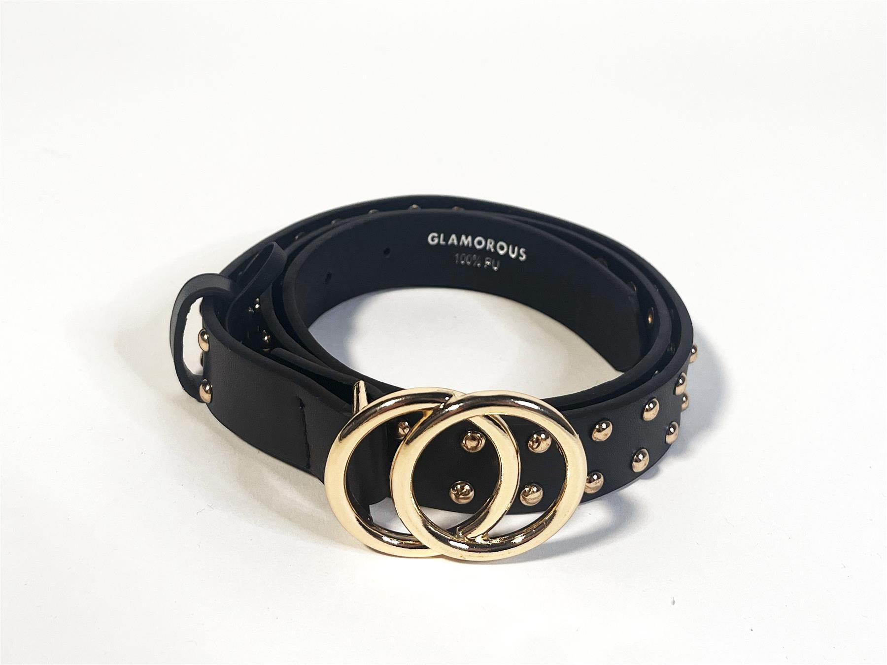 Glamorous Women's Black-Gold Studded Belt. The Black Gold Studded Belt brings a touch of edge and elegance with its eye-catching gold studs and sleek black finish. Designed with a gold buckle to match the accents, this belt instantly adds a polished detail to any outfit. The sturdy design is as functional as it is stylish, making it perfect for adding some flair to casual jeans or pairing with a tailored dress. The black and gold combination keeps it versatile and easy to wear, while the studded detailing gives it just the right amount of personality. This belt is an ideal choice when you want a reliable accessory that stands out but still pairs well with your wardrobe staples.