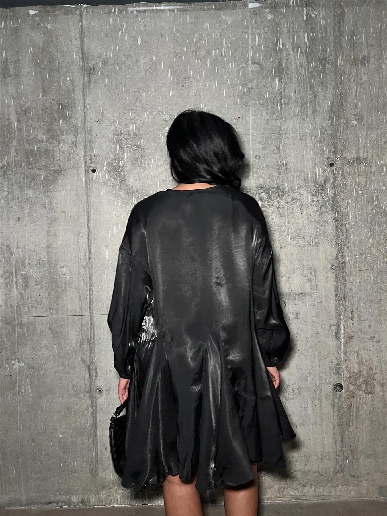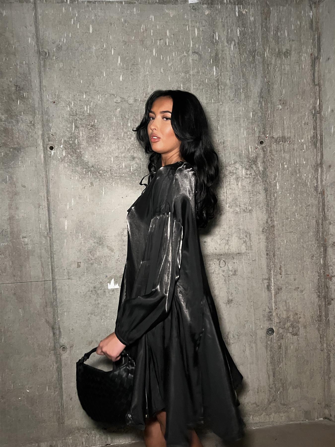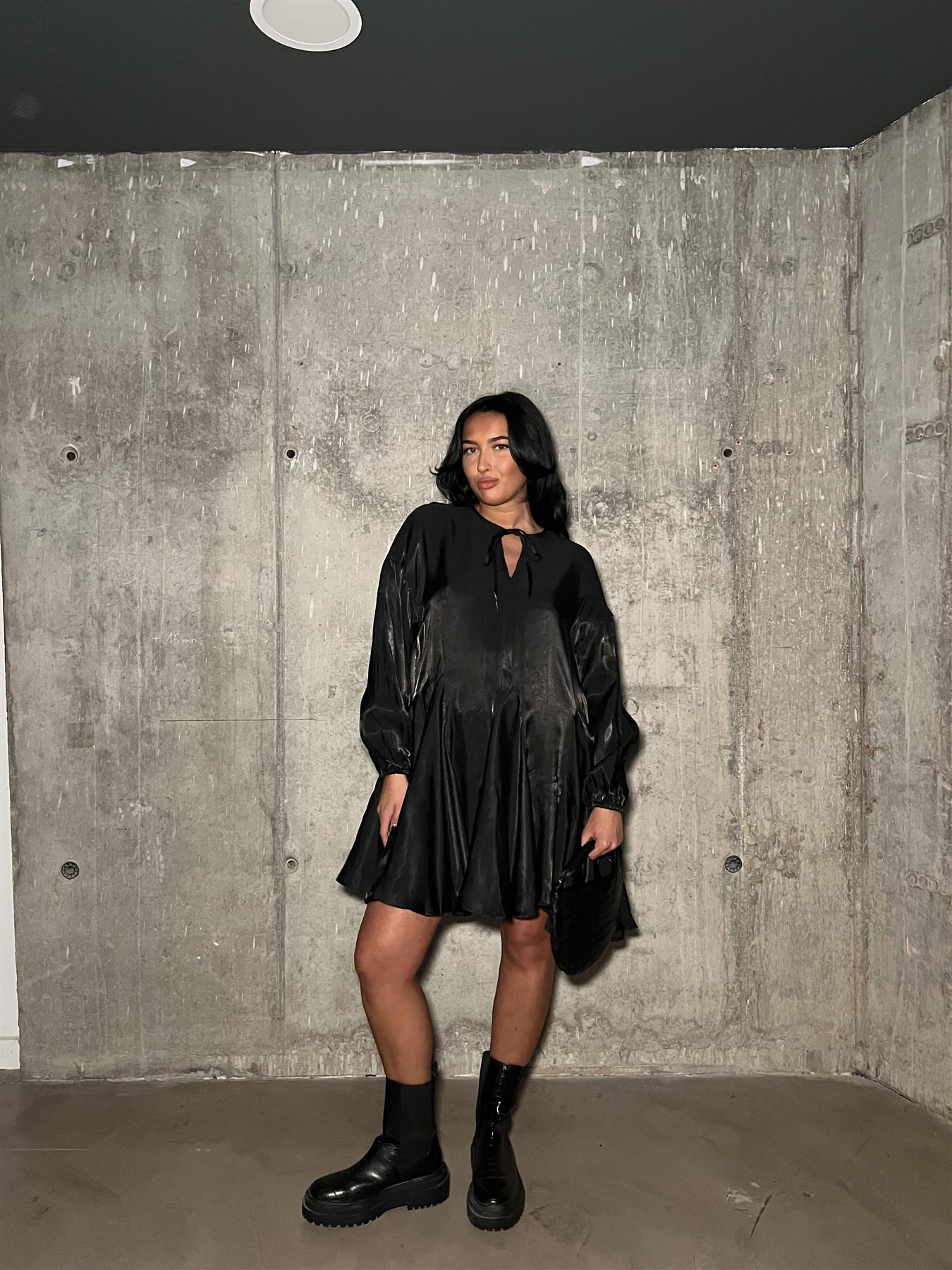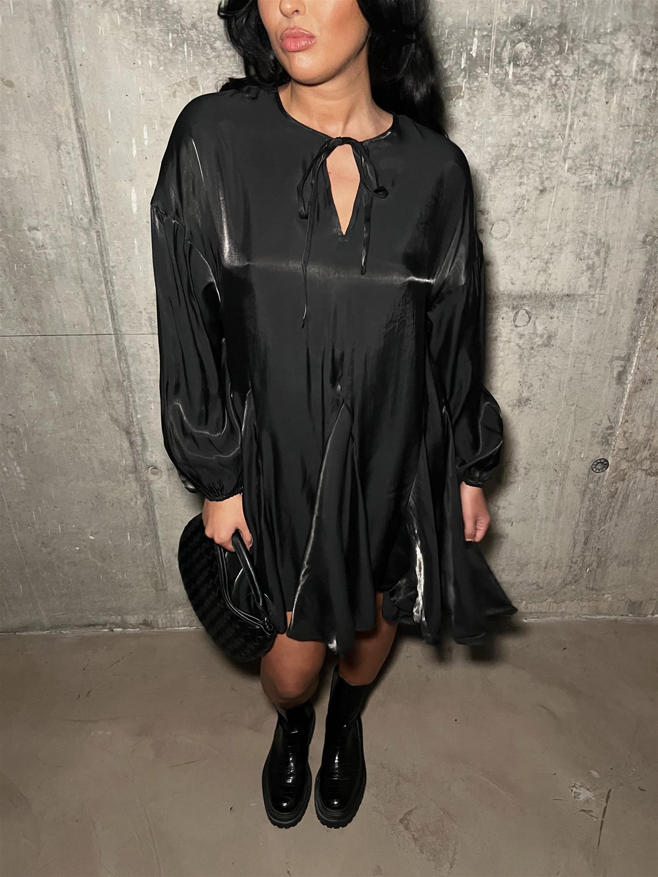 Glamorous Women's Black-Metallic Tie-Front Swing Mini-Dress. Add a touch of shine to your look with our Black-Metallic Tie-Front Swing Mini-Dress. This sleek dress features long sleeves for a bit of extra coverage, perfect for cooler evenings or more formal settings. The mini length offers a classic and timeless silhouette, giving you just the right balance of elegance and comfort. A standout feature is the chic metallic bow, adding a subtle touch of glamour to your outfit. Pair it with your favourite heels for an evening event, or keep it simple with ankle boots for a more laid-back vibe. This dress brings a hint of sparkle while remaining versatile and easy to wear.