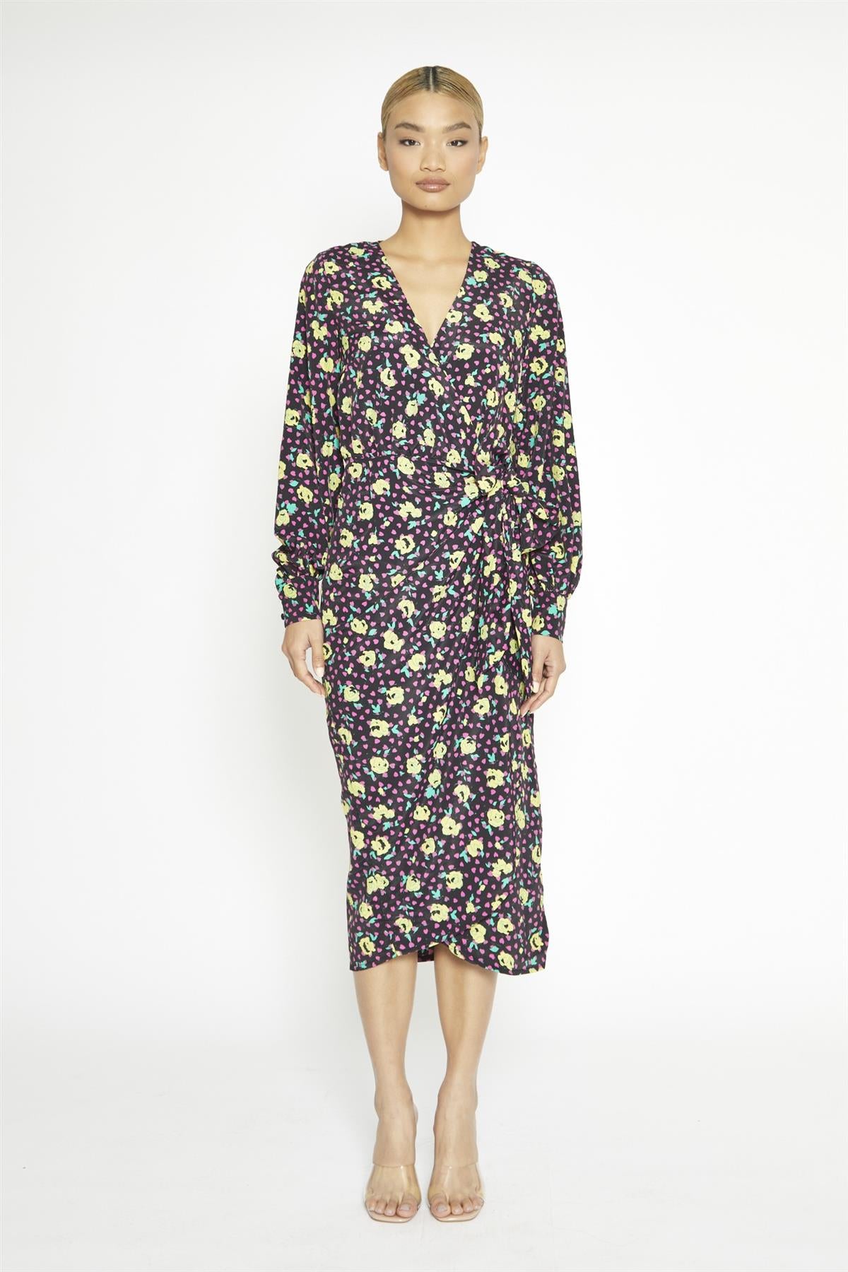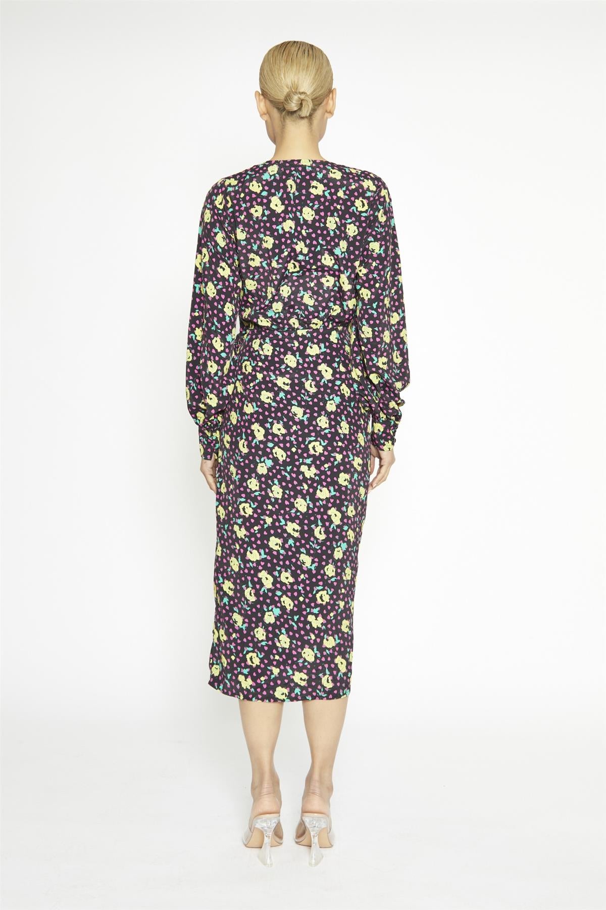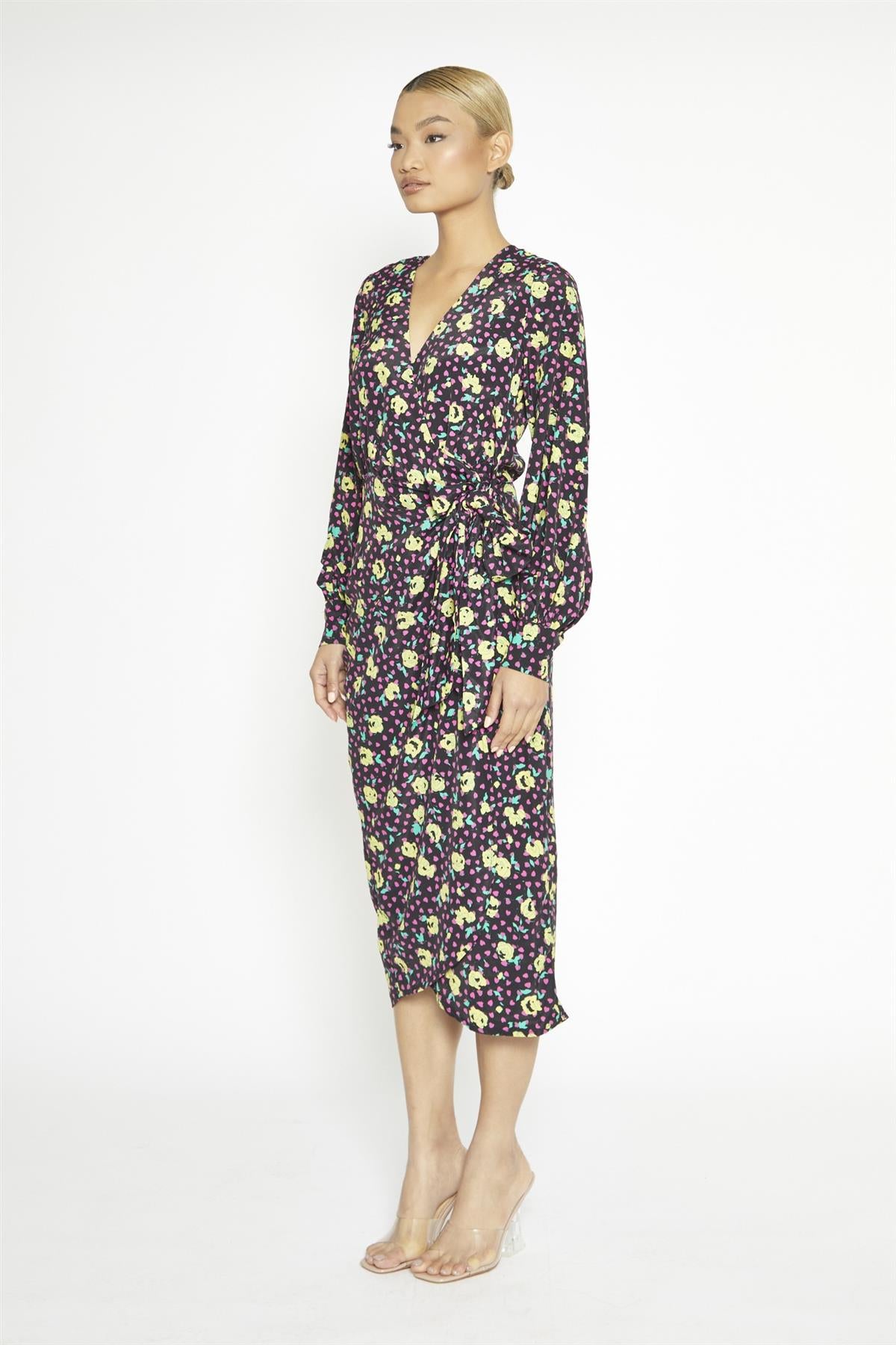 Black Multi-Roses Wrap Midi-Dress