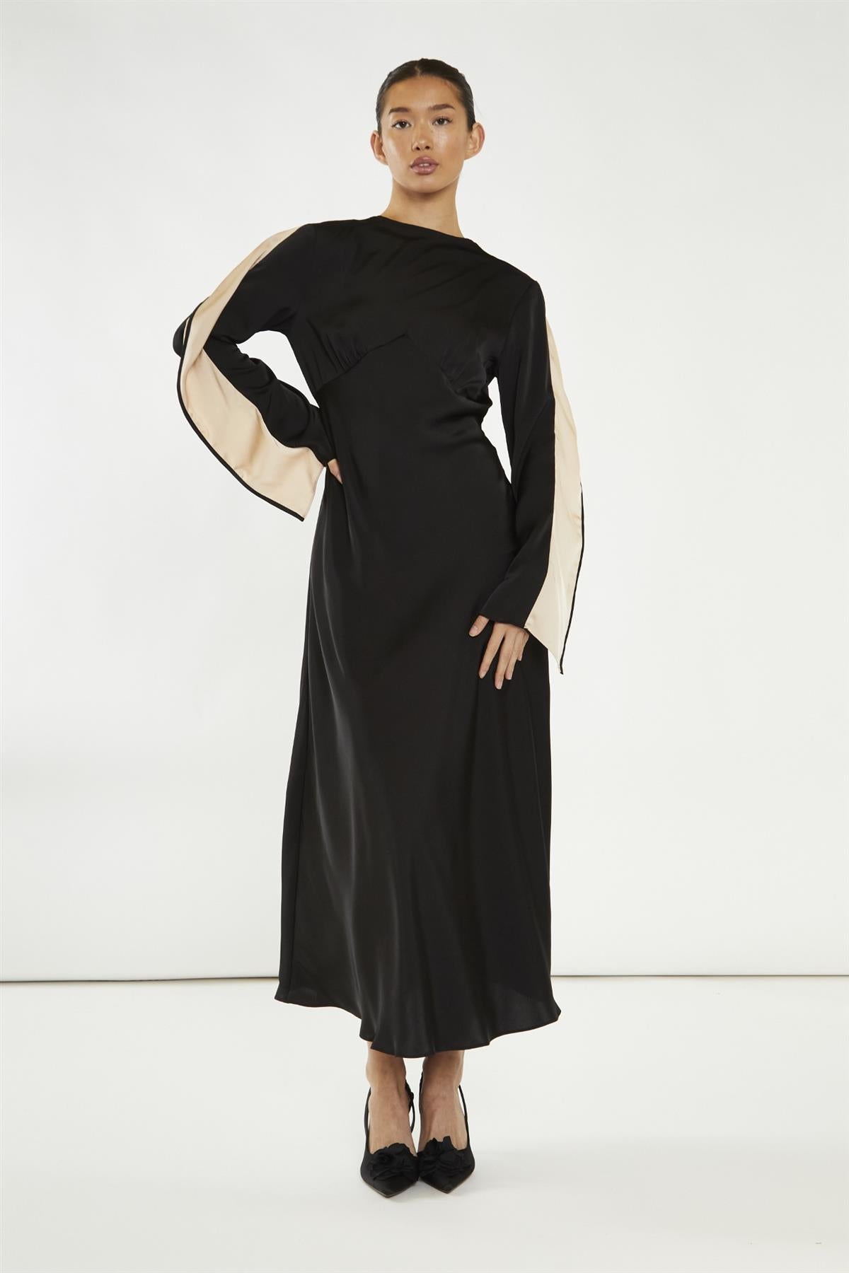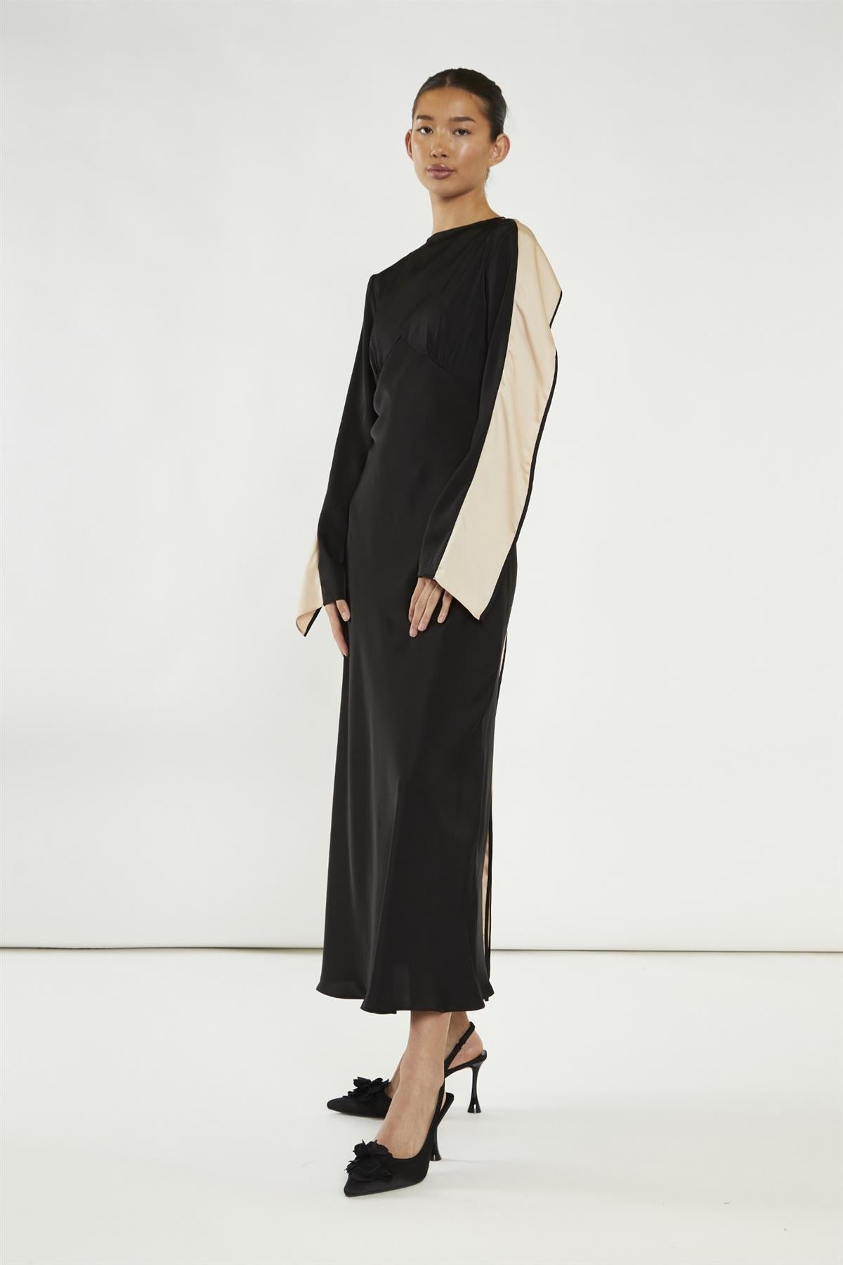 Glamorous Studio Women's Black-Nude Waterfall Ruffle Maxi-Dress. Prepare to turn heads with the Black-Nude Waterfall Ruffle Maxi-Dress, a captivating creation that blends sophistication and allure. Revel in the mesmerizing waterfall ruffle details that cascade down the sleeves and back, adding a touch of drama to your look. The tie back offers a personalized fit, allowing you to feel poised and confident. The block colour exudes a timeless elegance, while the fitted silhouette accentuates your natural curves. This dress is a versatile choice, suitable for any occasion, from a glamorous soirée to a relaxed gathering. Embrace the opportunity to showcase your unique style and let this dress be the centrepiece of your ensemble.