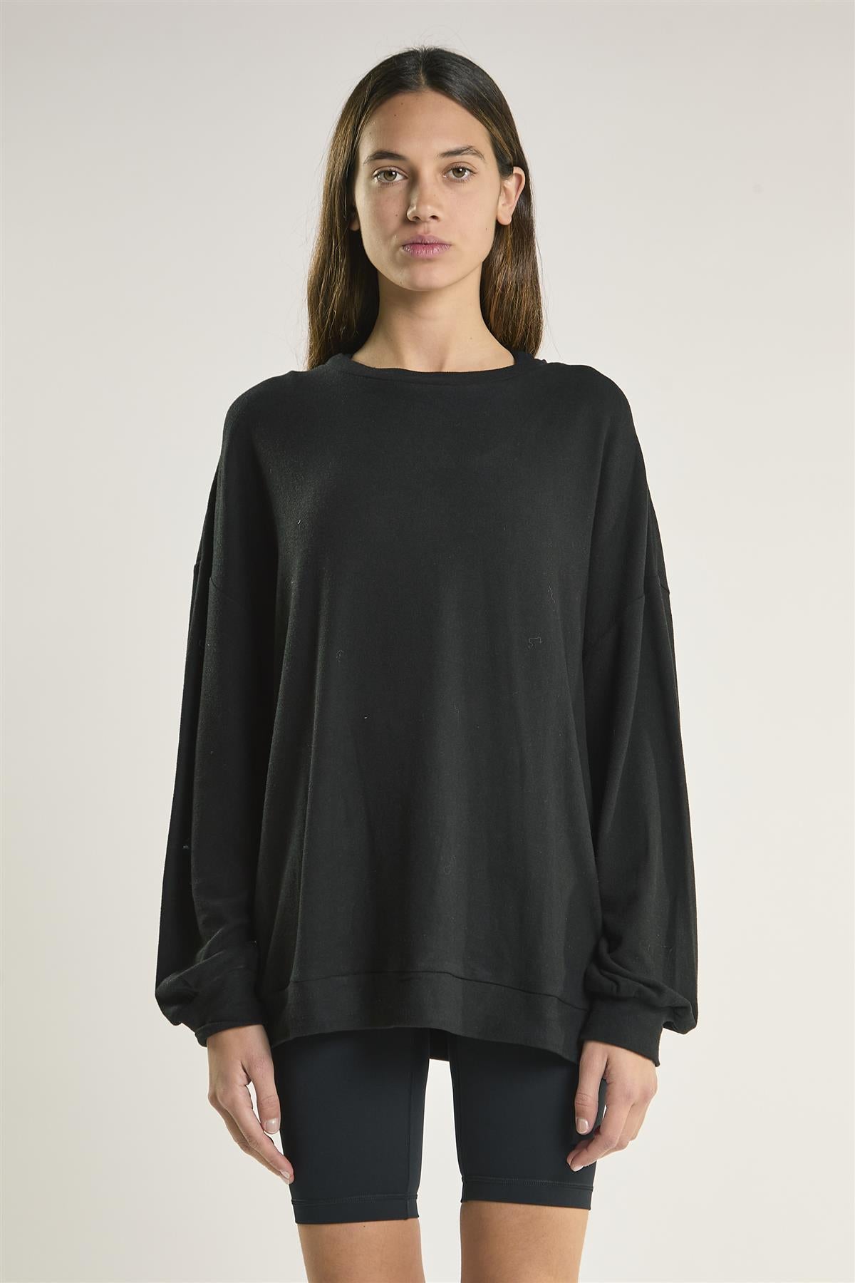 Glamorous Women's Black Oversized Sweatshirt. This oversized sweatshirt brings an easygoing feel to whatever your day holds. The roomy fit and drop shoulders give it that lived-in comfort right from the start, and the classic crewneck keeps things simple in the best way. It hangs just right—slouchy without feeling sloppy—and works well layered over leggings or paired with the matching ribbed bottoms for a low-effort outfit that still looks thoughtfully put together. The fabric has that soft-on-the-inside texture you reach for on repeat, making it a go-to for lounging, errand-running, or just enjoying a slower pace. Throw it on, take a breath, and let comfort lead for once.