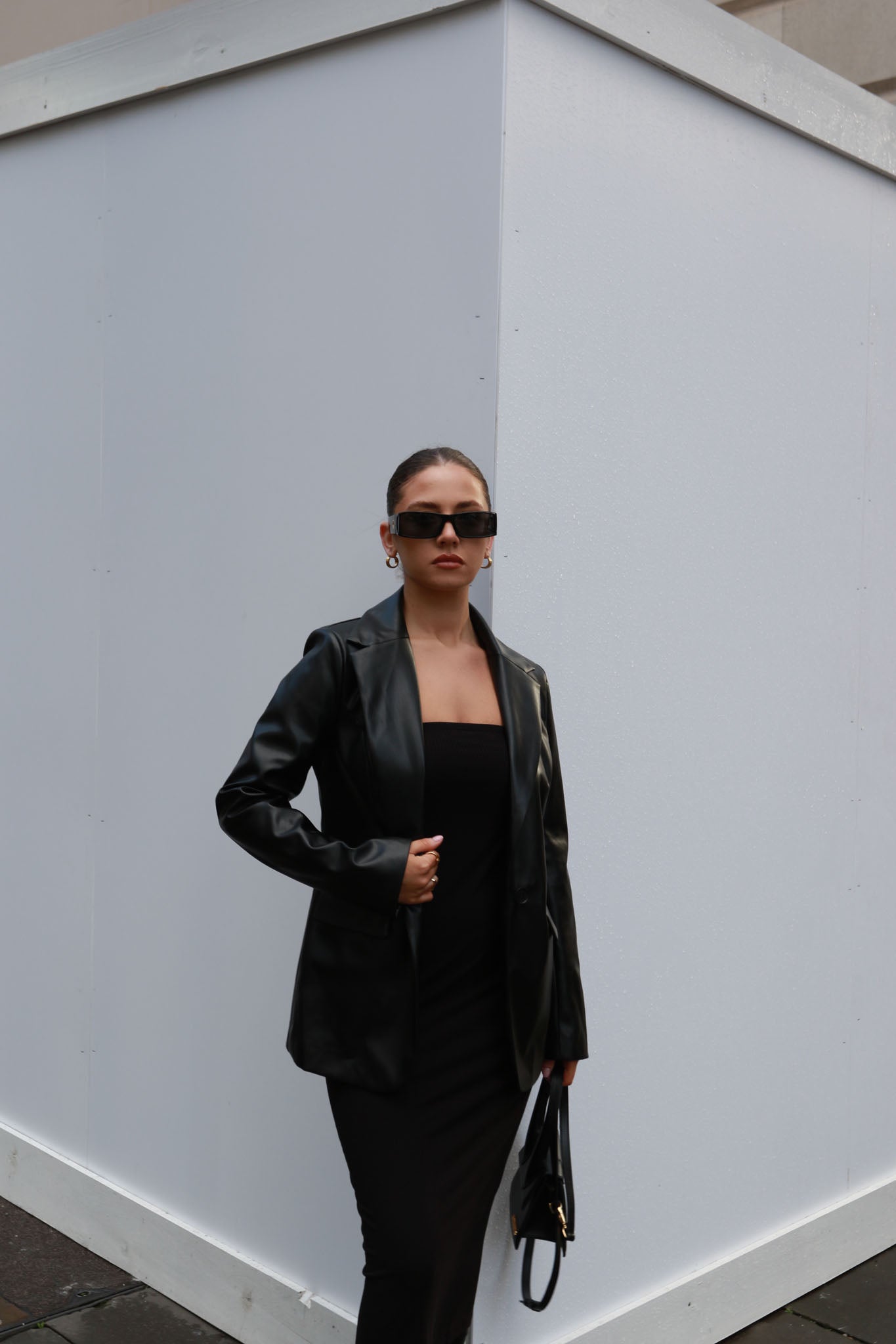 Glamorous Care Women's Black PU Oversized-Fit Blazer. Stay comfy and sharp in this standout black blazer! It's oversized fit ensures maximum comfort, while the recycled fabrics give an eco-friendly, sustainable edge! Your wardrobe and the environment will thank you.