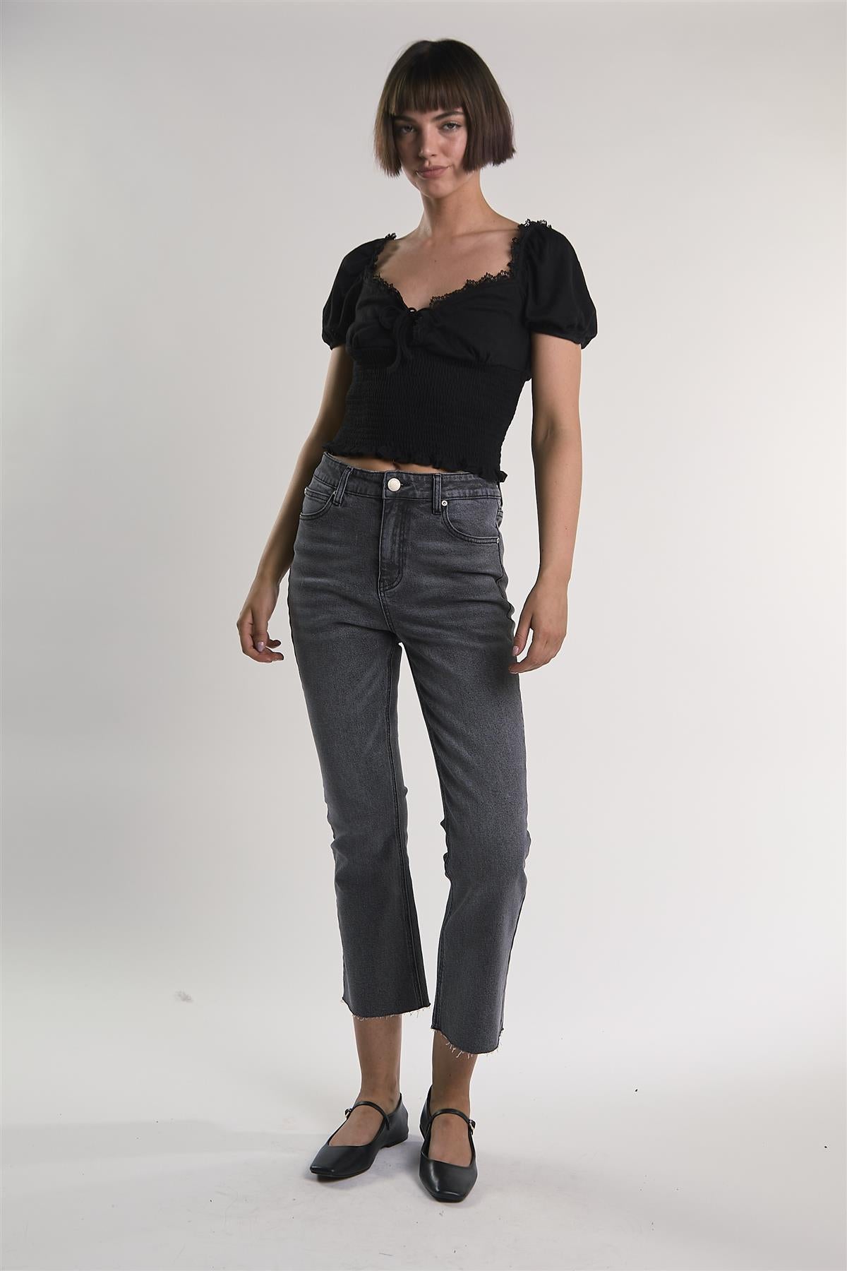 The Puff Sleeve Babydoll Crop Top combines relaxed shape with thoughtful detail. Smocking through the body creates gentle structure, while puff sleeves add light volume and balance. A tie-front detail and lace trim lends soft texture. Finished with a cropped cut, it works well with high waisted denim, striking the line between casual charm and easy versatility.