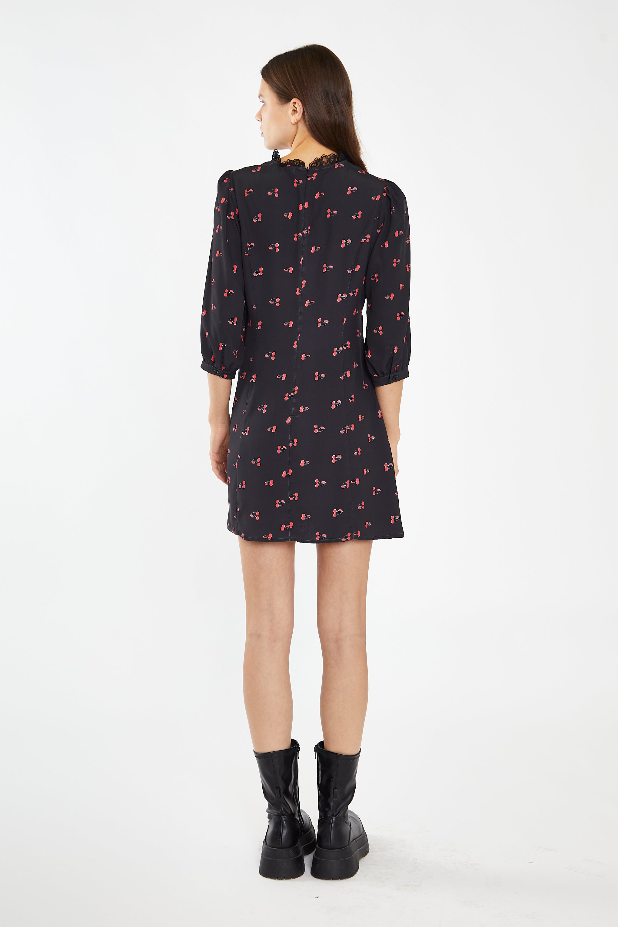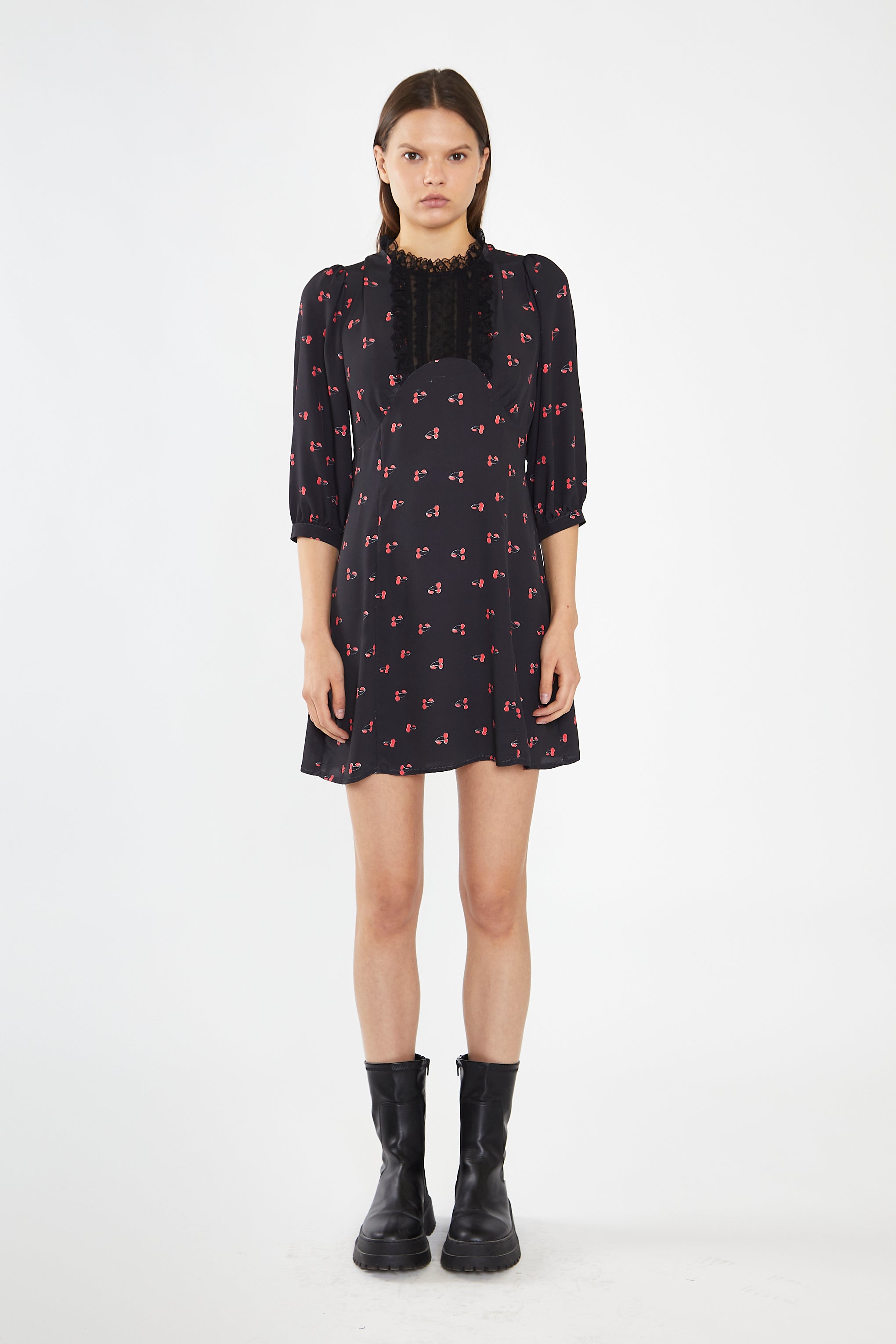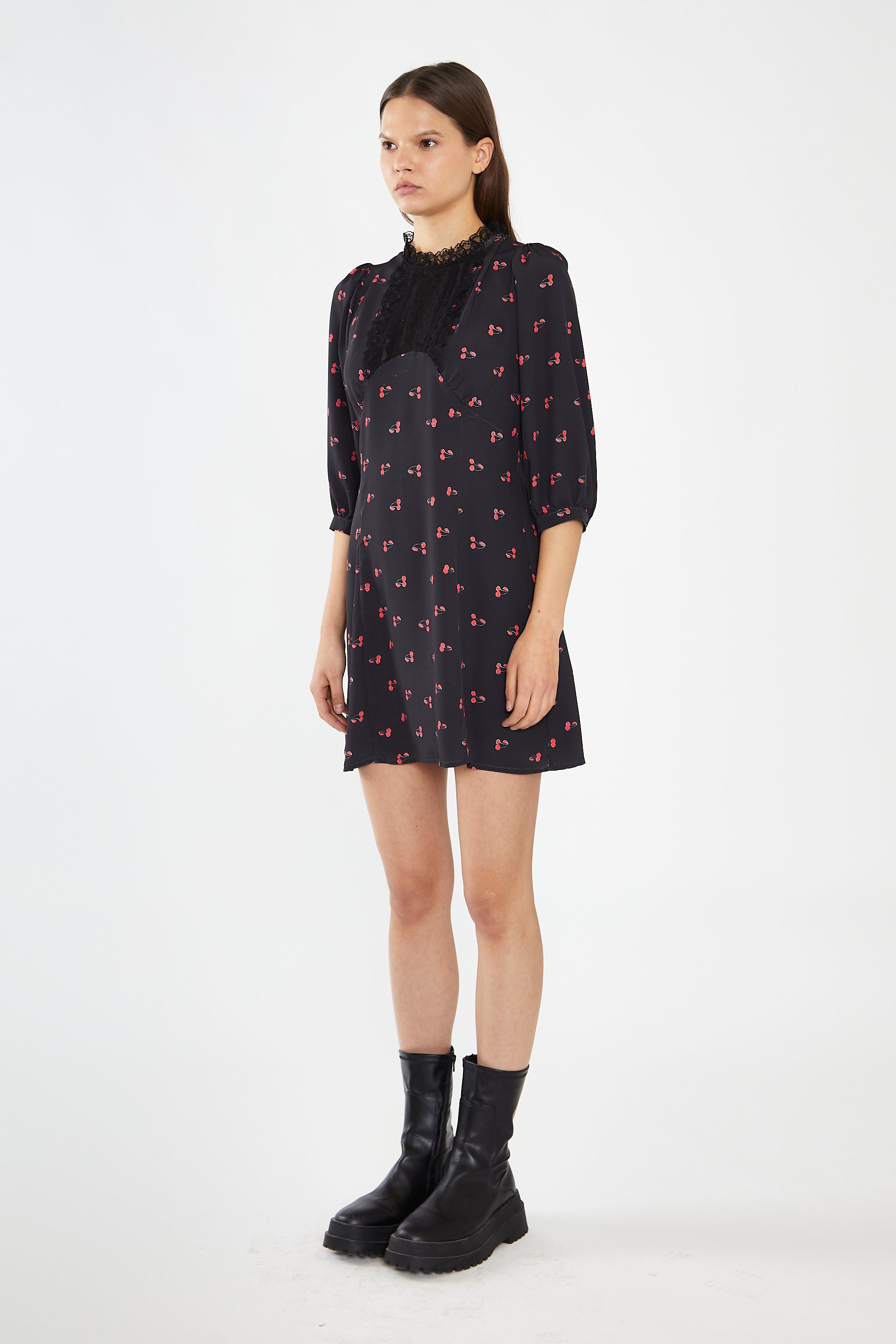 Glamorous Womens Black-Red Cherry Fruit High Neck Mini-Dress. Stay chic and stylish with our Black-Red Cherry Fruit High Neck Mini-Dress. The high neckline and tailored fit provide a sophisticated touch, while the lace detailing and puff sleeves add a touch of feminine charm. Perfect for any occasion, this mini dress is sure to become a staple in your wardrobe.