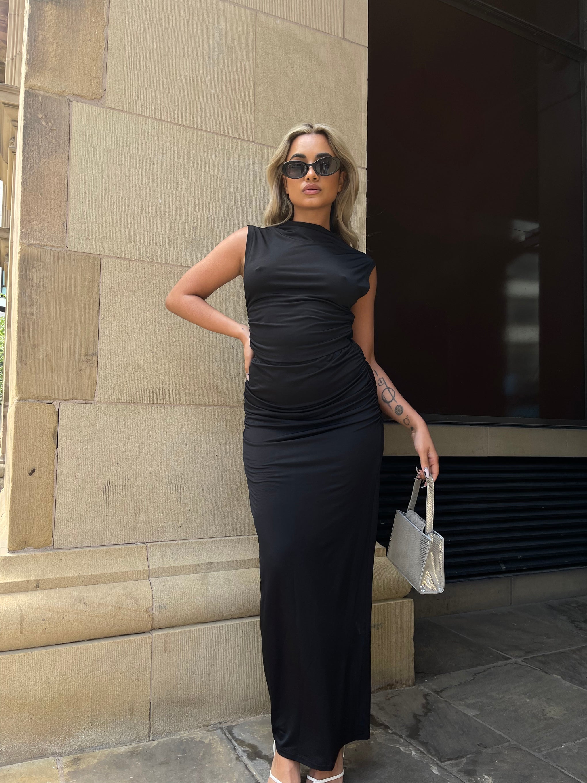 Glamorous Studio Womens Black Ruched High-Neck Crop-Top. Get ready to turn heads with our Black high neck Top! Paired with the matching skirt, this slinky style top is perfect for a night out. The tight-fitting ruched design will hug your figure, making you feel confident and stylish.