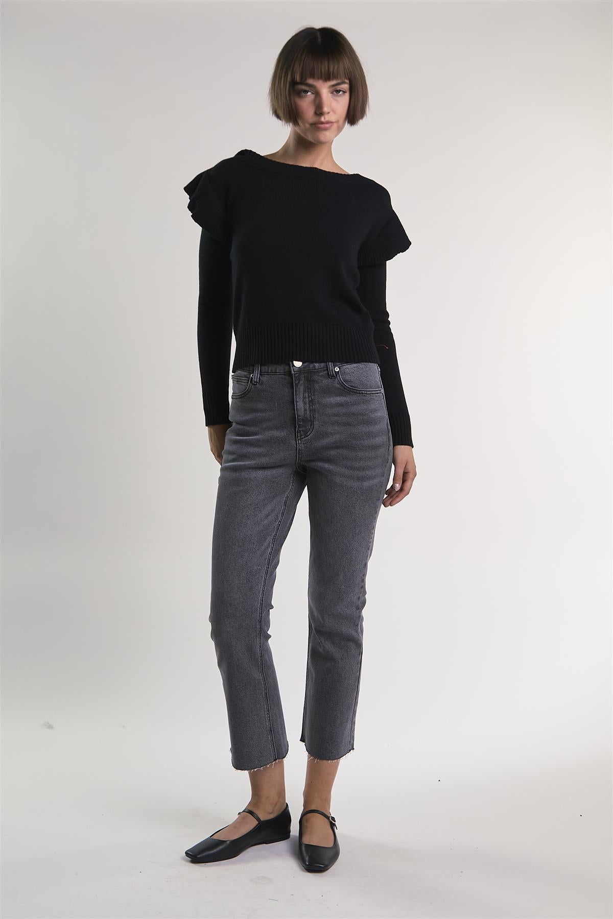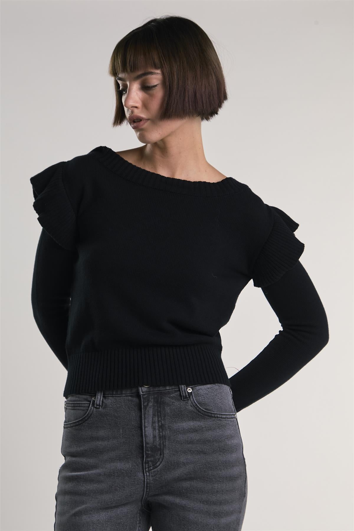 A bold, dramatic, stand out piece, the Black Ruffle Shoulder Sweater is ideal for your signature style rotation. Style it with distressed denim jeans and your favourite flats to complete the look.