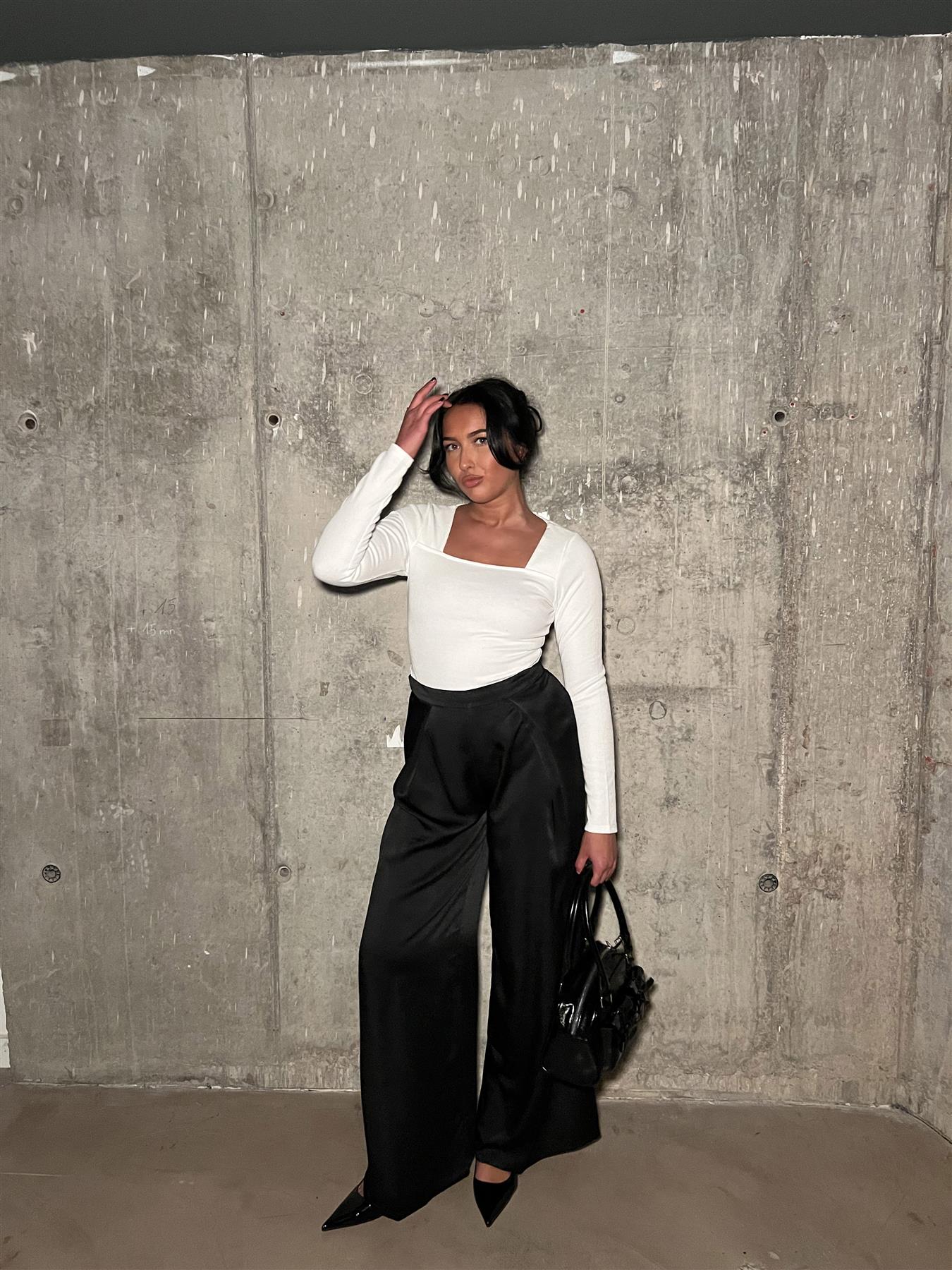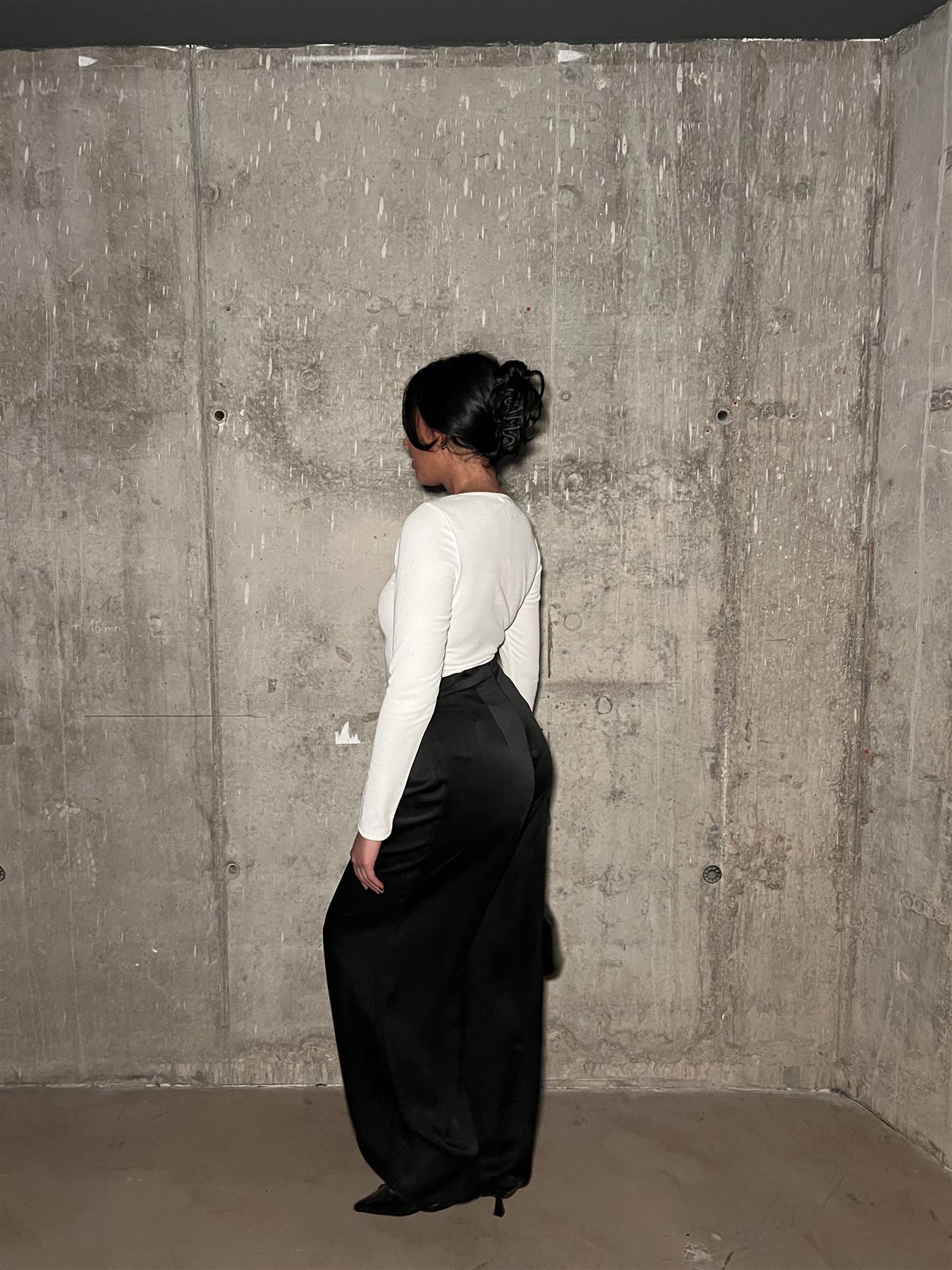 Glamorous Women's Black-Sateen High-Waisted Wide-Leg-Trousers. These high-waisted wide-leg trousers bring a smooth, flowing feel thanks to their luxurious satin fabric. The wide-leg cut allows for easy movement and adds a relaxed yet polished vibe, making them great for both casual days and more dressed-up occasions. Sitting high on the waist, they create a flattering silhouette that pairs effortlessly with fitted tops or cropped styles. The concealed zip at the back keeps the look clean and streamlined, so nothing interrupts the elegant flow of the fabric. If you find a matching piece in a similar material, teaming them up would create a cool, coordinated outfit that feels stylish without being overdone.
