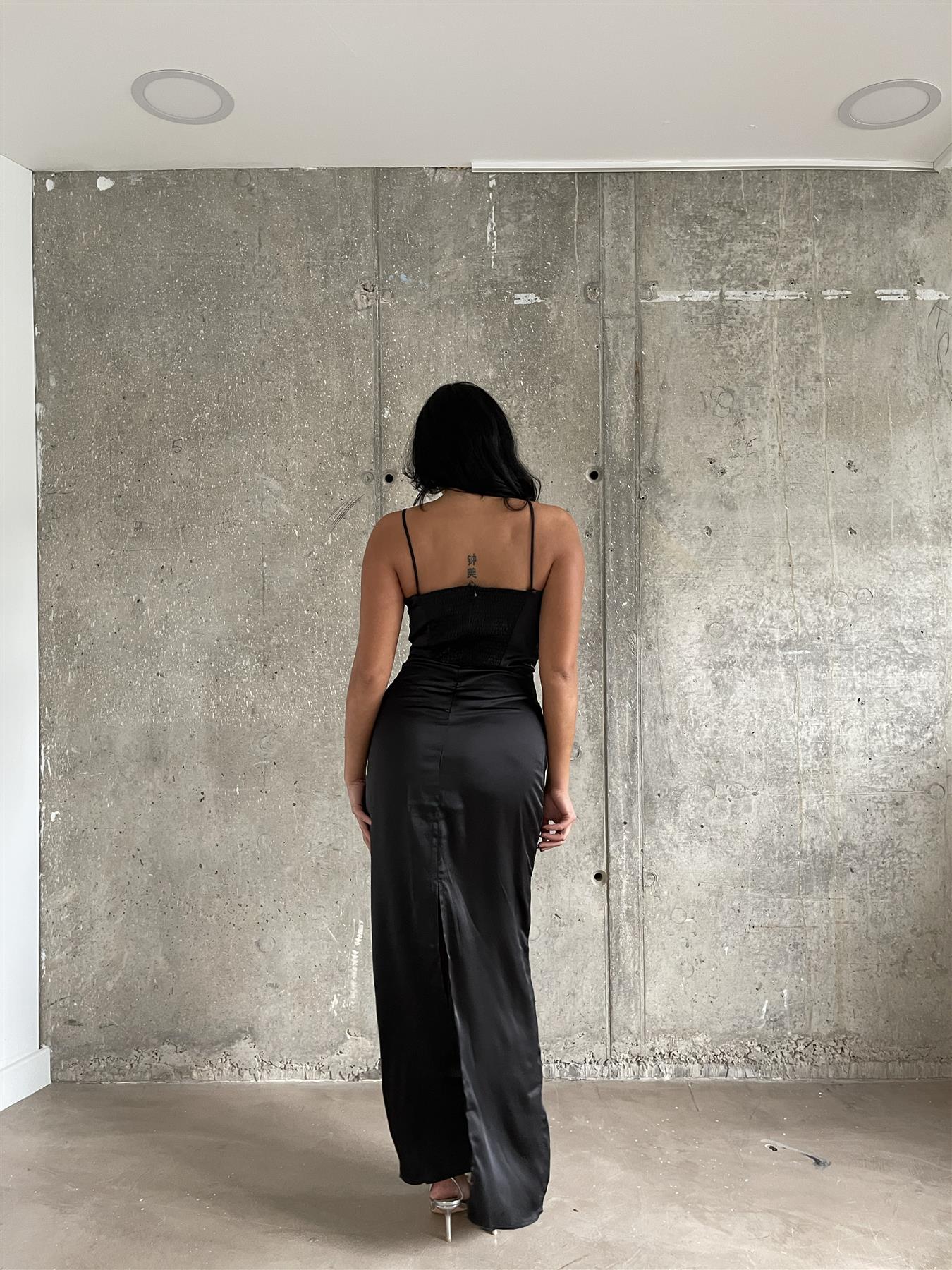 Glamorous Women's Black Satin Maxi-Dress. Wrap yourself in style with our Black Maxi-Coat, perfect for keeping cozy while looking effortlessly put-together. The button-front closure offers a sleek, classic design, making it easy to layer over any outfit. Long sleeves add extra warmth, while the maxi length provides full coverage with a touch of elegance, making it ideal for cooler days. Whether you're headed to the office or out for the evening, this coat adds a polished finish to your look. Pair it with anything from jeans to dresses for a versatile outerwear option that’s both practical and stylish. Simple, timeless, and always a great go-to for colder weather.