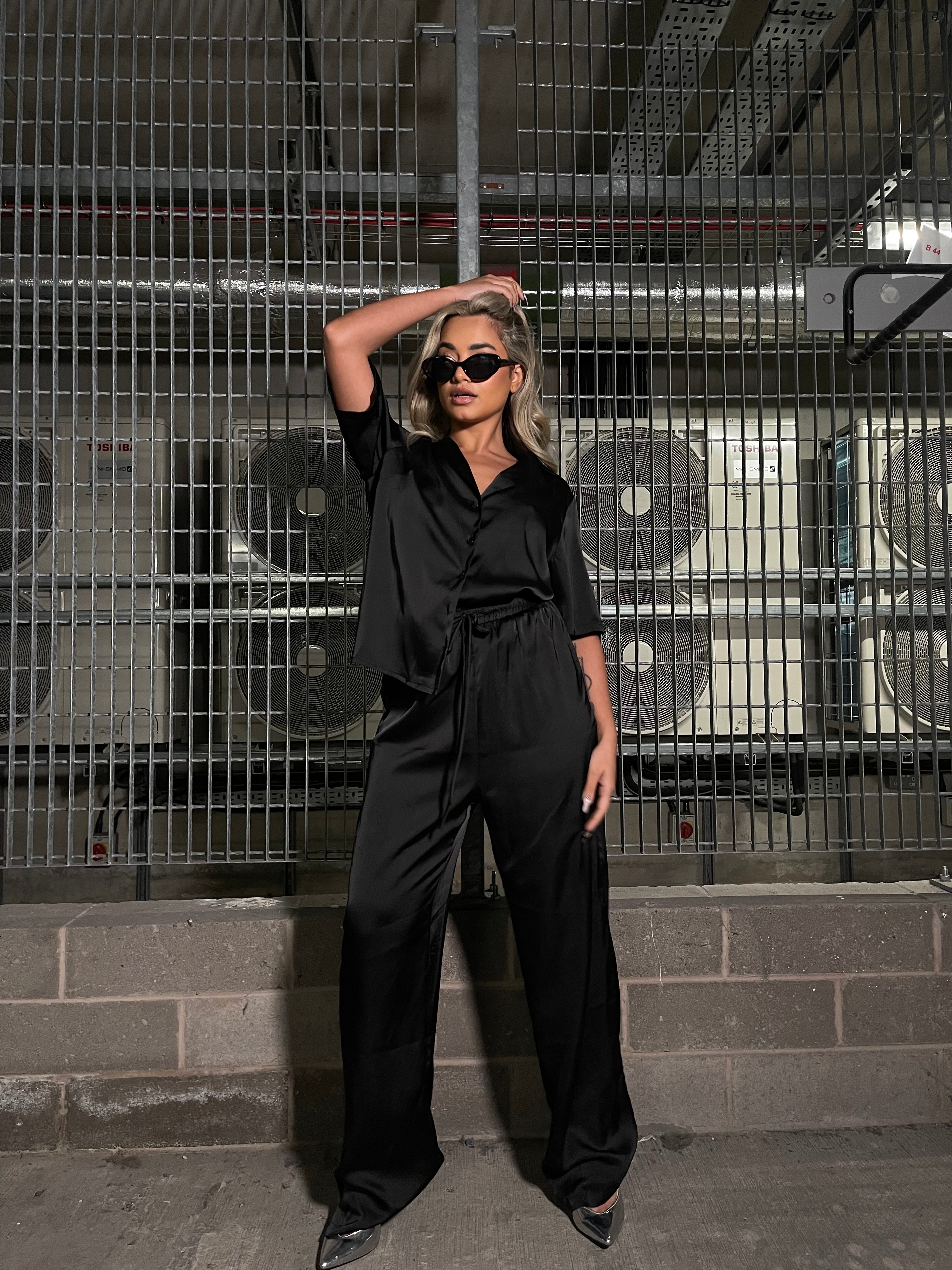 Glamorous Studio Womens Black-Satin Wide Leg High Waisted-Trousers. Slip into these relaxed-fit satin trousers for a sleek and stylish look. Perfect for pairing with the matching top, these wide leg trousers are both comfortable and chic. Take your wardrobe to the next level with this versatile and on-trend ensemble.