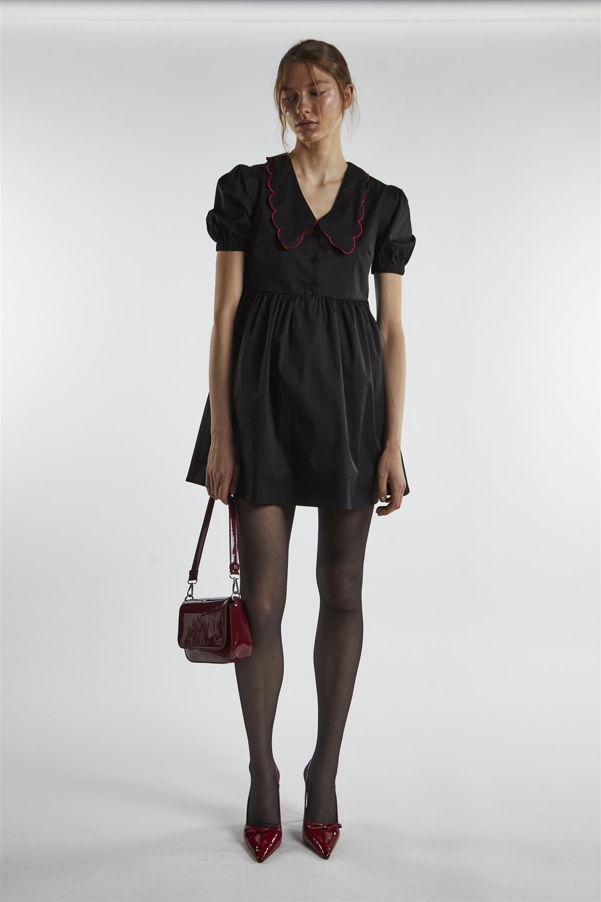 This Scalloped-Collar Mini-Dress adds a playful twist to classic style with a flattering skater silhouette and whimsical scalloped collar. Puff sleeves and adjustable buttons give a touch of romance and versatility. Pair with colourful accessories to highlight the detailing, or keep it sleek with minimalist jewellery for an understated finish.