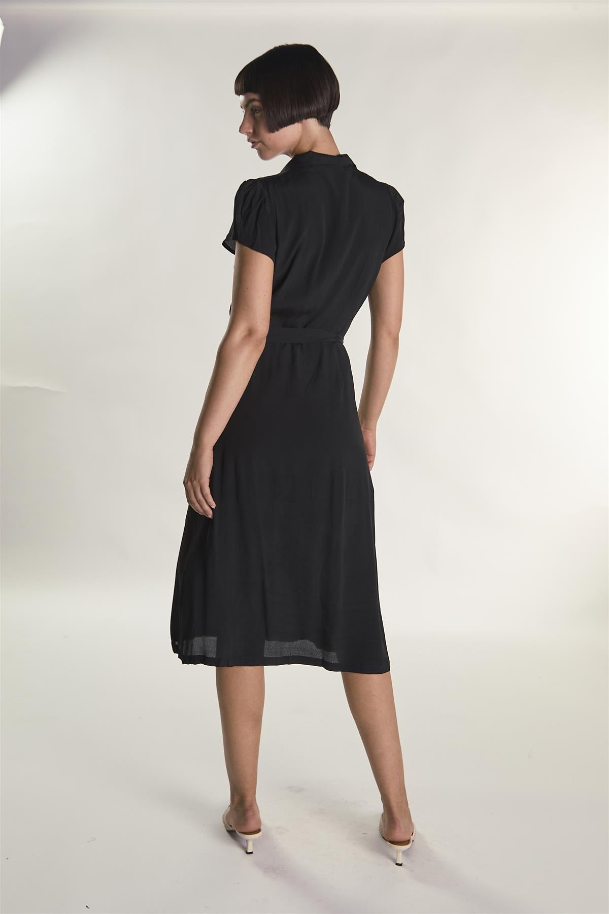 Timeless elegance you can return to time and again, the Short Sleeve Button Front Midi Dress will compliment your silhouette with its tie front detailing design and soft drape for fluidity. Style it with kitten heels and your favourite necklace to complete the look.