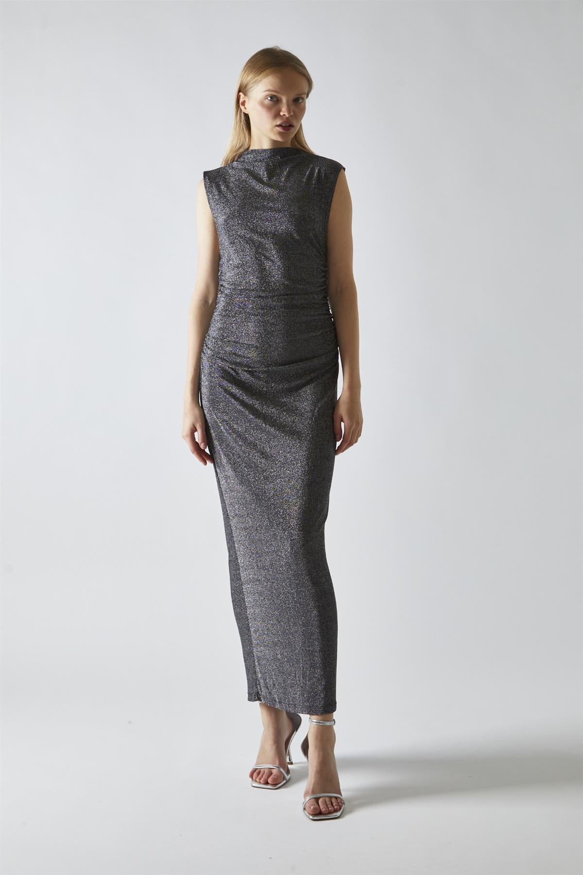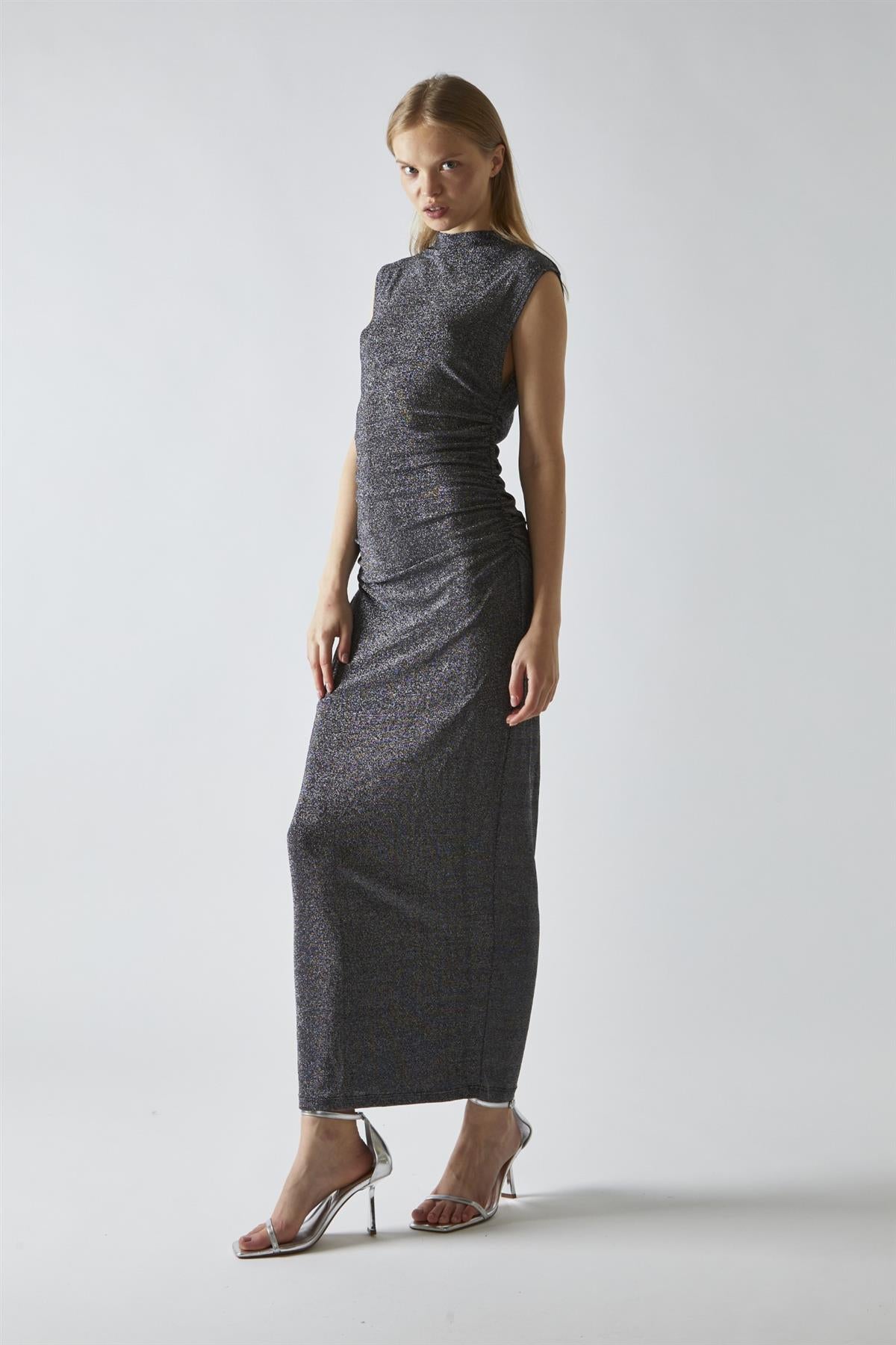 Glamorous Women's Black-Silver Glitter Ruched Midaxi-Dress. Shine bright at your next event in this stunning black-silver glitter ruched midaxi dress. The high slash neck adds an elegant touch, perfectly framing your shoulders and collarbone. Designed with a bodycon fit, this dress hugs your curves beautifully, ensuring you feel confident and fabulous. The ruched side seams create a flattering silhouette that enhances your shape while adding a bit of texture. With its midaxi length, this dress is ideal for showcasing your favourite heels. Pair it with a statement clutch and bold earrings for a night out, or layer it with a fitted jacket for a more casual yet chic look. This versatile piece is perfect for parties, date nights, or any special occasion where you want to make a lasting impression. With this dress in your collection, you’ll always have a go-to option for feeling glamorous and stylish..