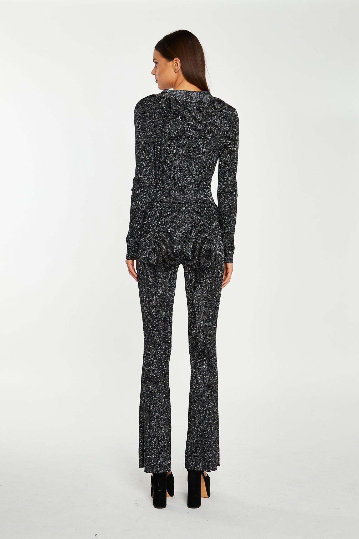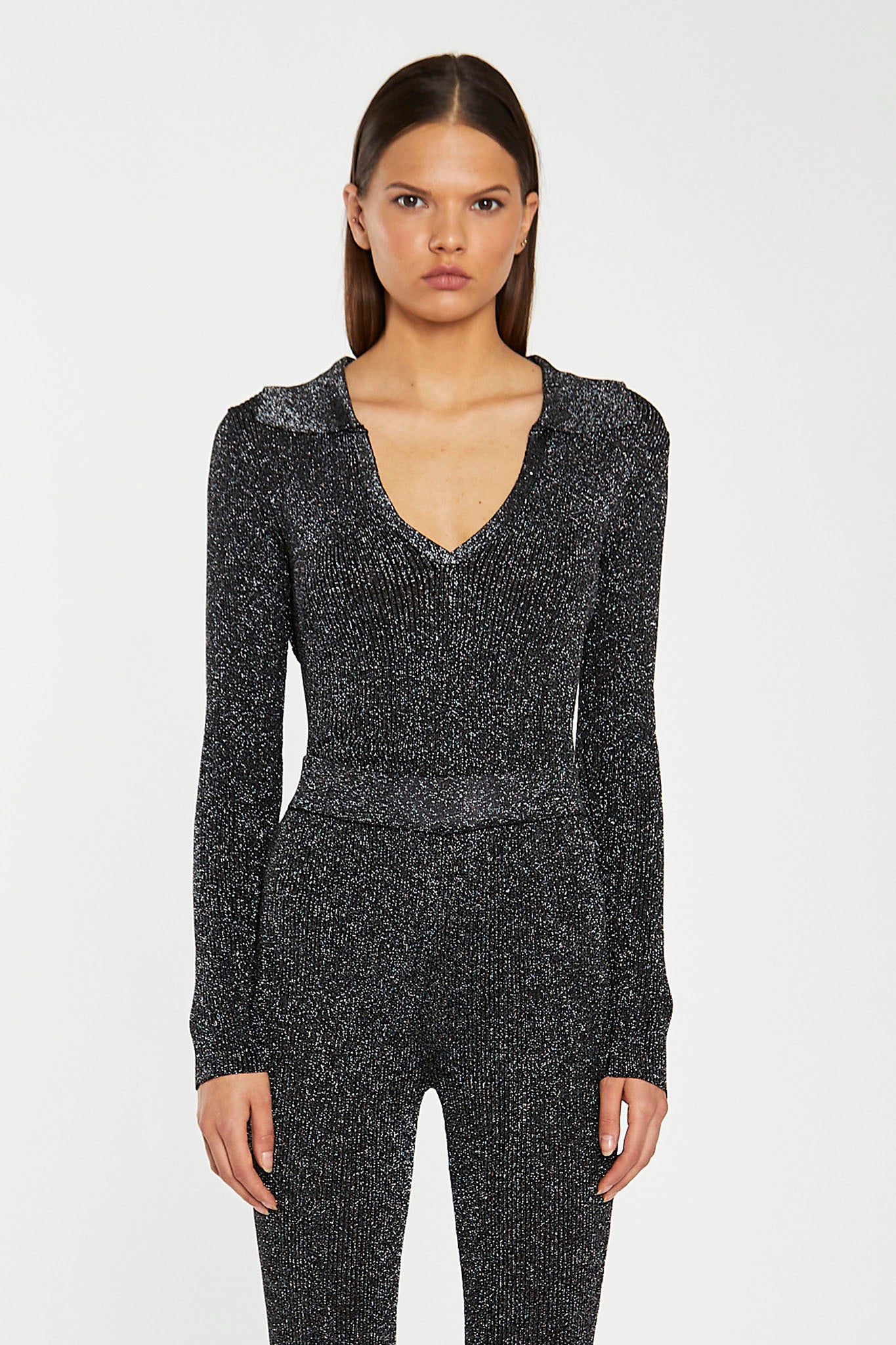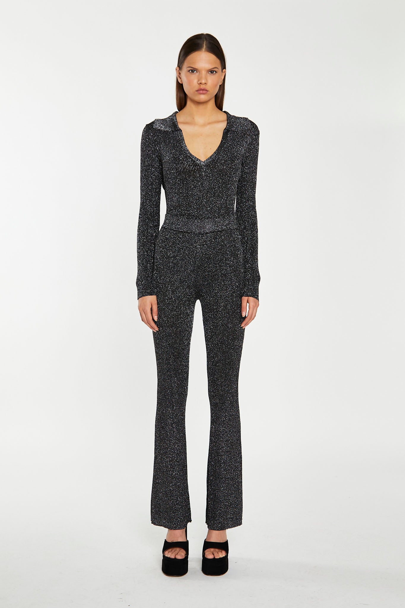 Glamorous Womens Black-Silver Rib Collared V-Neck -Bodysuit. Look sleek and stylish this season in this rib knit bodysuit. With a V-neck collared design, long sleeves and classic bodysuit fit, its the perfect pairing piece. Elevate the whole look with the matching trousers. Effortless style, maximum impact!