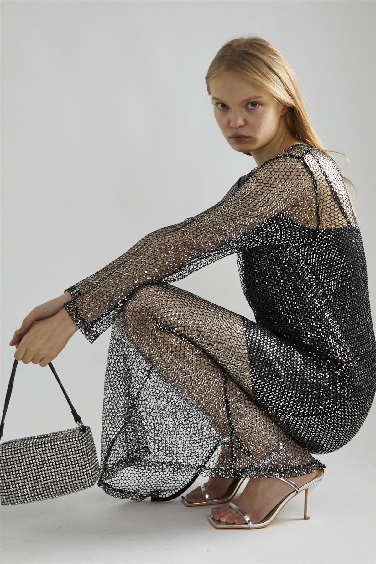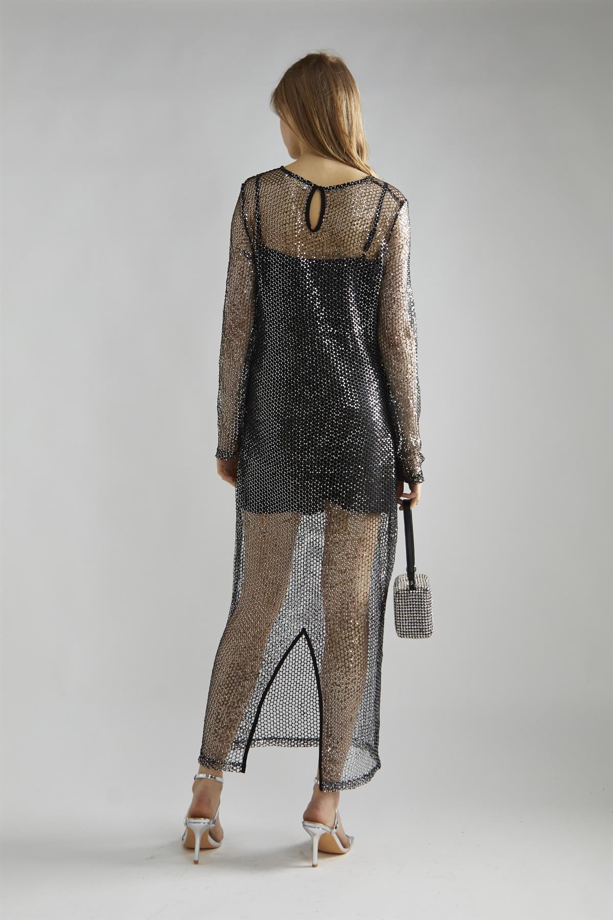 Glamorous Studio Women’s Black-Silver Sequin-Net Midi-Dress. Dazzle in this stunning black and silver sequin net crochet midi dress. The intricate crochet design adds a touch of vintage charm, while the shimmering sequins bring a modern twist. This dress hits the perfect balance between elegance and fun with its midi length, making it suitable for various occasions. The back split hem adds a flirty touch and allows for easy movement, perfect for dancing the night away. Adjustable straps ensure you'll find your ideal fit, providing both comfort and support. A concealed button fastening at the back creates a sleek silhouette. This versatile piece can be dressed up with heels and statement jewellery for a glamorous evening look, or paired with flats and a denim jacket for a more casual yet eye-catching ensemble. The black and silver colour combination offers endless styling possibilities, making this dress a valuable addition to any wardrobe.