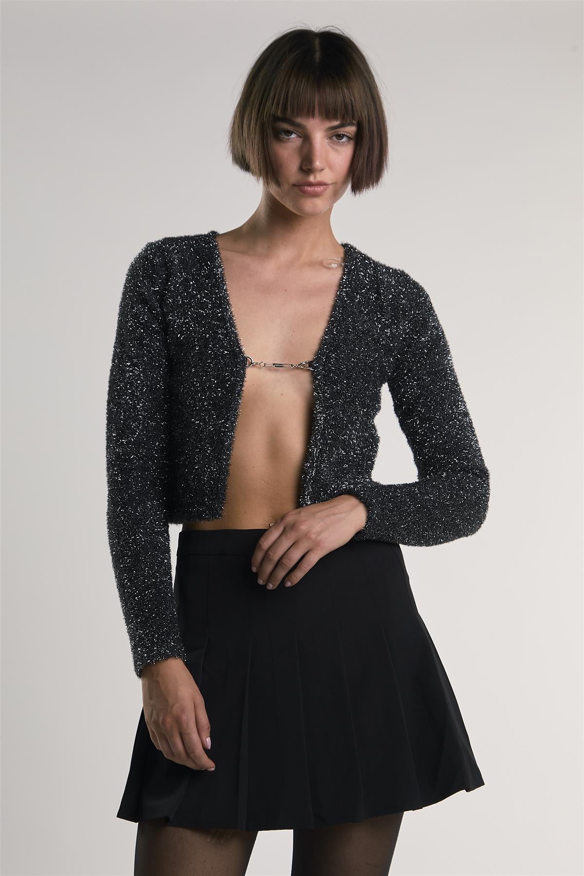 Add a touch of sparkle with this Tinsel Long Sleeve Crop Top, where shimmering fabric catches the light for a striking effect. The cropped length features an open front secured with a clasp, adding a subtle, modern detail. Style it with a mini skirt and boots for a festive look.