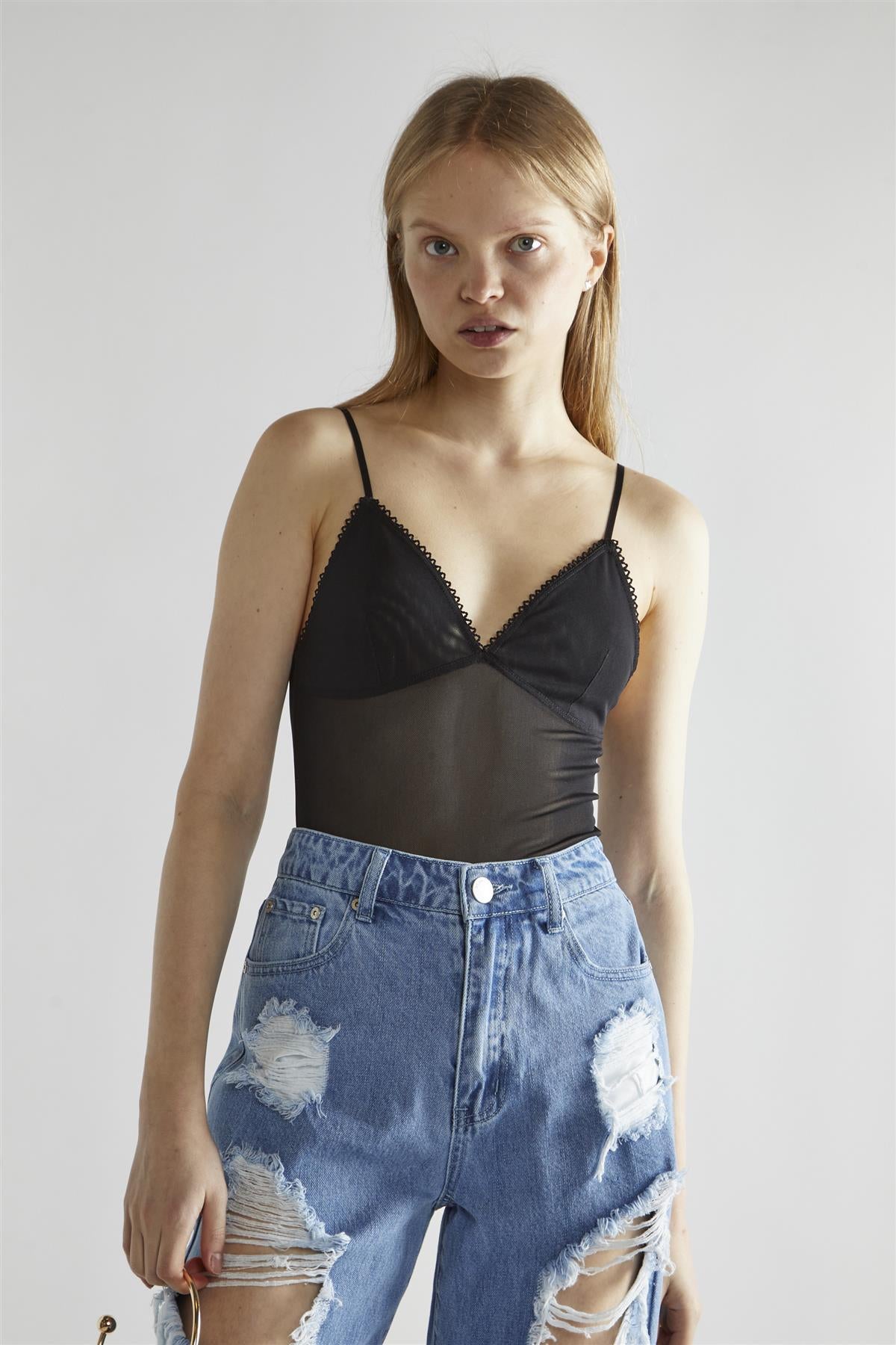 Glamorous Women's Black V-Neck Sleeveless -Bodysuit . This black V-neck sleeveless bodysuit is your new secret weapon for effortless style. It's like that trusty friend who always knows how to make you look good. The deep V-neck adds a touch of allure, while the adjustable spaghetti straps ensure you get that perfect fit every time. The mesh fabric keeps things light and breathable, perfect for those days when you want to feel sexy but not sweaty. And let's talk about that lace trim detailing - it's the little extra that takes this bodysuit from basic to beautiful. This piece is a chameleon in your wardrobe, ready to pair with anything from your favourite jeans for a casual look, to a sleek skirt for a night out. It's comfy enough for all-day wear, but stylish enough to make you feel like you've got your life together, even if you're just running errands. Pop it on, and watch your confidence soar - it's amazing what a good bodysuit can do for your mood.
