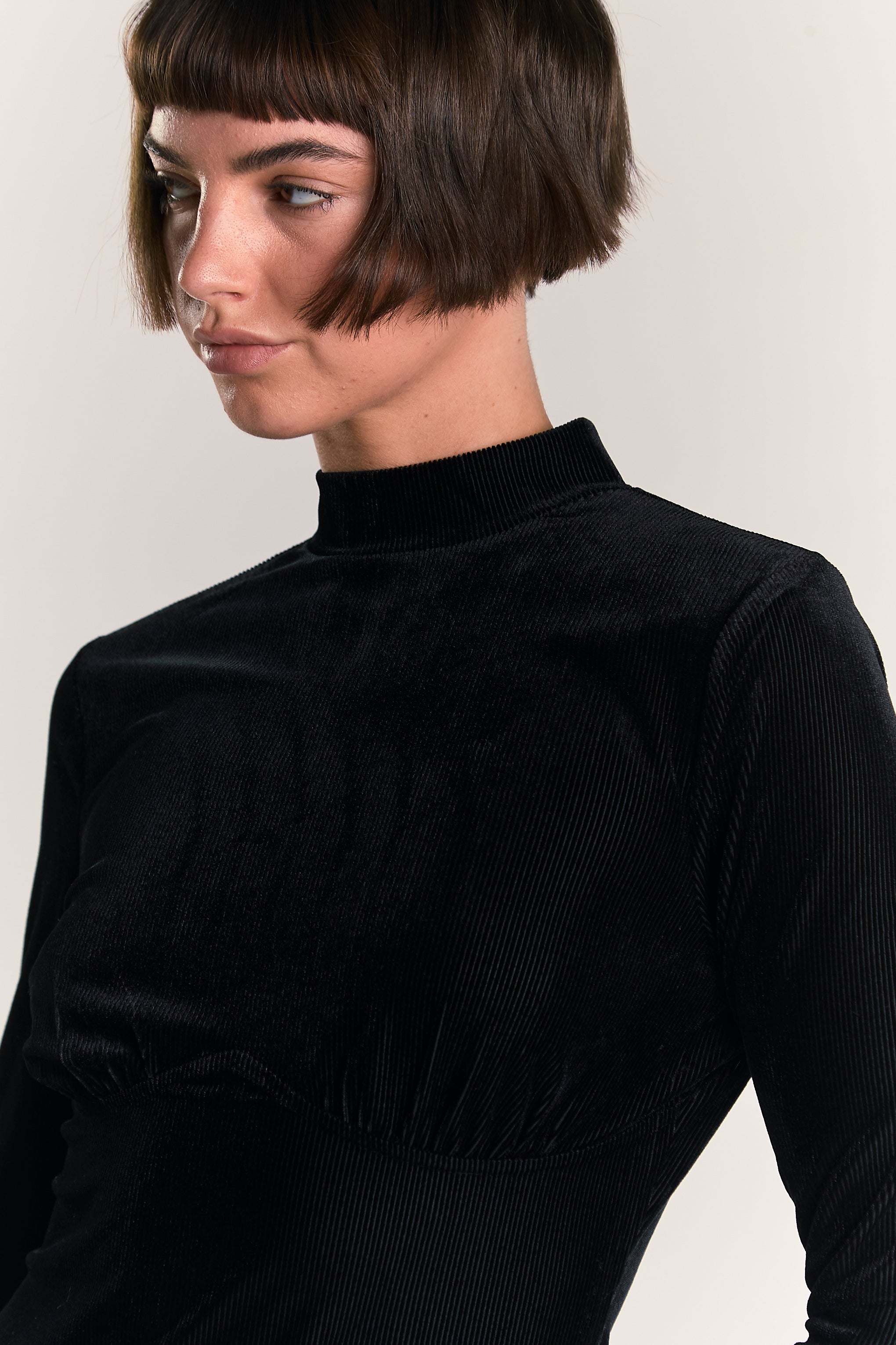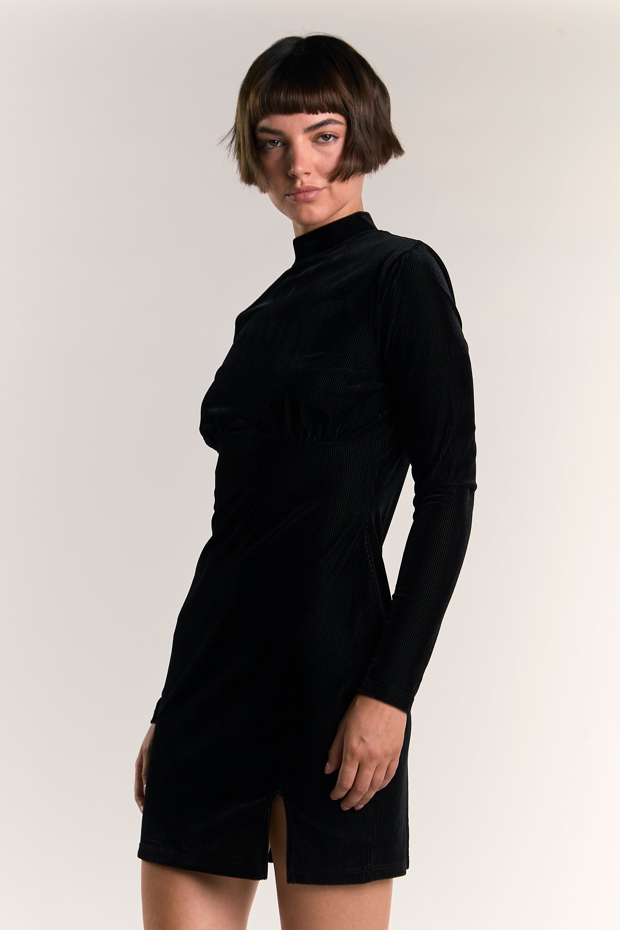 Glamorous Women’s Black Velvet-Rib High-Neck Mini-Dress. This cozy black velvet rib high neck mini-dress is perfect for those chilly evenings when you want to feel both snug and stylish. The soft, touchable fabric hugs your curves in all the right places, while the high neck adds a touch of elegance and warmth. A front side split gives you freedom of movement and adds a flirty flair to your look. The dress's velvet finish catches the light beautifully, giving you a subtle glow as you move. For easy wear, there's a convenient neck fastening that lets you slip it on and off without a fuss. This versatile piece can be dressed up with heels and statement jewellery for a night out, or paired with ankle boots and a leather jacket for a more casual vibe. It's a go-to dress that'll have you feeling confident and comfortable, no matter the occasion.