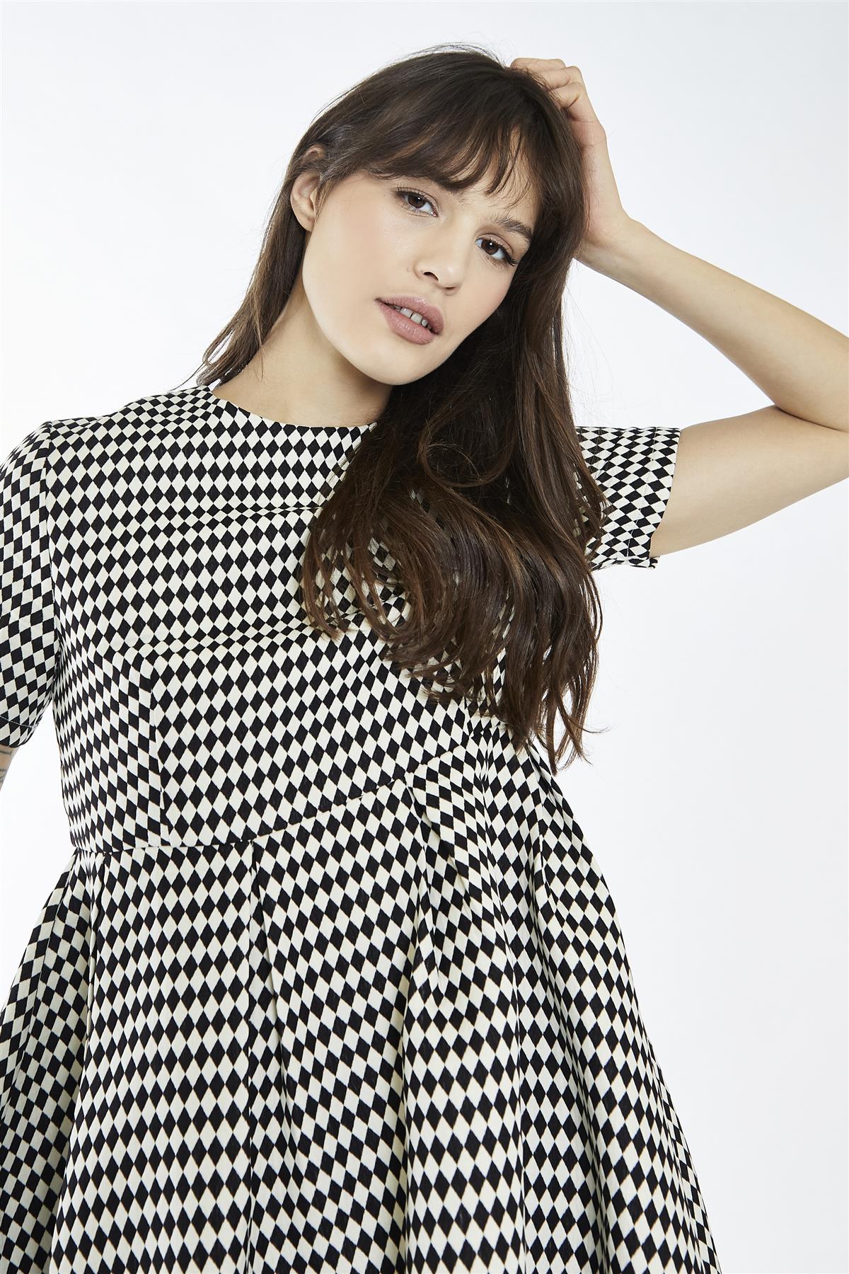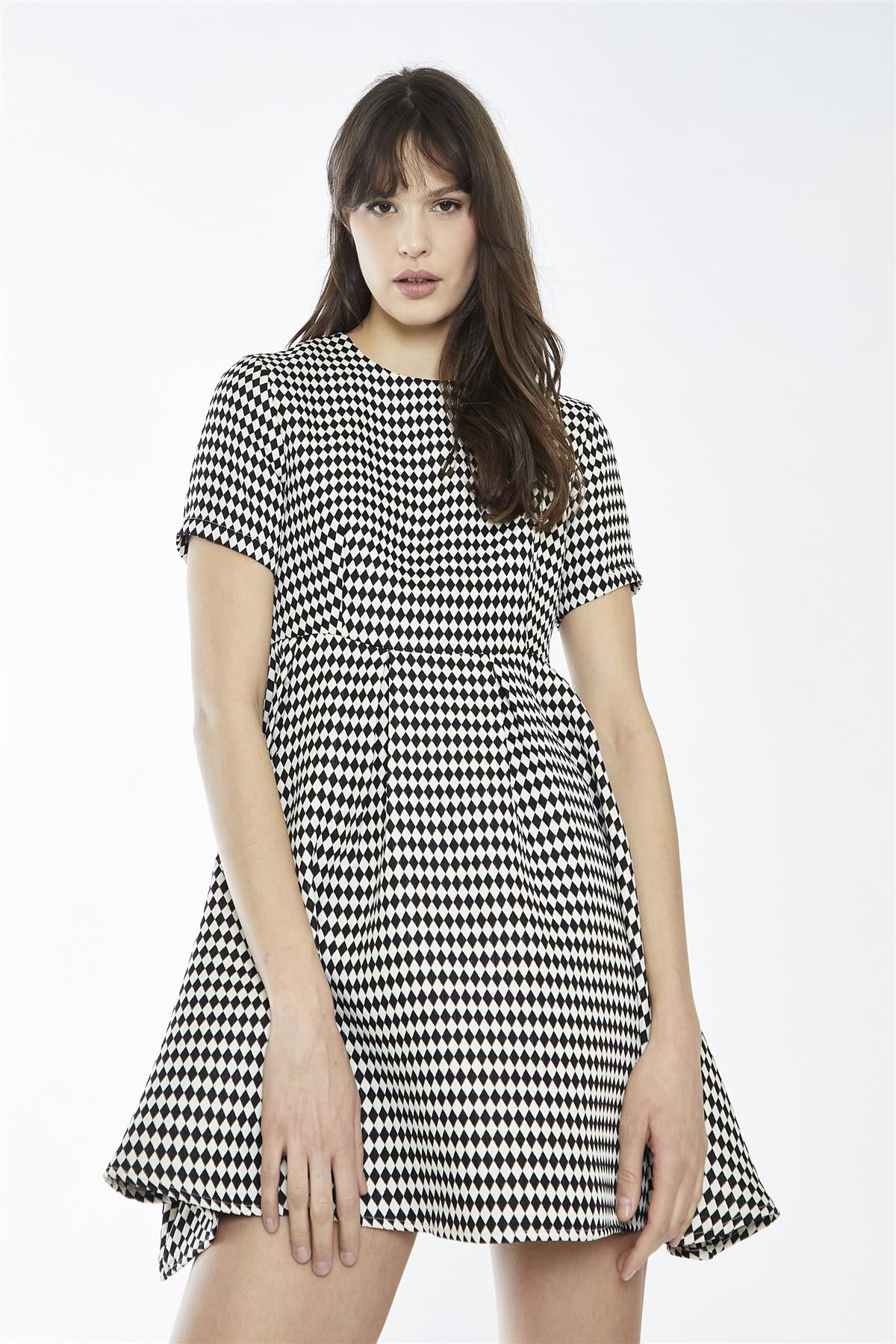 Black-White Diamond Crew-Neck Skater Mini-Dress