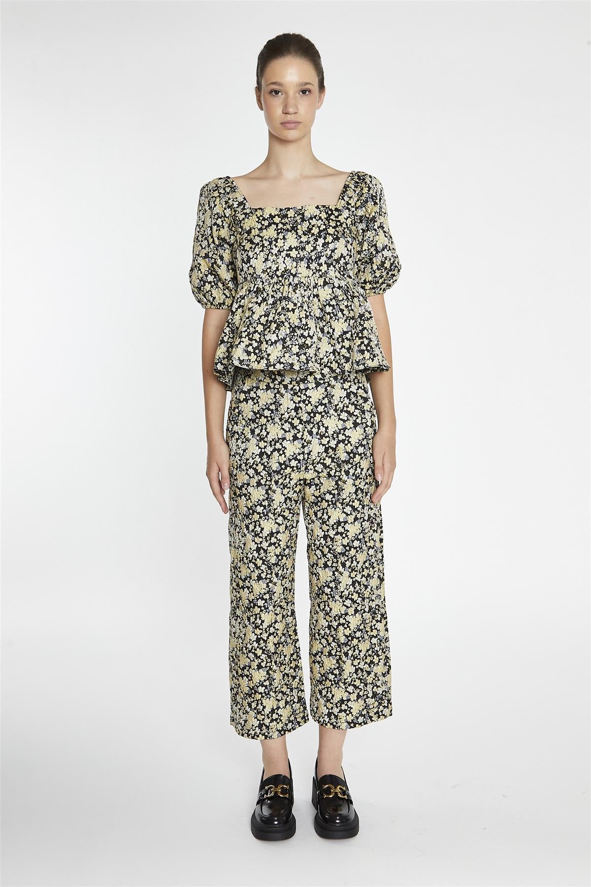 Glamorous Women's Black-Yellow Brocade Square-Neck Peplum-Top. Bring a touch of elegance to your wardrobe with our Black-Yellow Brocade Square-Neck Peplum Top. This stunning piece combines classic charm with modern flair. The rich brocade fabric, featuring a striking black and yellow pattern, adds a luxurious feel to any outfit. The square neckline frames your face beautifully, while the puff sleeves add a romantic touch. The peplum hem creates a flattering silhouette, accentuating your waist and adding a bit of playful movement. It's the perfect top for those occasions when you want to feel a little extra special. Pair it with the matching trousers for a coordinated look that's sure to turn heads, or dress it down with your favourite jeans for a more casual vibe. This versatile top is a true wardrobe gem, ready to take you from day to night with effortless style..