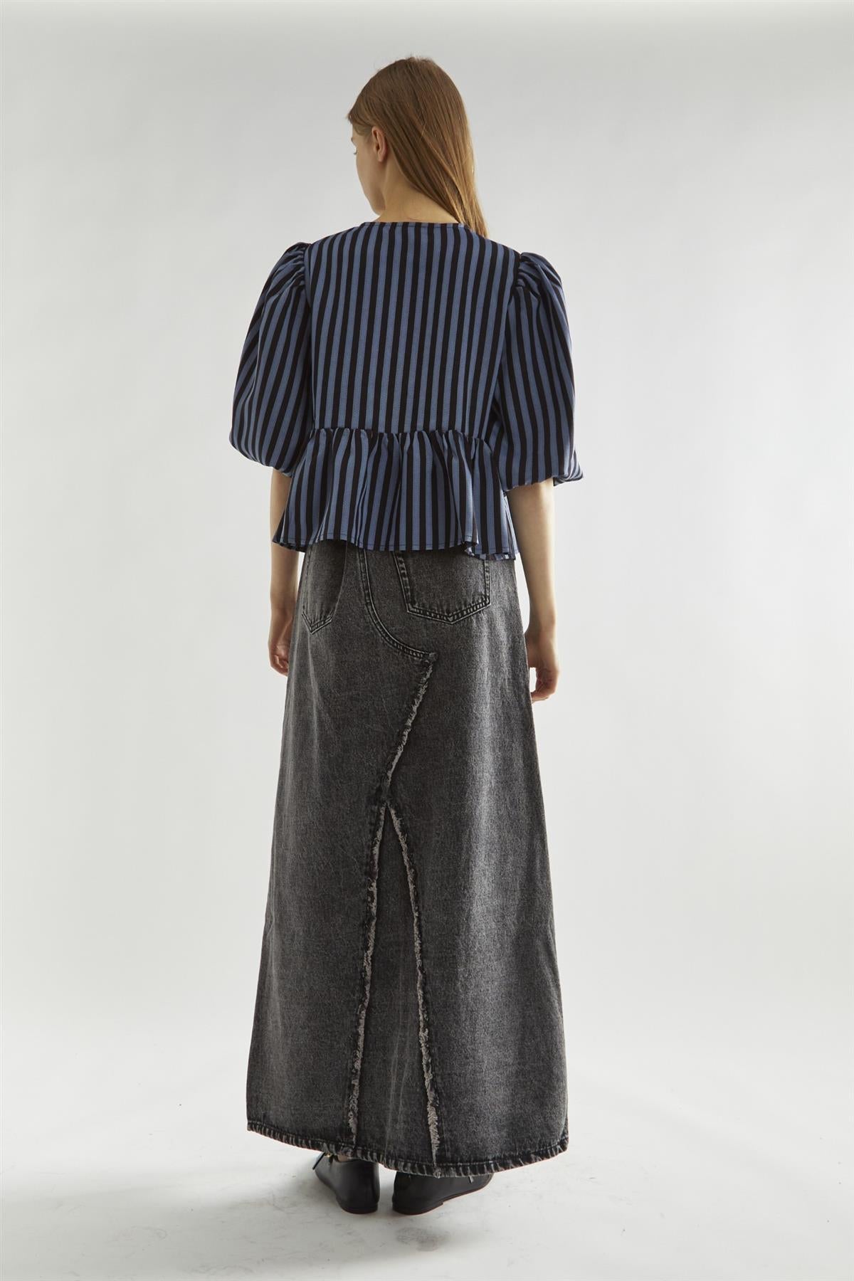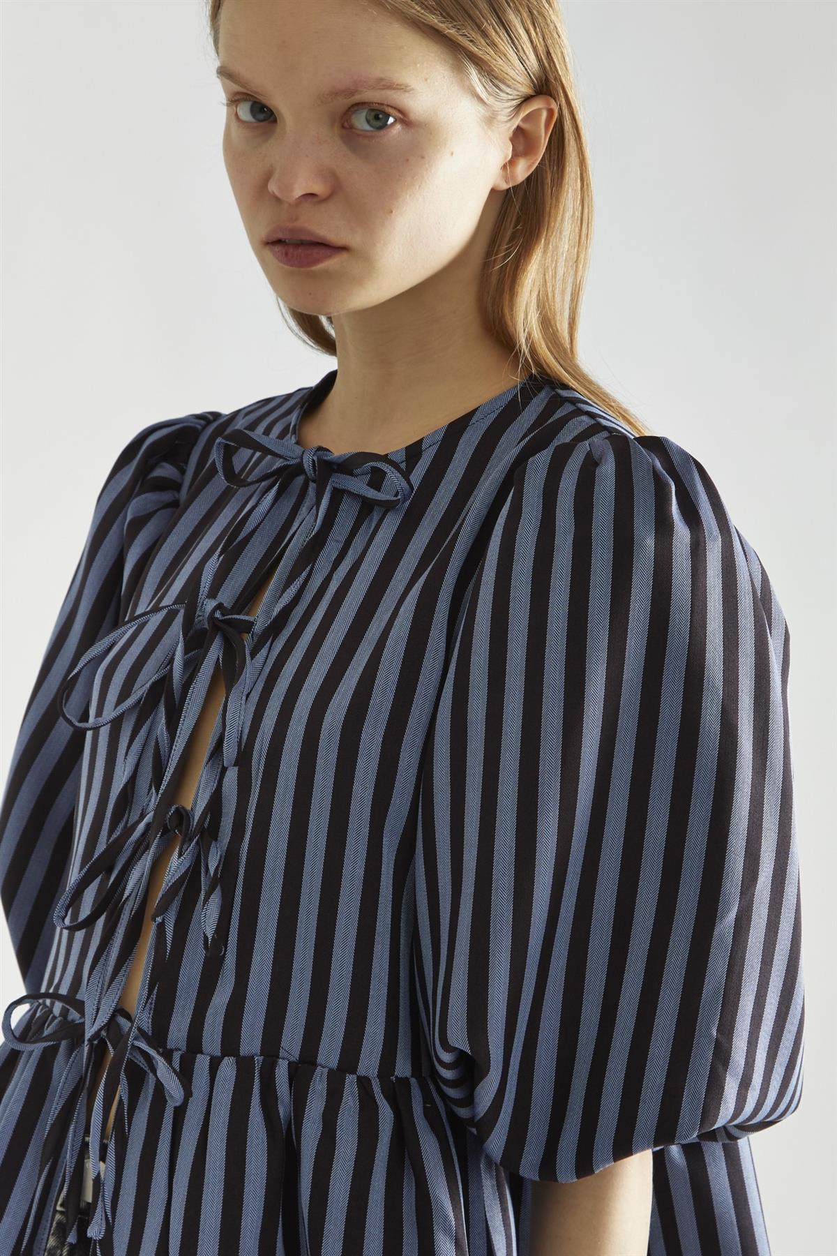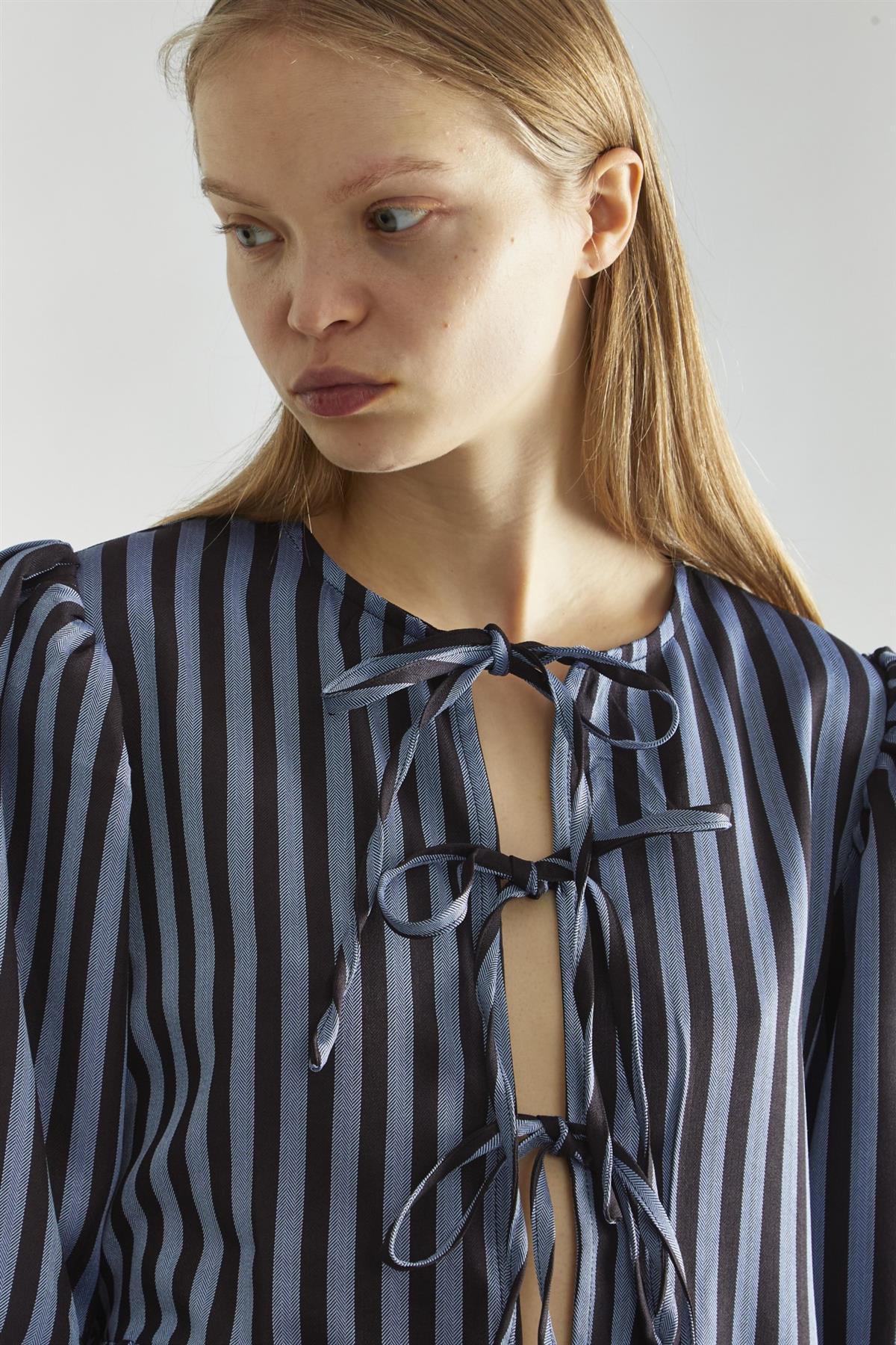 Glamorous Women's Blue-Black Stripe Tie-Front -Top. Add a playful touch to your wardrobe with this blue-black stripe tie-front top, a perfect blend of style and comfort. The eye-catching stripes create a dynamic look, while the tie-front detail allows you to adjust the fit to your liking, adding a flattering shape. The gathered peplum design adds a fun flair, making it easy to pair with your favourite jeans or a sleek skirt for a polished look. Oversized puff sleeves bring a trendy vibe, ensuring you stand out in any crowd. This top is versatile enough for a casual brunch or a night out with friends. Layer it under a fitted blazer for a chic office outfit, or wear it with high-waisted trousers for an effortlessly stylish ensemble. With this top in your collection, you’ll feel confident and ready to express your unique style every day!