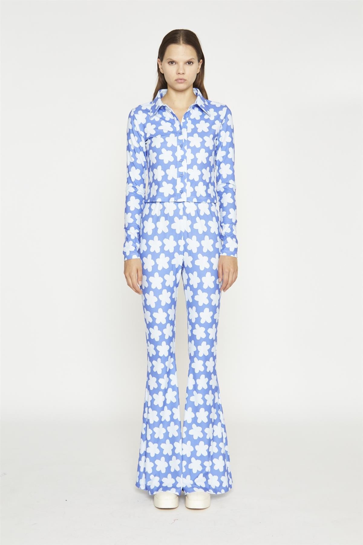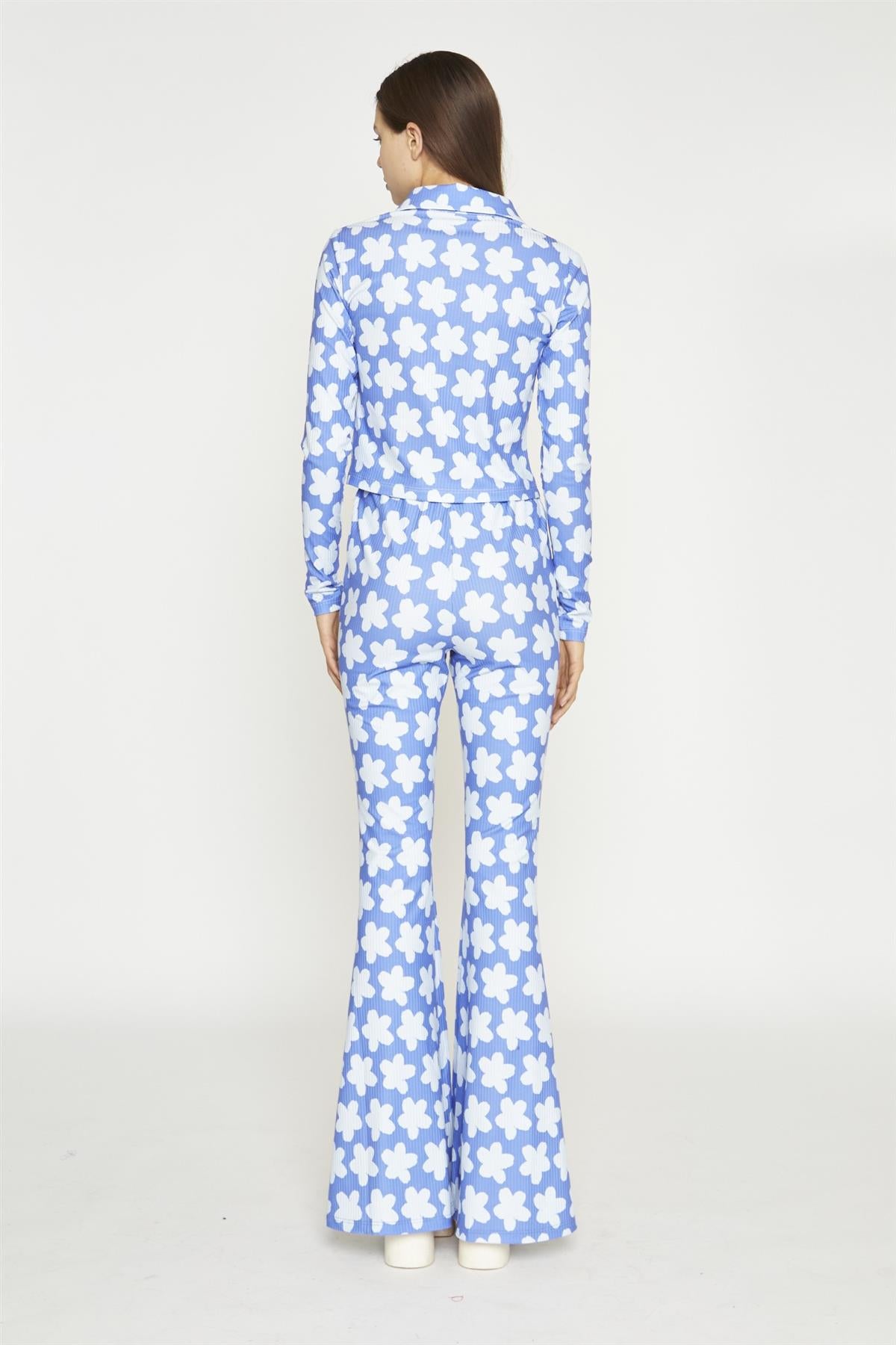 Glamorous Women's Blue-Large Flower Long-Sleeve Skinny-Fit-Shirt. Looking for a shirt that's both comfy and stylish? Our Blue Large Flower Long-Sleeve Skinny-Fit Shirt might be just what you need. This eye-catching piece features a bold floral print that's sure to turn heads. Made from soft, ribbed jersey material, it feels great against your skin and moves with you throughout the day. The skinny fit hugs your body in all the right places, creating a sleek silhouette. With its button-front design and collar, you can easily dress it up or down. The long sleeves make it perfect for cooler days or air-conditioned offices. For a complete look, pair it with the matching trousers - they're designed to complement the shirt perfectly. This versatile shirt is a great addition to any wardrobe, offering both comfort and style in one package..