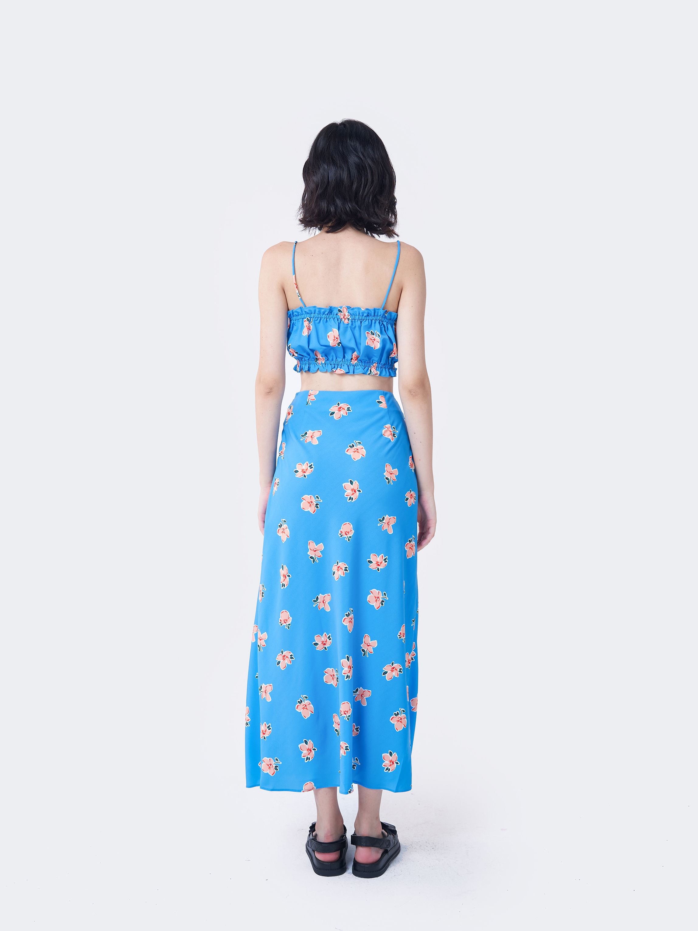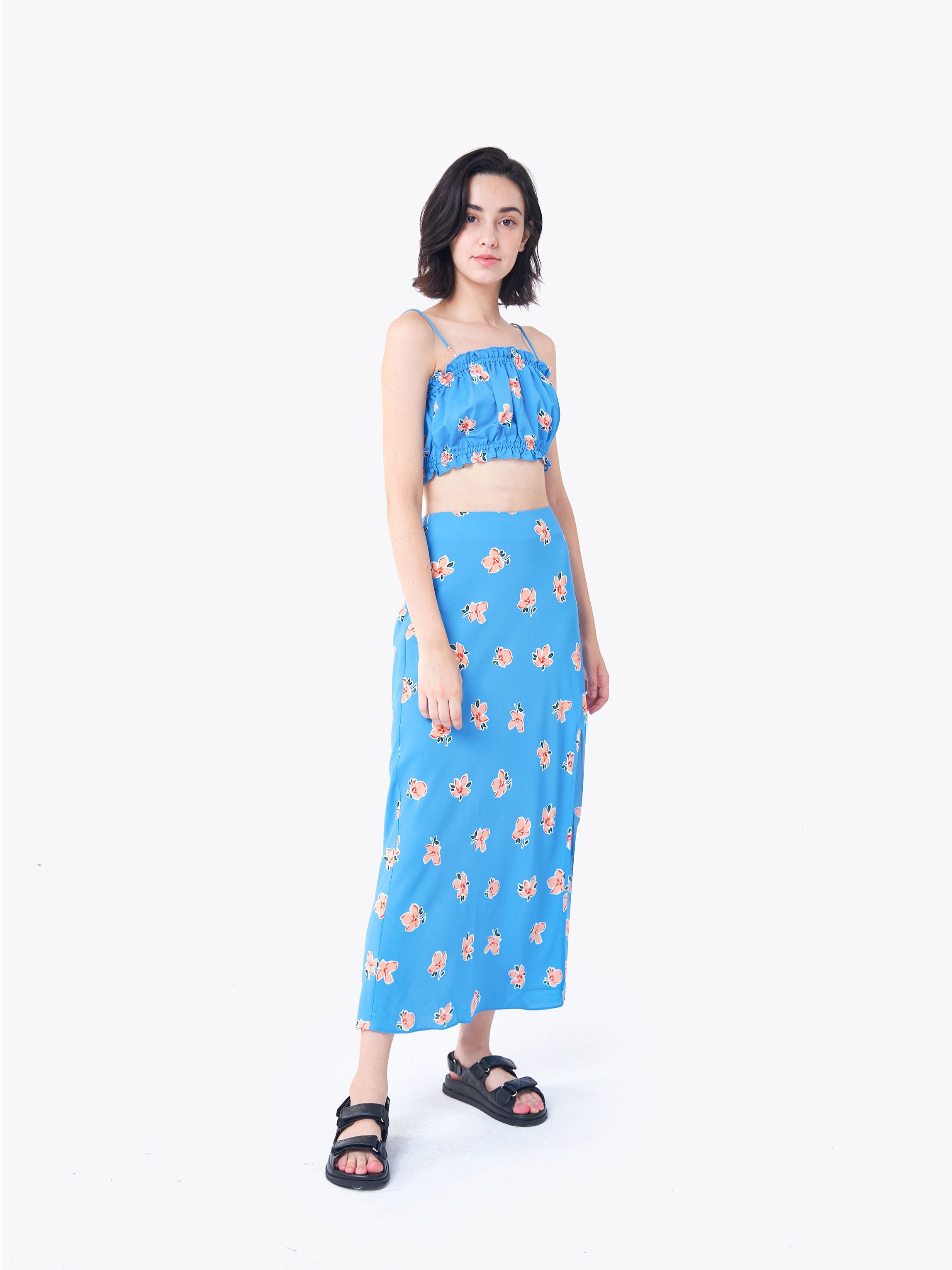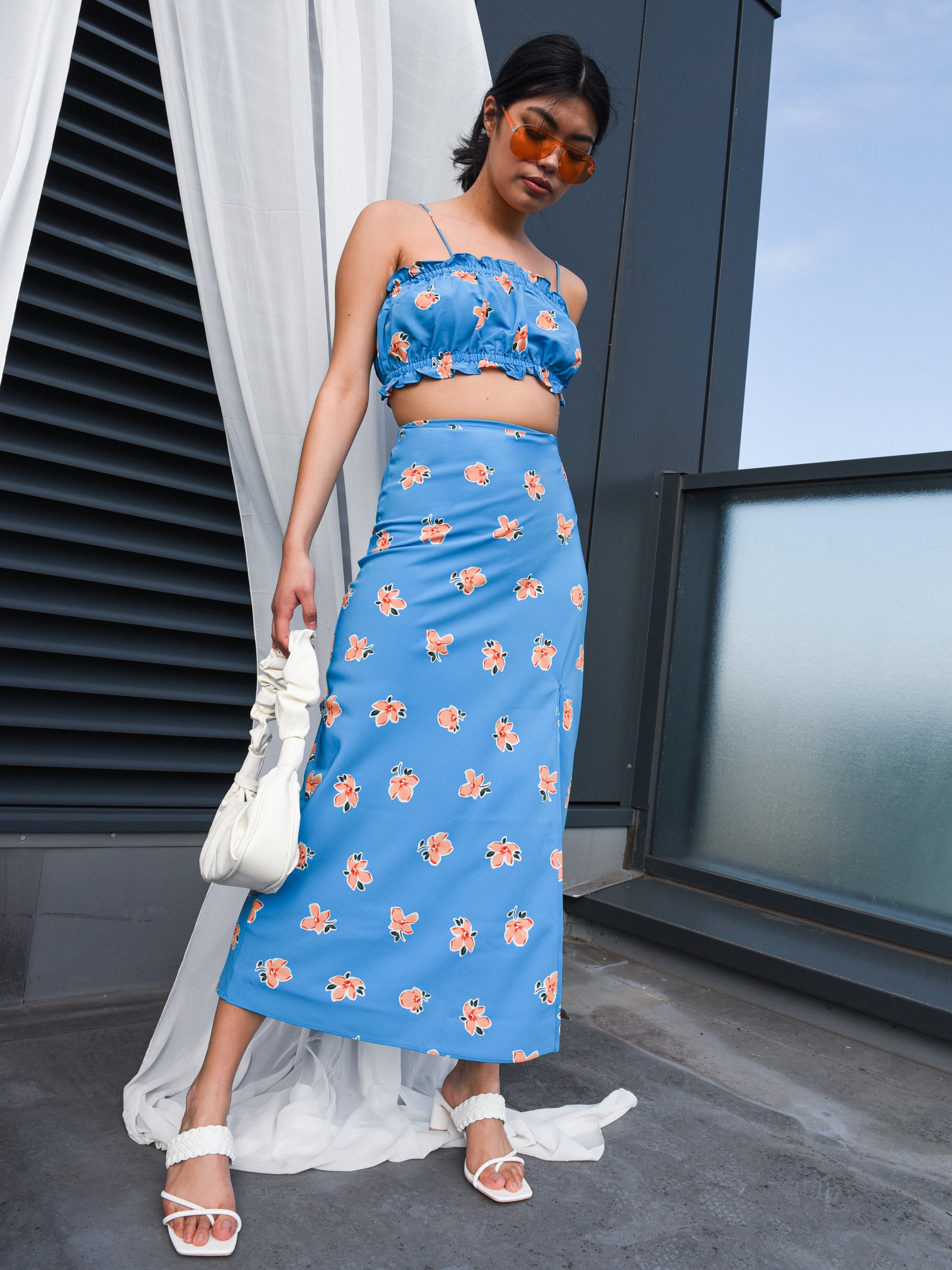 Glamorous Care Blue Orange Floral Midi Skirt. Opt for a sustainable style with this floral midi skirt this season. Stylish and chic this skirt is perfect for the summer. Featuring an on trend pattern and flattering length. Pair with a white crop top and some mule sandals for the ultimate look.