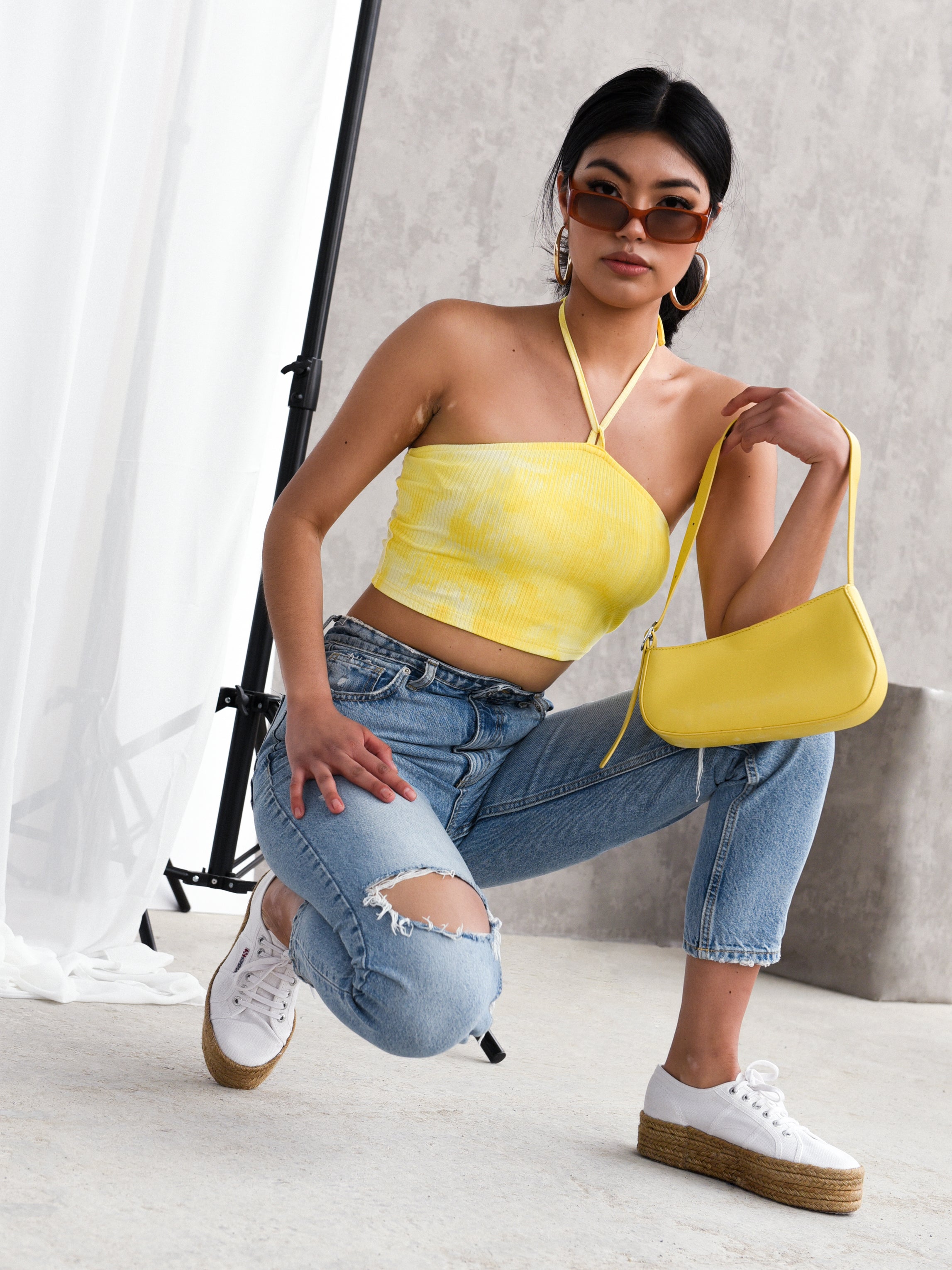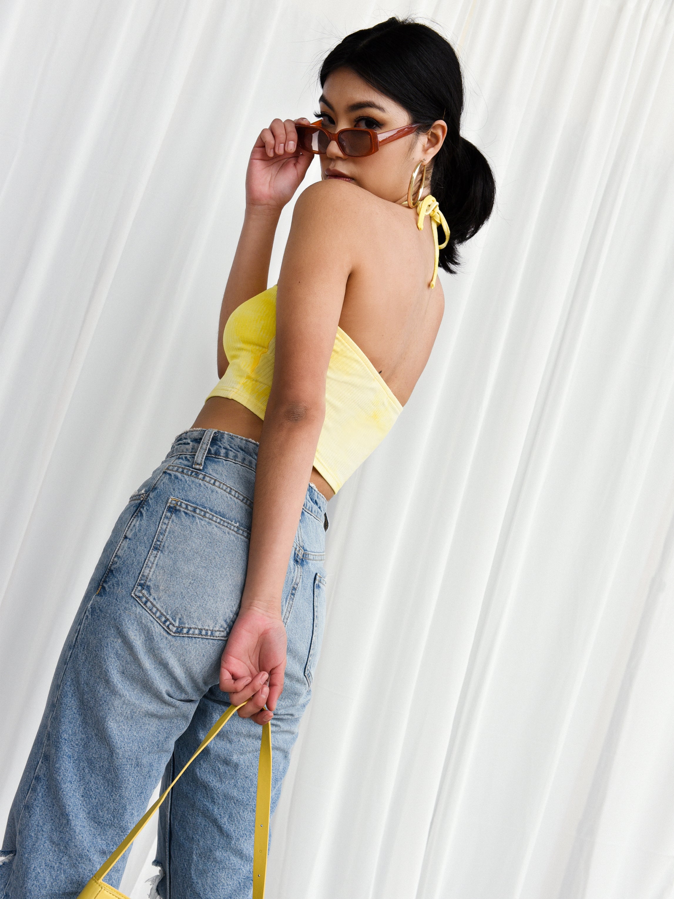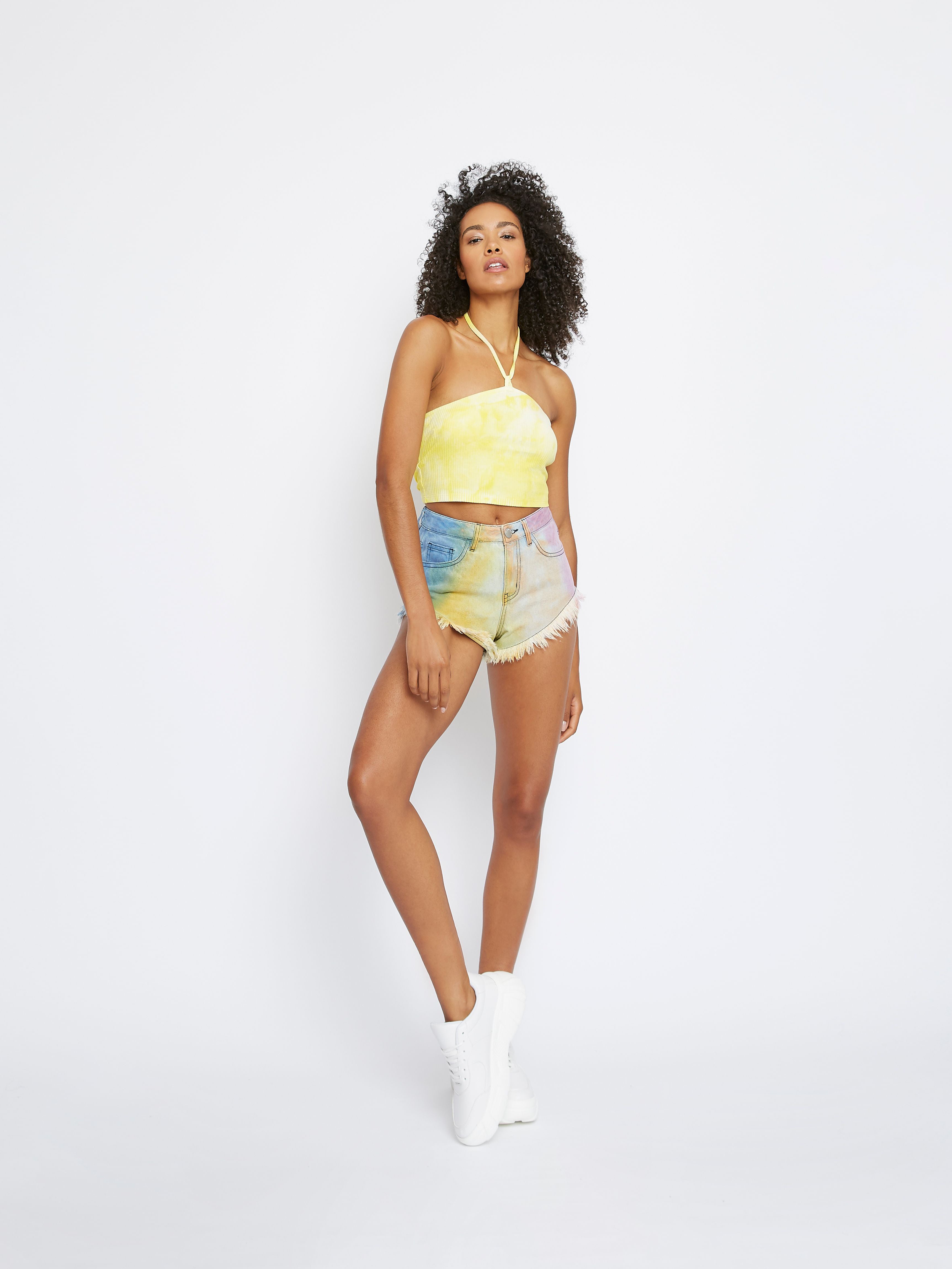 Glamorous Womens Yellow Tie Dye Halter Neck Crop Top. This is the perfect addition to your summer wardrobe this year. On trend with a luxe feel this tie dye crop top will be your best-friend. Featuring a tie neck detail and fun tie dye pattern, this body suit will look great with high waisted denim jeans and mule heels for the ultimate look.