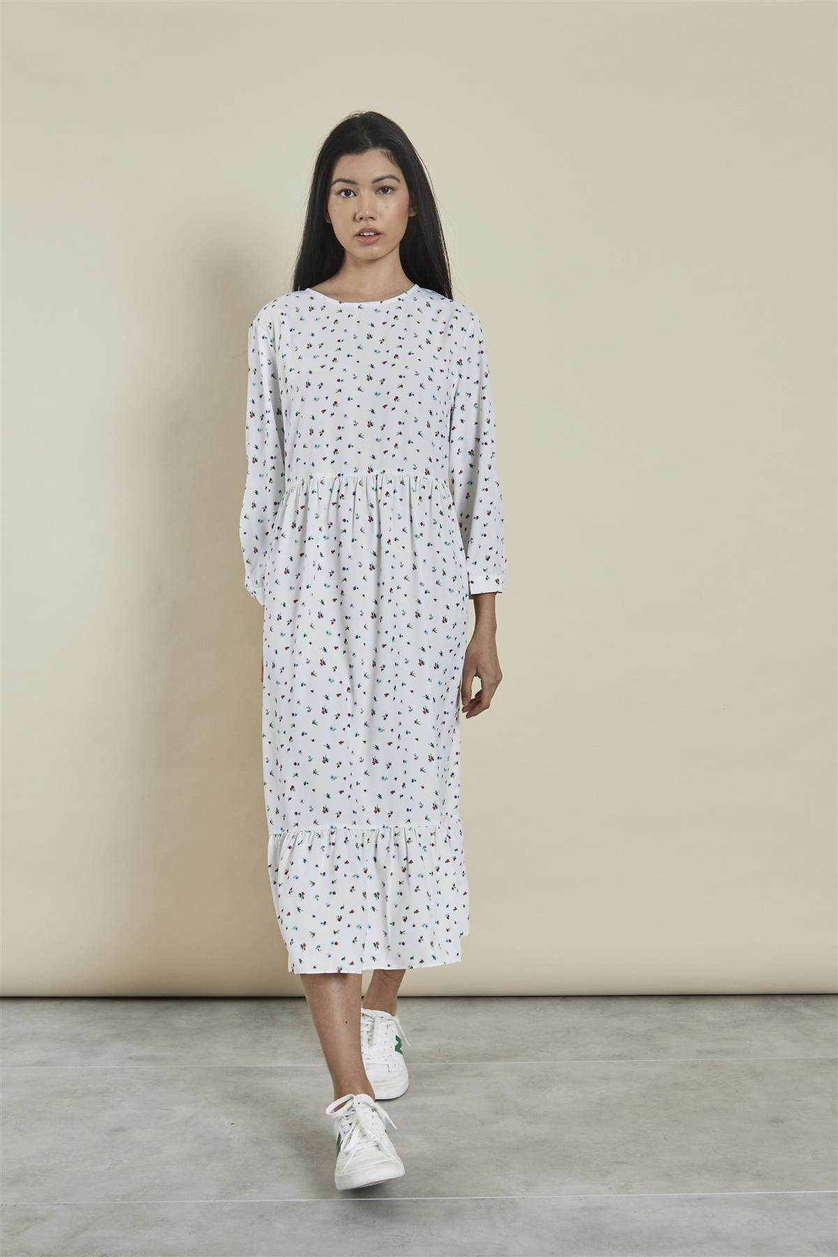 Glamorous Women's Bright-Ditsy Shift Midi-Dress. Embrace the carefree spirit of the season with this charming shift midi-dress. Adorned in a vibrant ditsy floral print, this dress exudes a sense of youthful sophistication. The classic crew neckline and long sleeves lend a timeless elegance, while the gathered peplum hem adds a touch of playful movement. The loose, shift silhouette creates a flattering, comfortable fit, perfect for all-day wear. Whether you're strolling through a bustling market or enjoying a leisurely brunch, this midi-dress will have you feeling confident and stylish. Pair it with sleek flats and delicate accessories for a look that's effortlessly chic