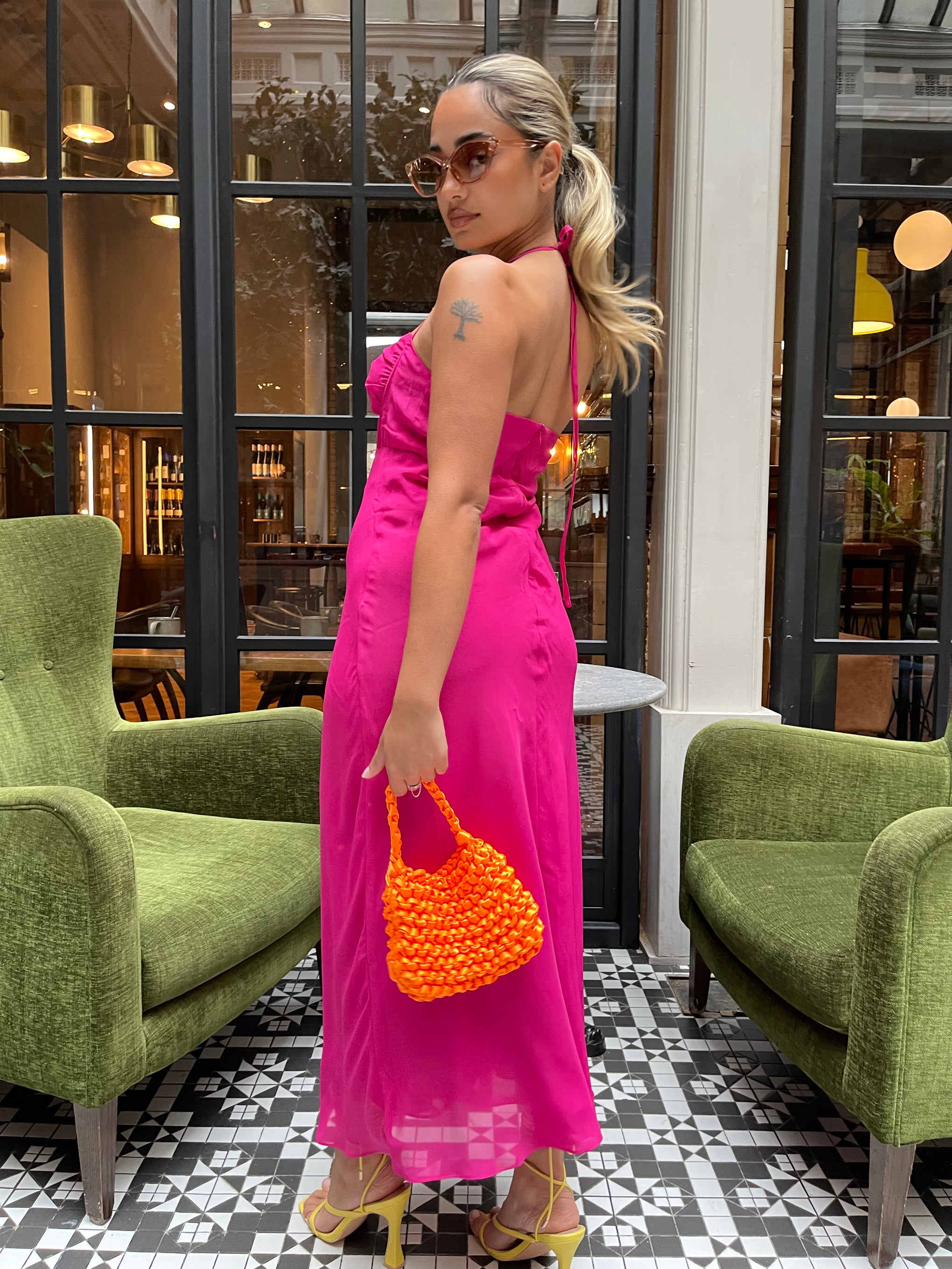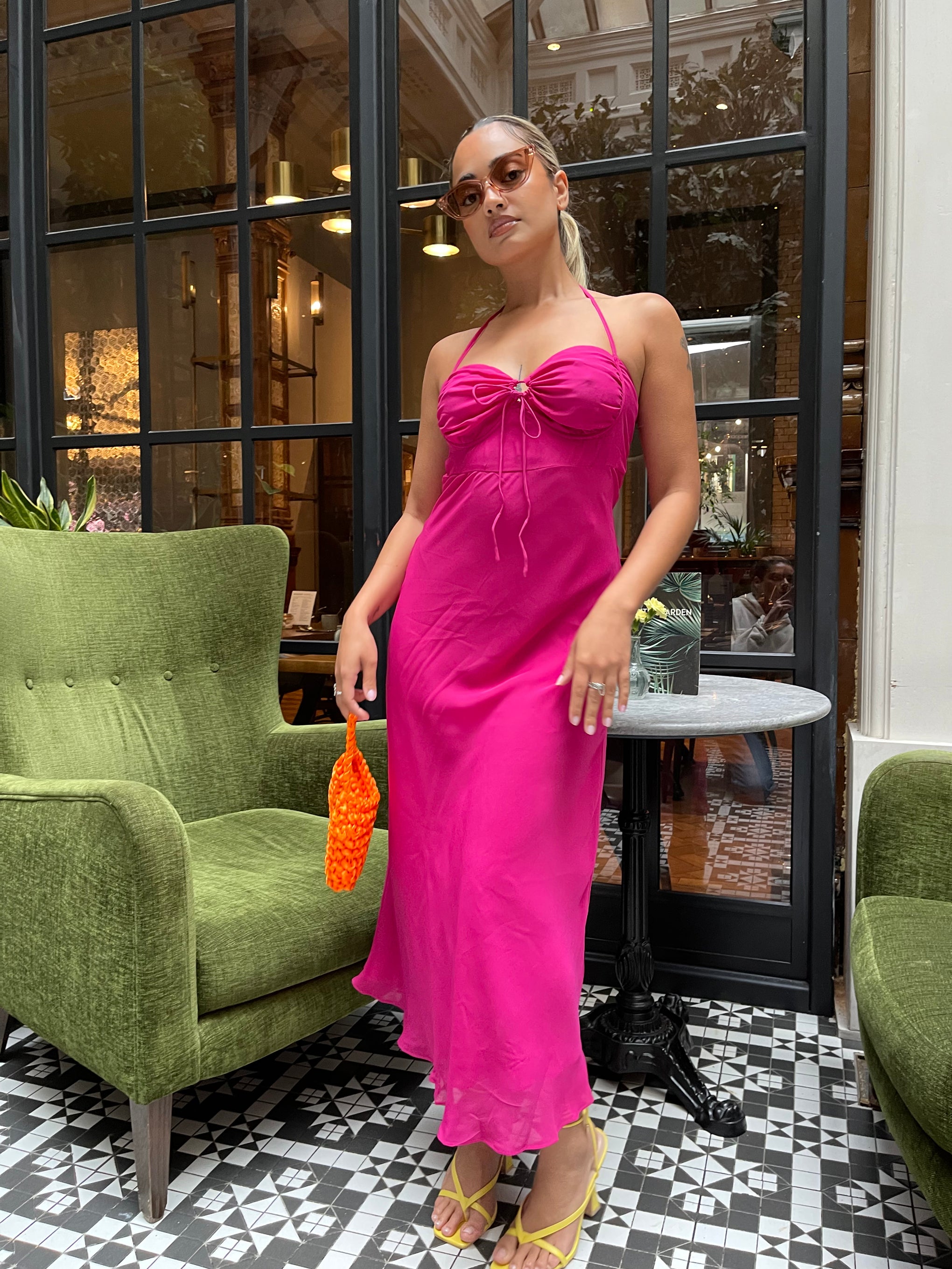Glamorous Care Women's Bright-Pink Gathered-Bust Halterneck Midaxi-Dress. Keep the focus on you with this stunning halter neck midaxi-dress in bright pink. The empire line design, bias cut skirt, and gathered keyhole bust detail will leave you feeling confident and looking fabulous. Part of the Glamorous Care Sustainable Range, this dress is both stylish and environmentally friendly. You'll look glamorous and feel good about your fashion choices with this sustainable midaxi-dress.