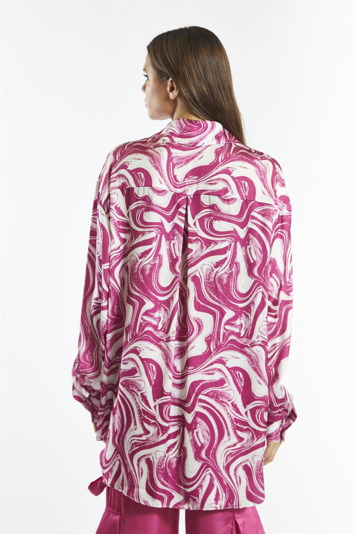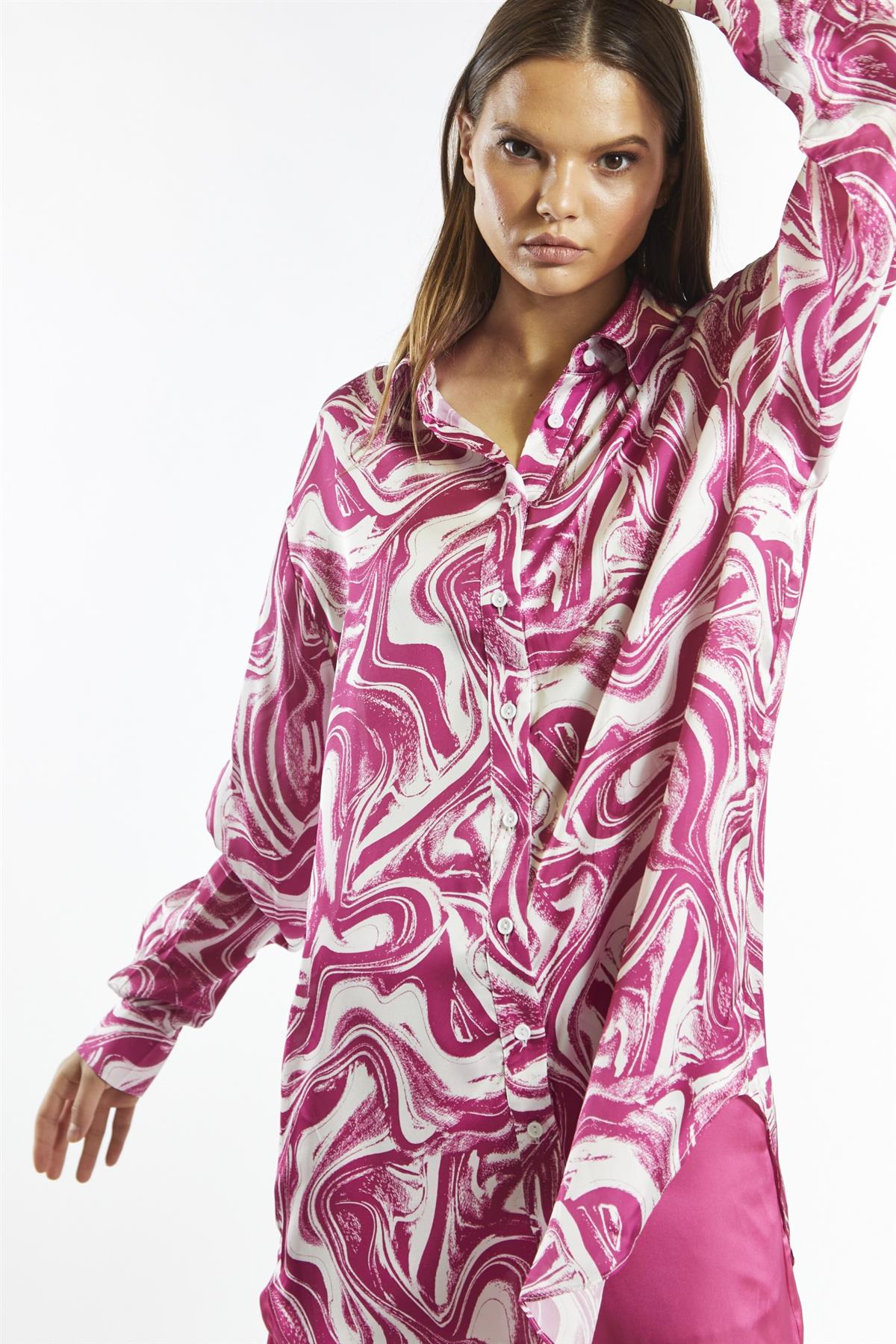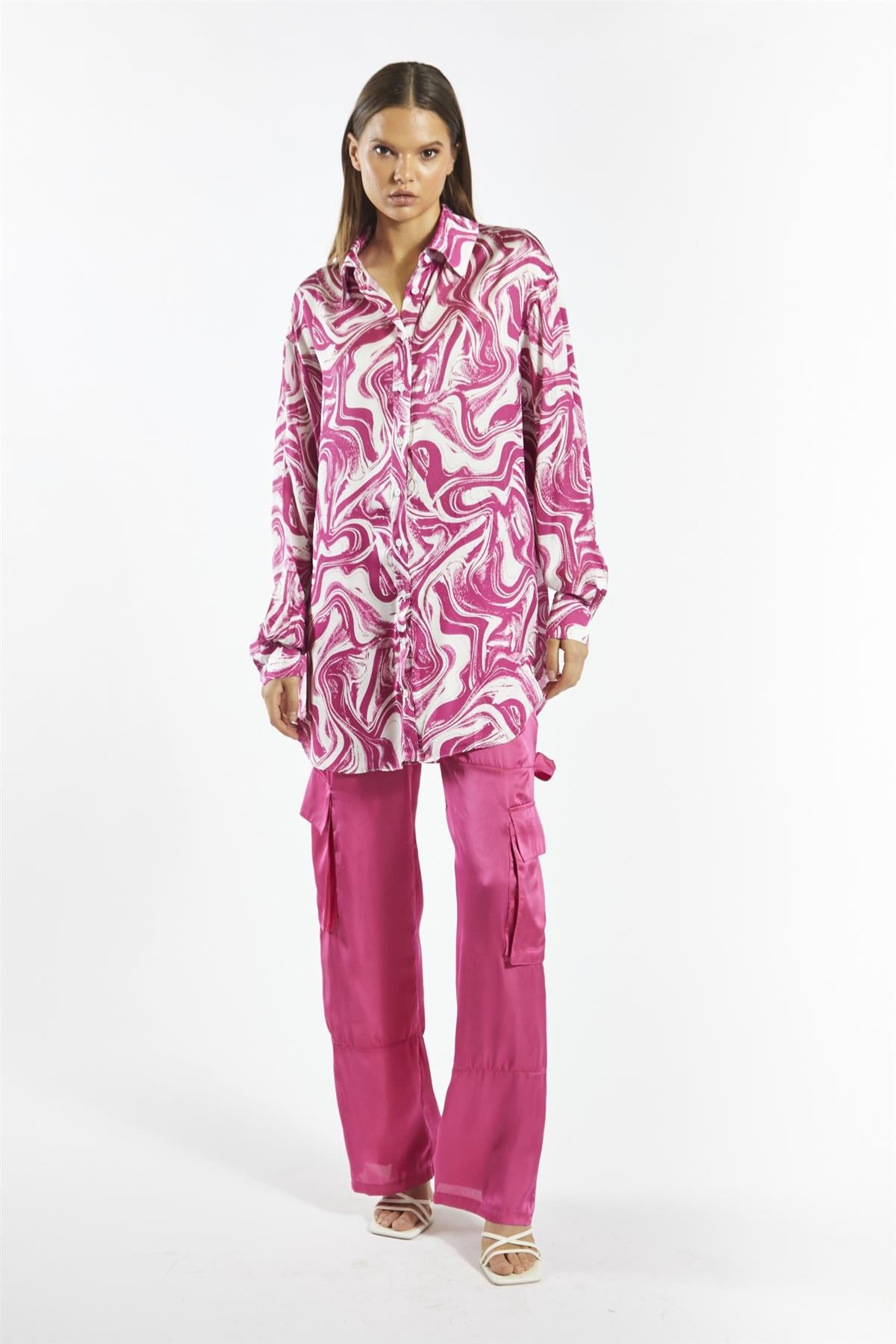 Glamorous Care Women's Bright-Pink Marble Oversized-Shirt. Make a statement in this bright-pink marble print oversized shirt. The recycled polyester fabric is not only eco-friendly but also incredibly soft and comfortable. The oversized fit creates a relaxed, effortless vibe that's perfect for laid-back days. Slip it on over a cami and jeans for a casual weekend look, or tuck it into a mini skirt for a night out. The button front closure allows you to adjust the fit and style to your liking. Pair it with our bright pink Cargo trousers for a trendy ensemble versatile outfit. This chic and eye-catching shirt will quickly become a wardrobe staple.