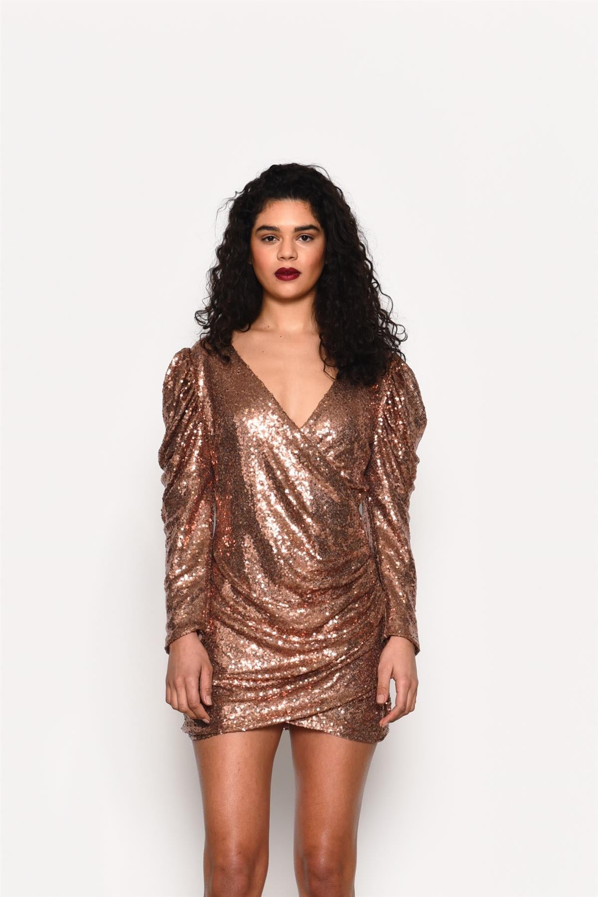 Bronze-Sequin Fixed Wrap Mini-Dress