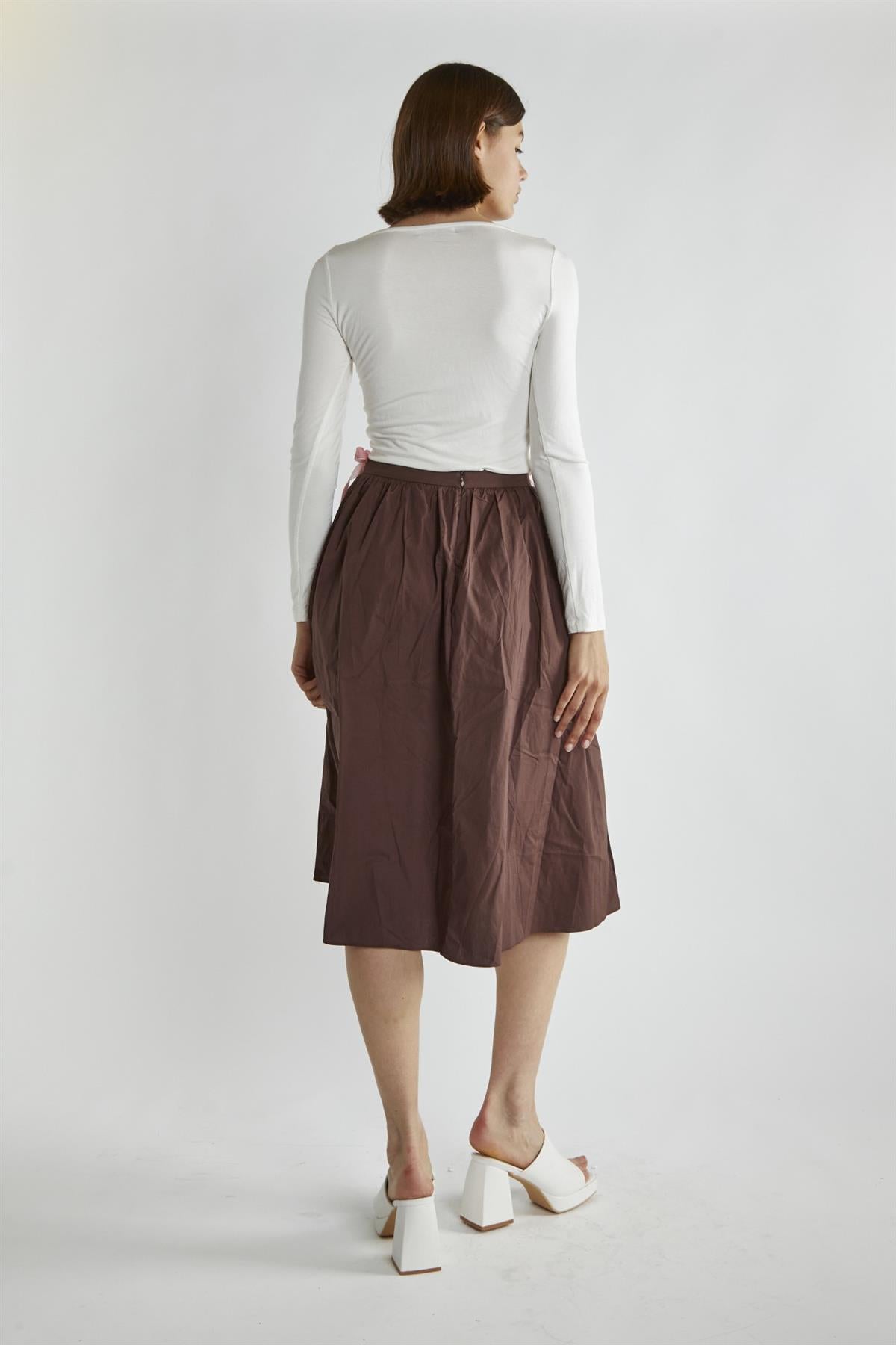 Glamorous Women's Brown Bow-Detail Midi-Skirt. Fall in love with our Brown Bow-Detail Midi-Skirt, a charming piece that brings a touch of whimsy to your wardrobe. This skirt features a classic full silhouette that swishes and sways with every step, creating a graceful and feminine look. The standout element is the delightful bow details at the waist, adding a playful and romantic twist to the design. With its versatile midi length, this skirt is perfect for both office wear and weekend outings. Pair it with a tucked-in blouse for a polished look, or go casual with a simple tee and sneakers. The rich brown hue is ideal for autumn, but works beautifully year-round. This skirt isn't just an item of clothing; it's a mood-lifter that'll have you twirling with joy. It's the kind of piece that makes getting dressed a pleasure, promising to bring a smile to your face every time you wear it..